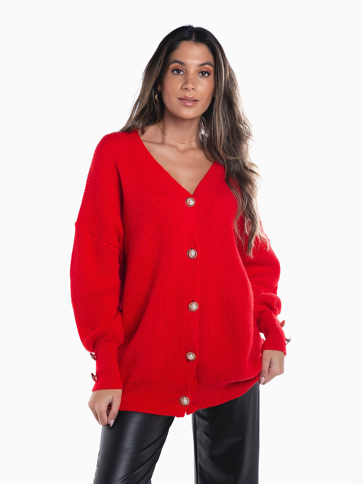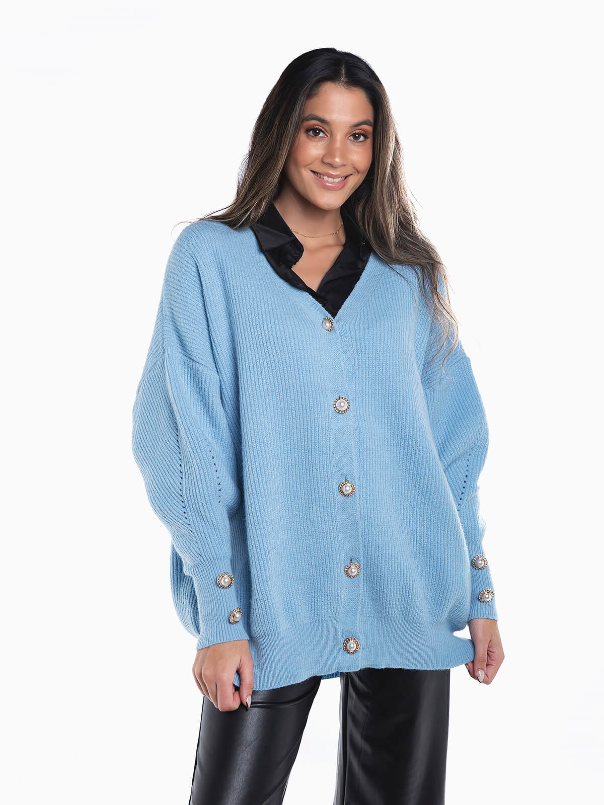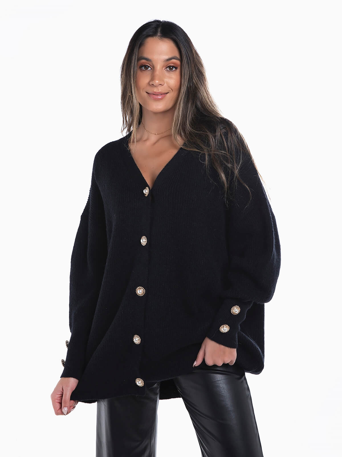 Casaco malha oversize comprido para senhora. Cardigan manga comprida abalonada e decote em bico. Punhos abotoados. Aperto de botões de pérolas.