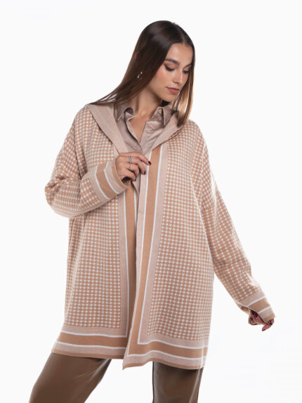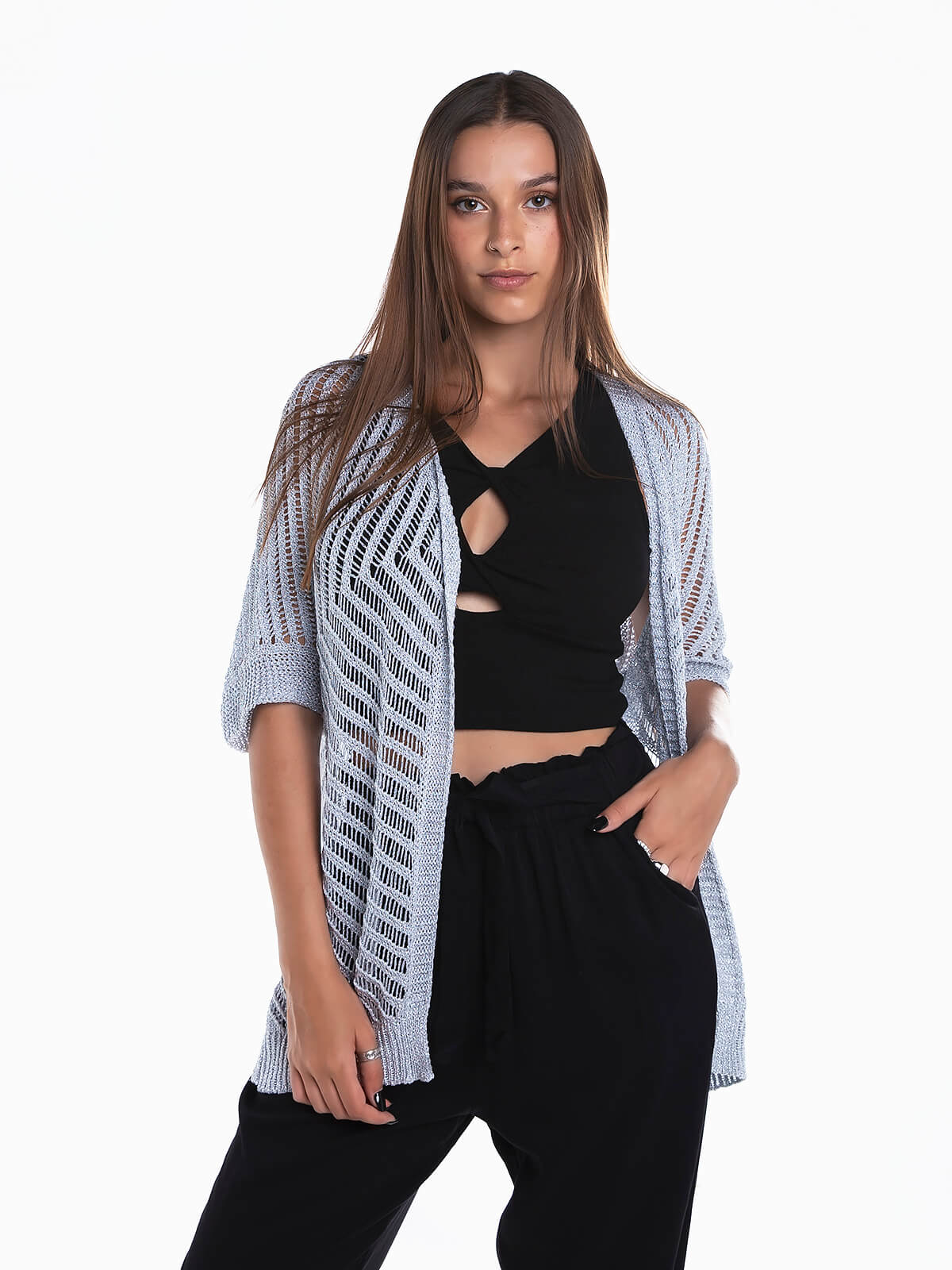 Casaco em malha rendilhada brilhante para senhora. Casaco aberto com manga 3/4.