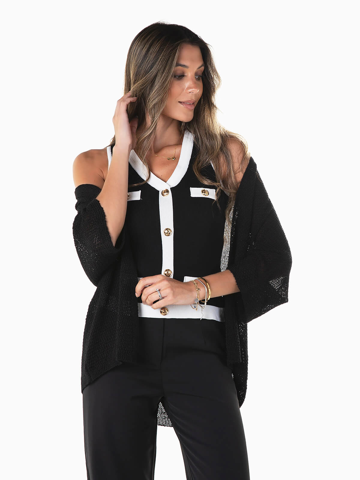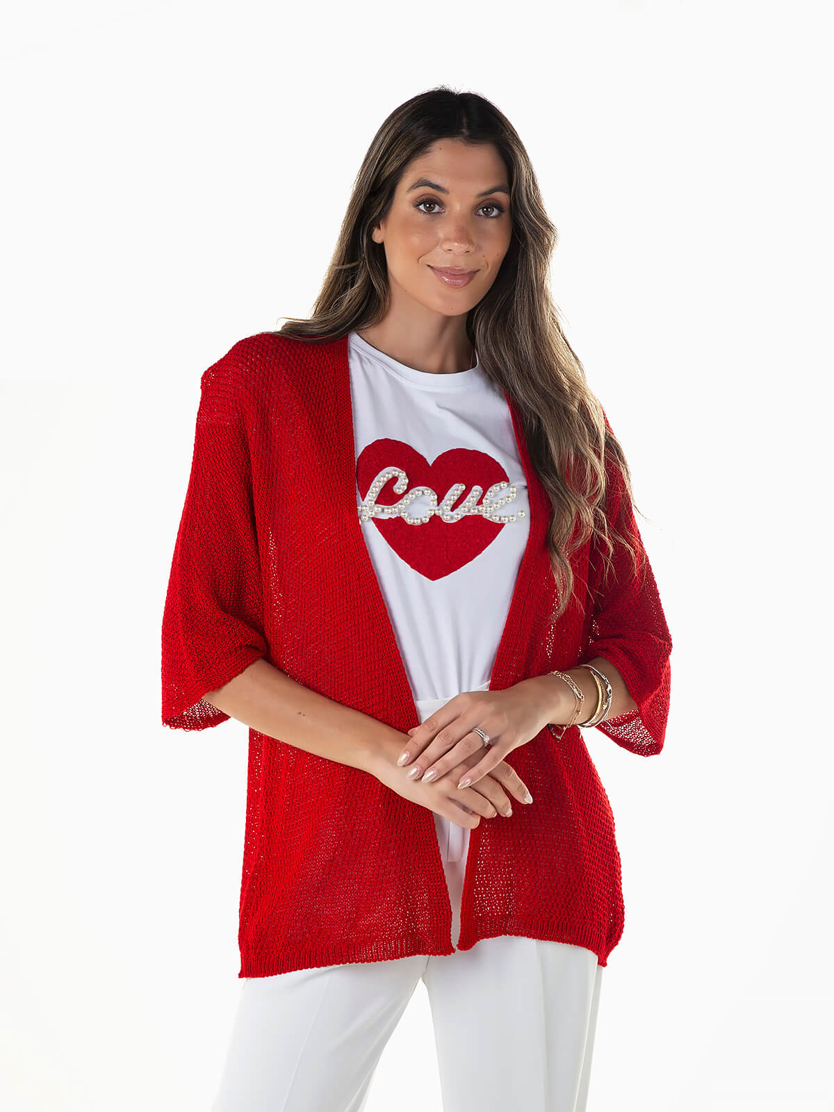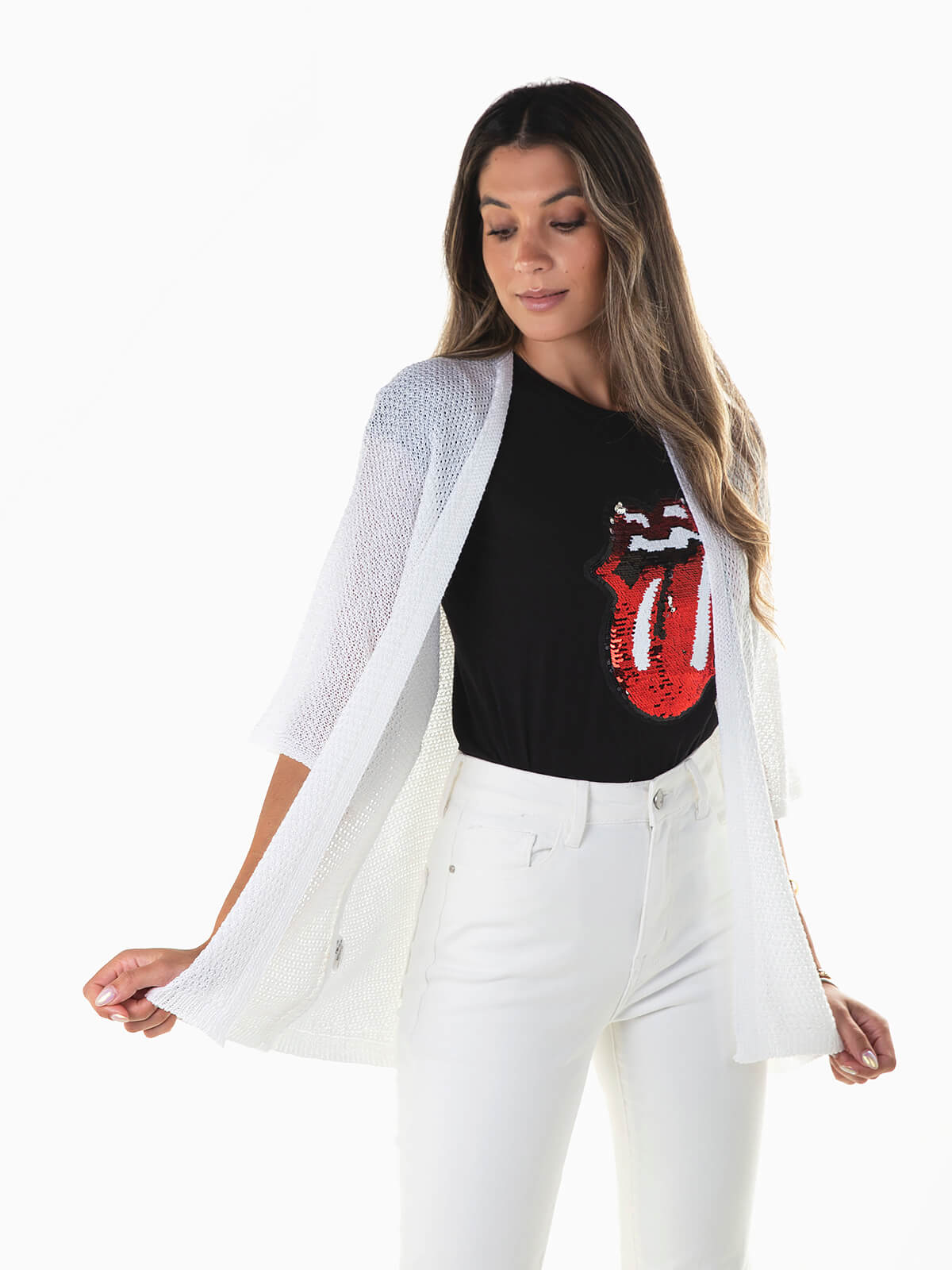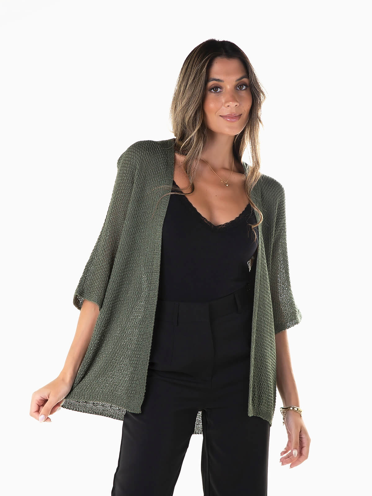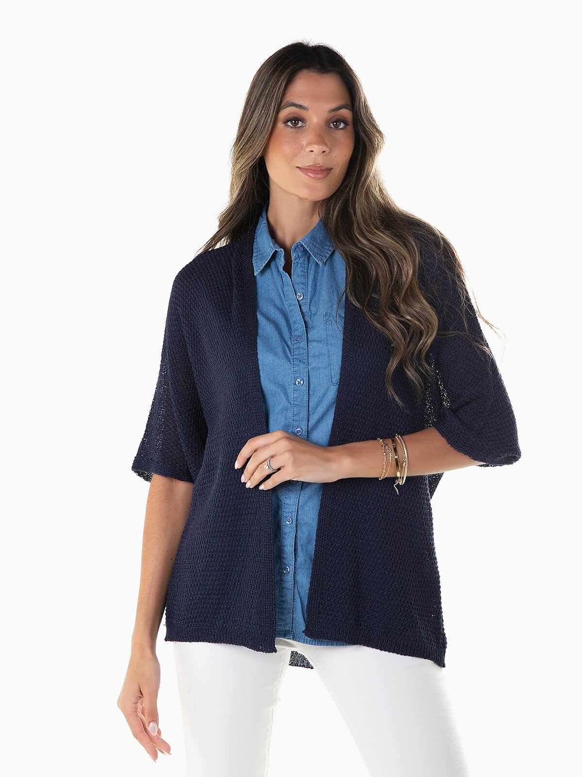 Casaco de malha perfurada com manga 3/4. Cardigan aberto para senhora.