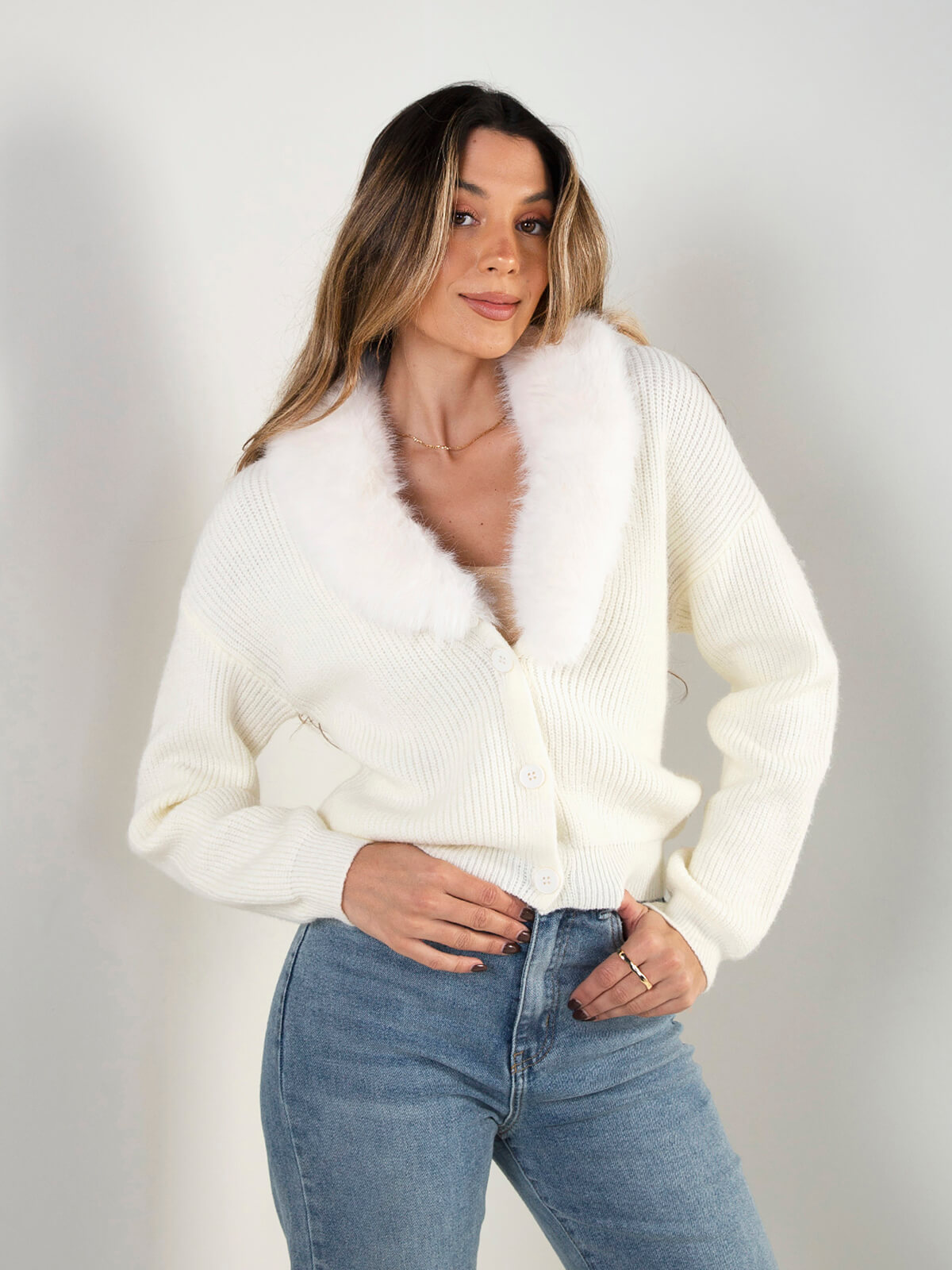 Casaco de malha pérola com decote em V, botões frontais e detalhe de pelo removível. Um modelo elegante e versátil para looks de inverno.