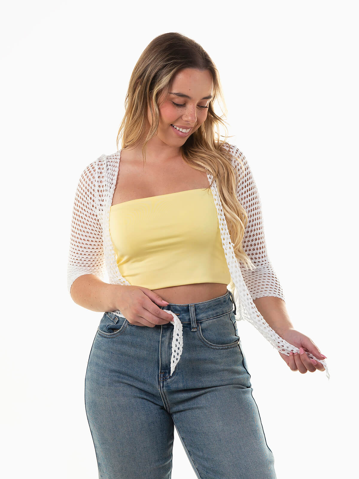 Casaco malha ponto aberto confeccionado em mistura de viscose para maior conforto. Casaco curto com manga 3/4 e aperto frontal de nó. Uma peça ideal para sobrepor nos seus looks de verão.