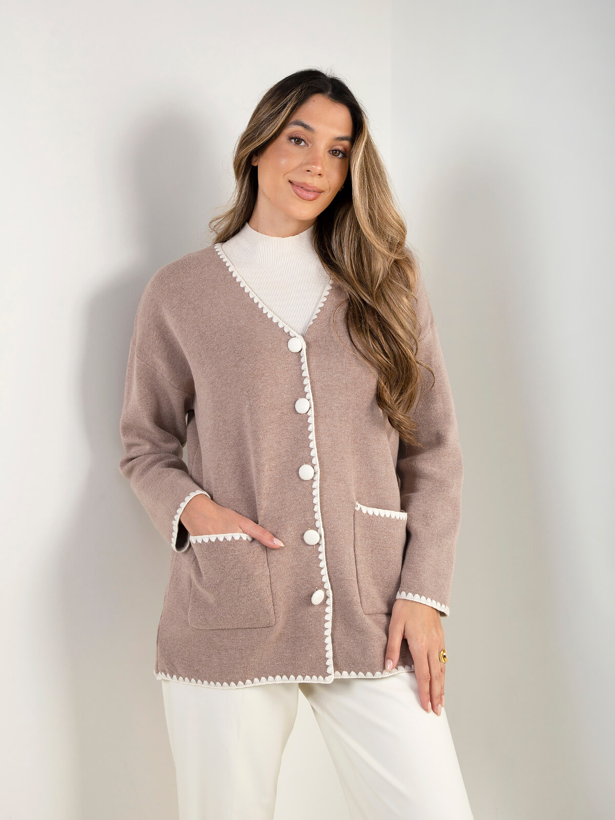 Casaco malha com extremidades em contraste para senhora. Cardigan manga comprida com decote em V e 2 bolsos. Aperto frontal de botões forrados.