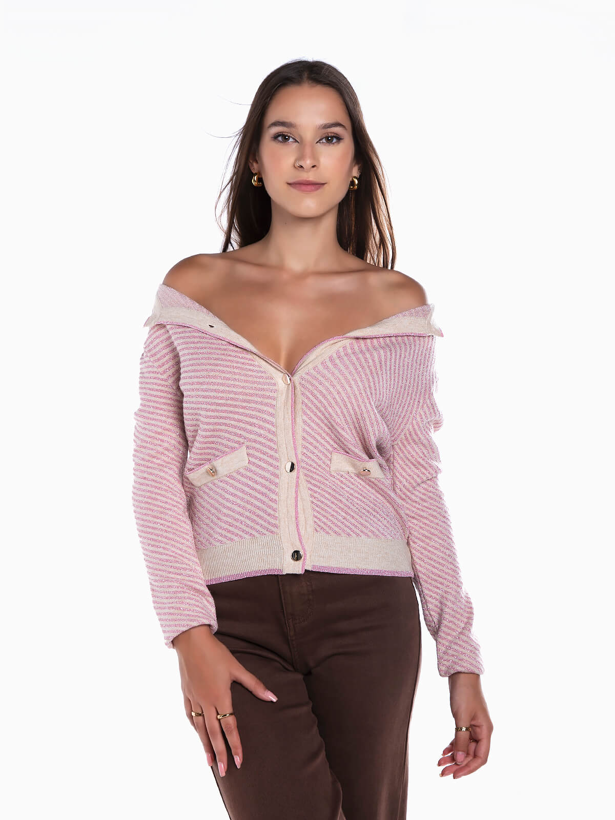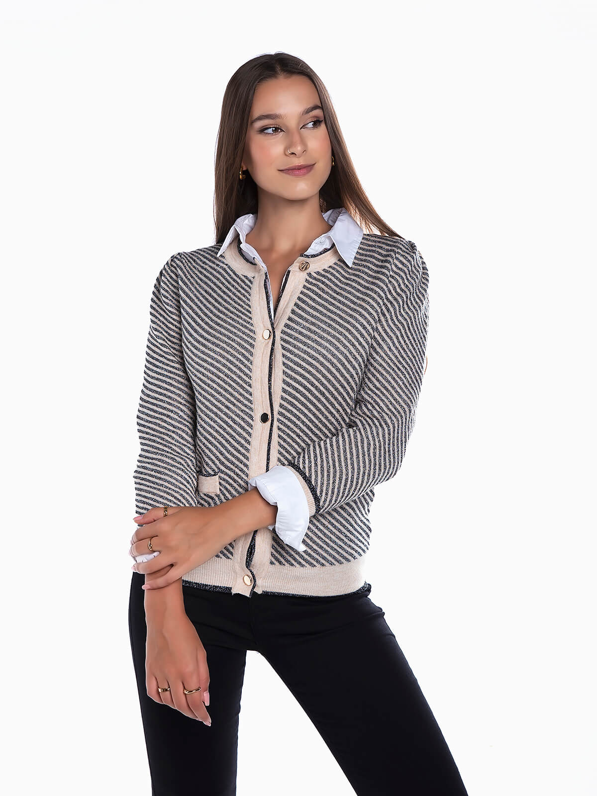 Casaco de malha de riscas com fios lurex para efeito brilhante. Cardigan justo com decote redondo. Manga comprida. 2 bolsos decorativos. Aperto frontal de botões.