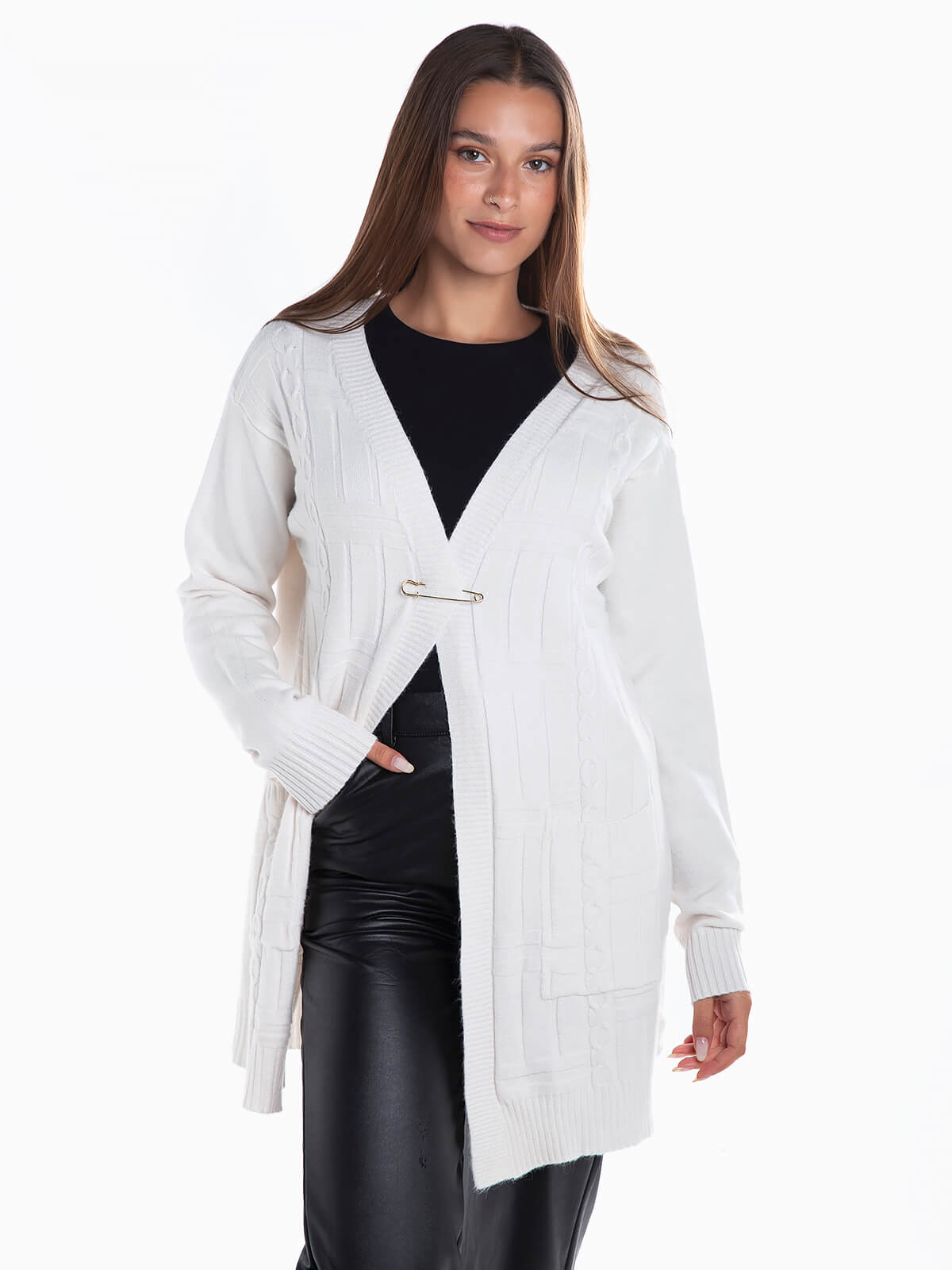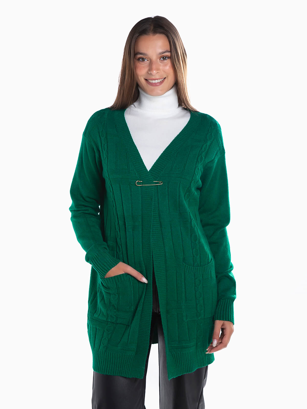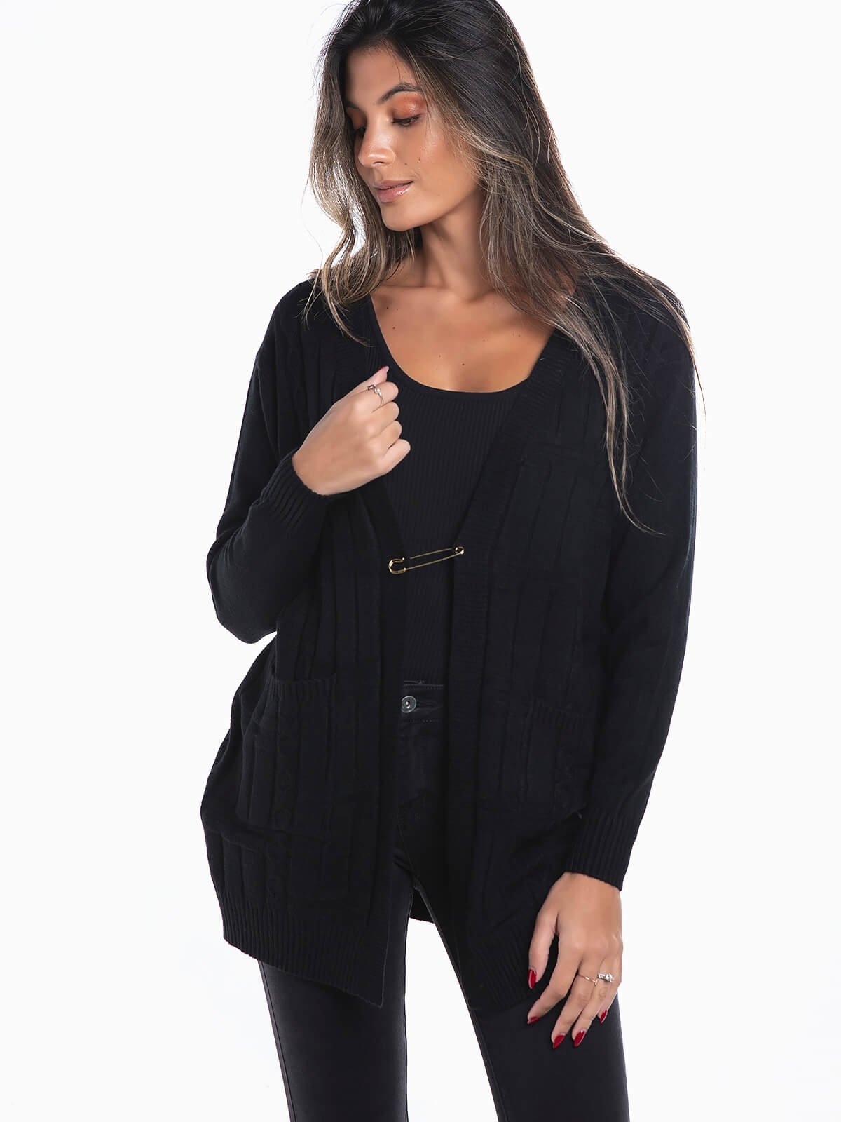 Casaco em malha trabalhada com aperto de alfinete. Cardigan aberto comprido com acabamentos canelados. Manga comprida. 2 bolsos.