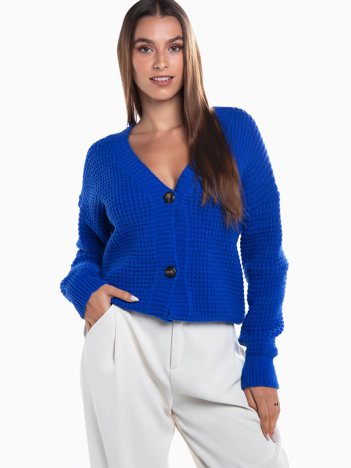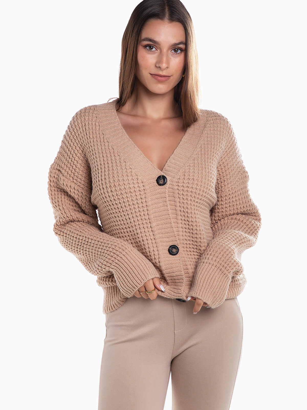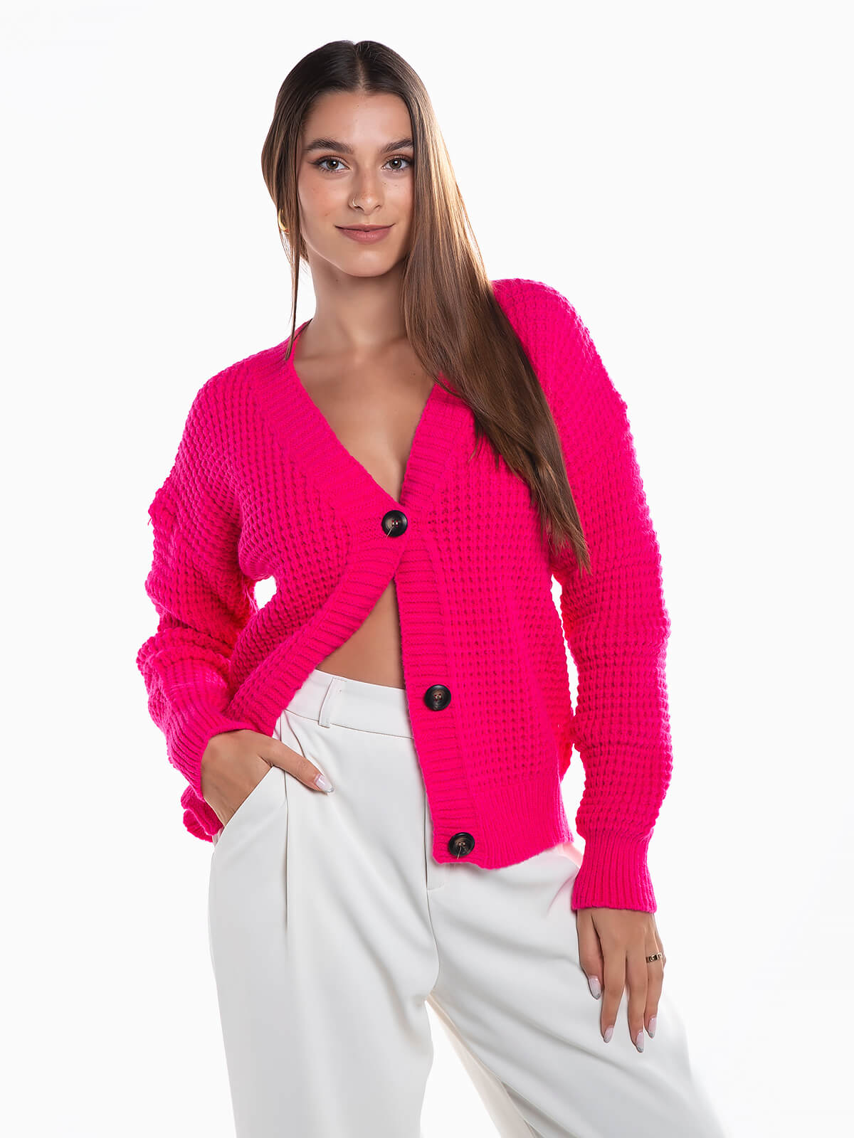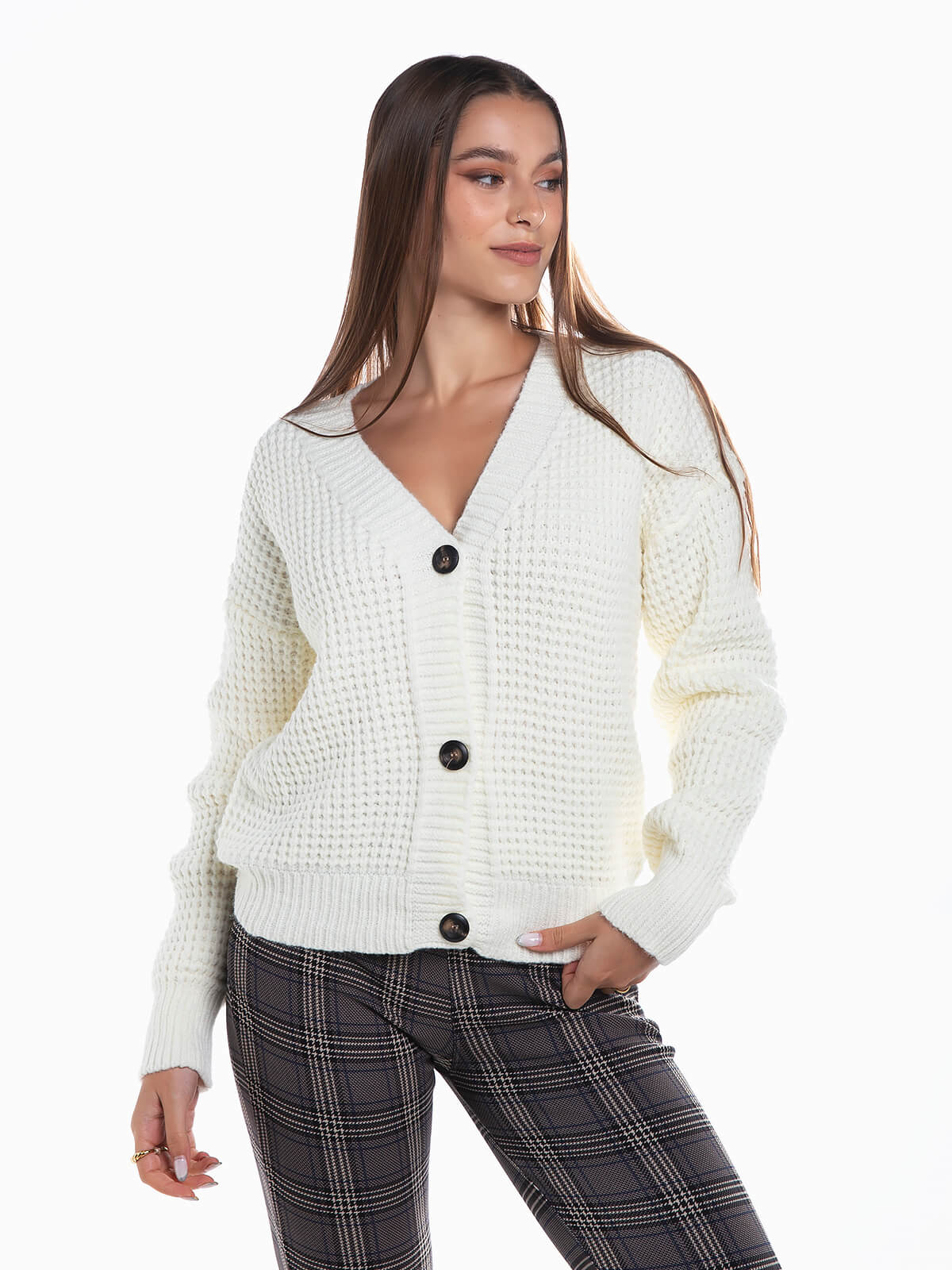 Casaco oversize em malha trabalhada para senhora. Cardigan mistura lã manga comprida com decote em bico. Acabamentos canelados. Aperto frontal de botões.