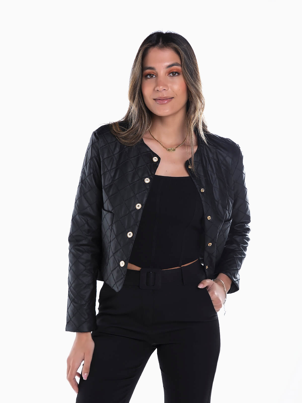 Casaco em pele sintética aos losangos para senhora. Blusão com interior forrado. Decote redondo. 2 bolsos. Aperto frontal de botões de pressão.