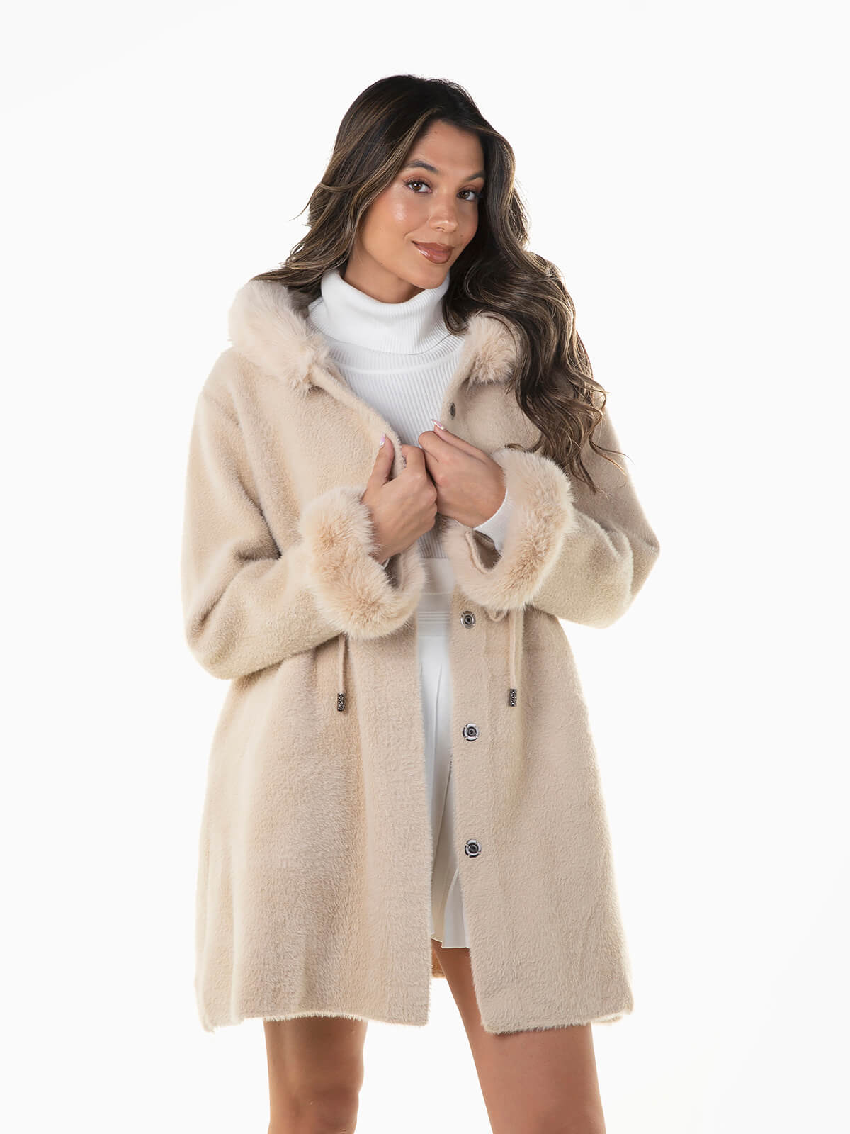 Casaco comprido com efeito pelo e cordão na cintura para ajustar. Casaco de manga comprida com capuz e extremidades em pelo. 2 bolsos. Aperto de botões pressão.