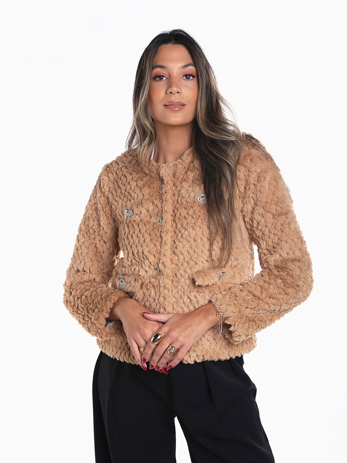 Casaco em pelo sintético trabalhado com aperto de botões jóia em contraste. Casaco manga comprida com decote redondo. 2 bolsos.