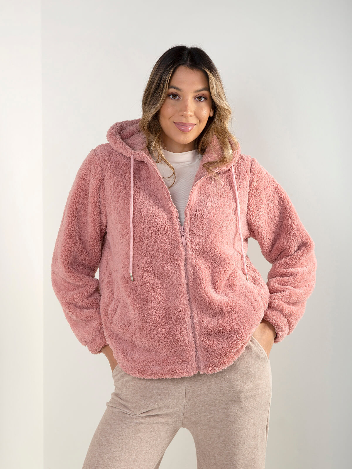Casaco teddy, super macio e quente. Modelo com capuz, fecho ziper e 2 bolsos. Ideal para looks confortáveis e de inverno.