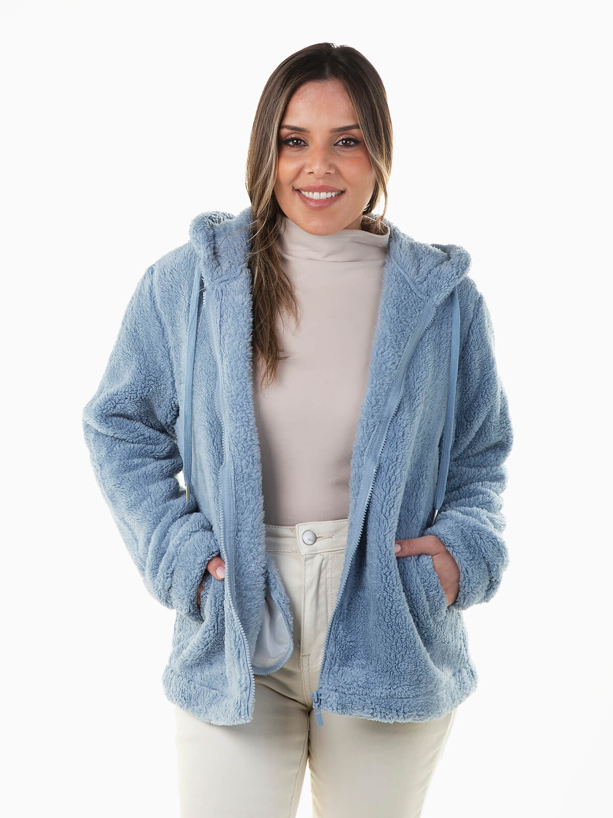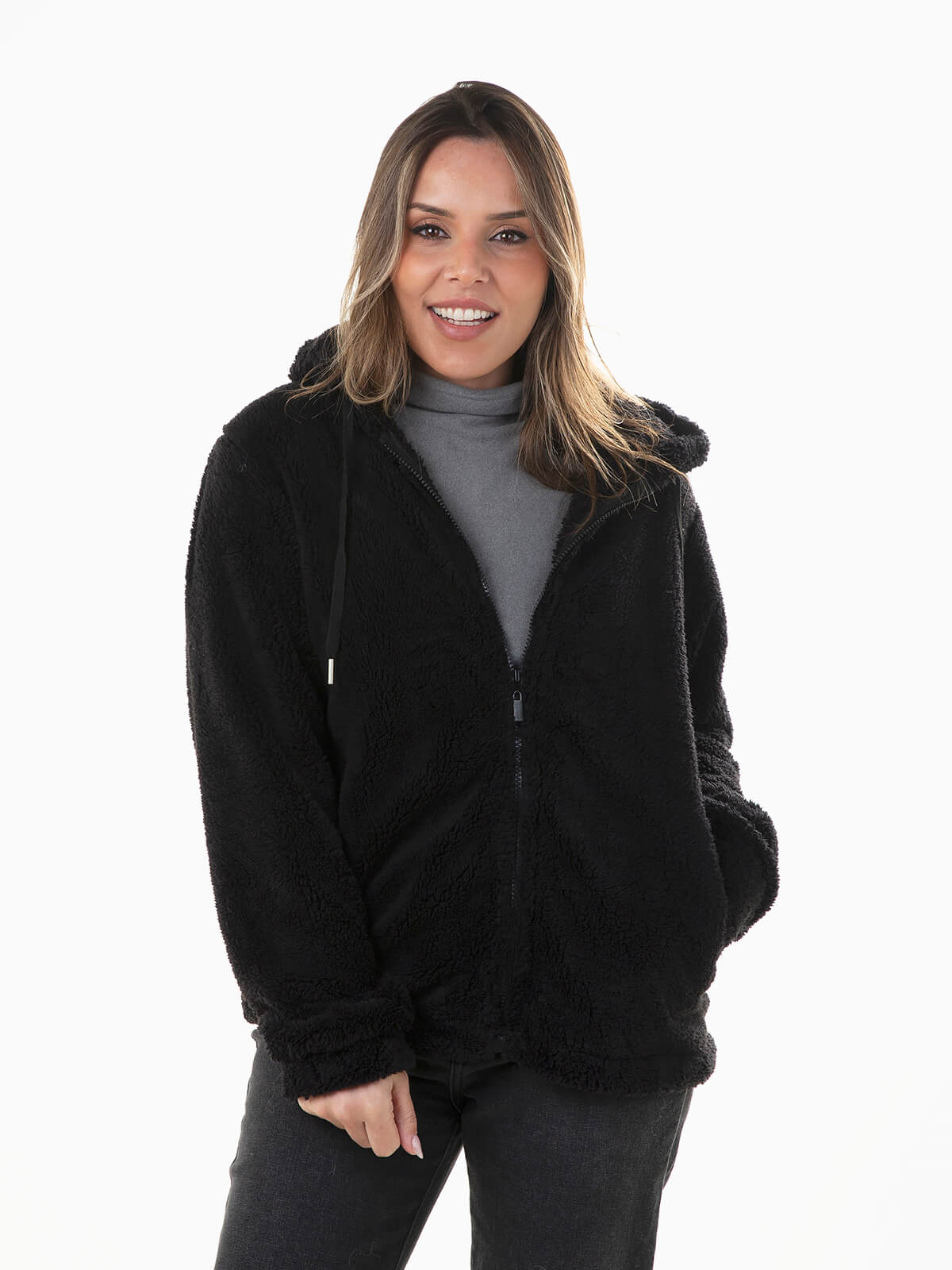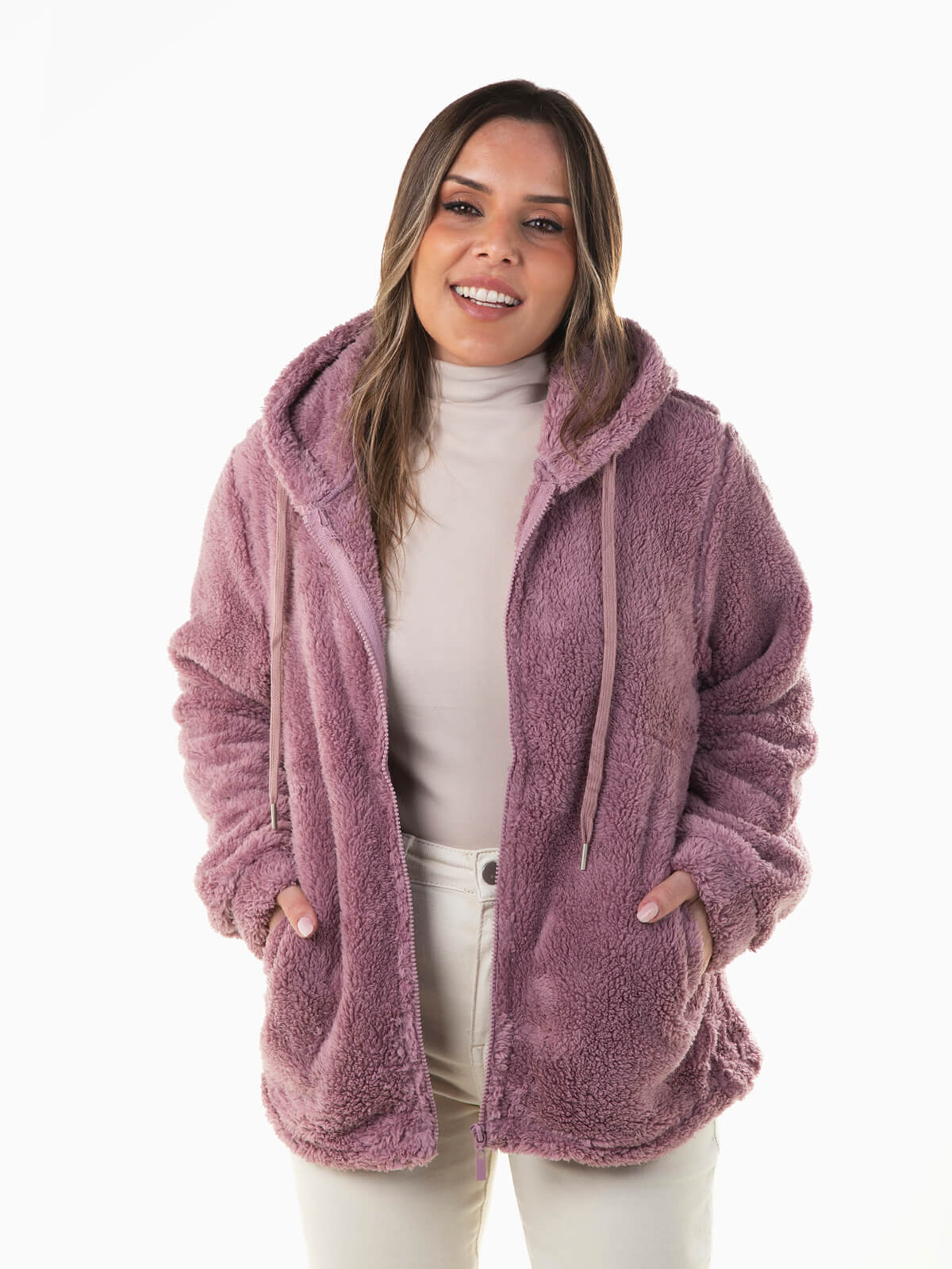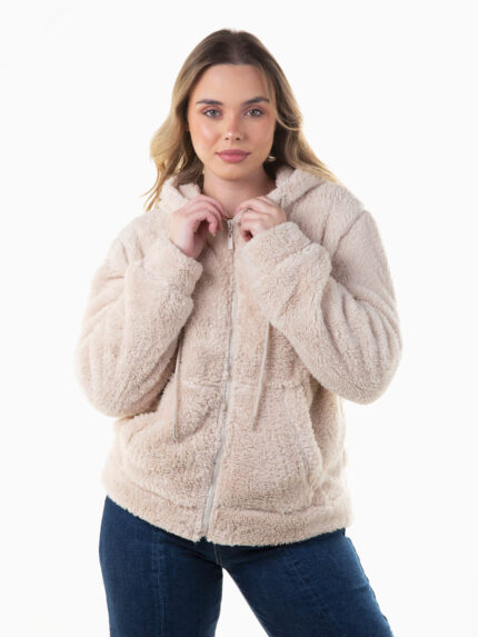 Casaco de pelo com capuz e cordão para ajustar. Casaco de manga comprida com 2 bolsos. Aperto de fecho éclair.