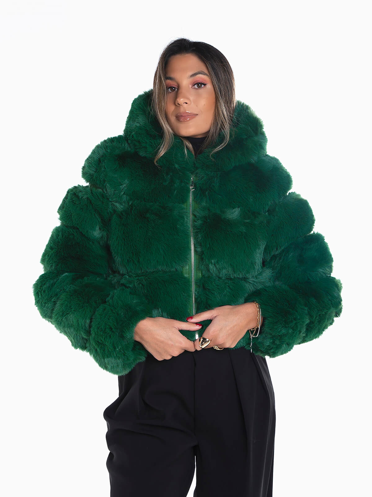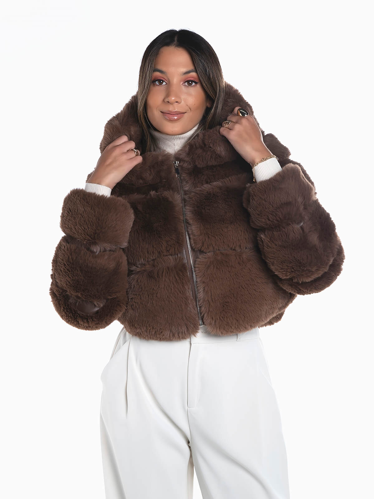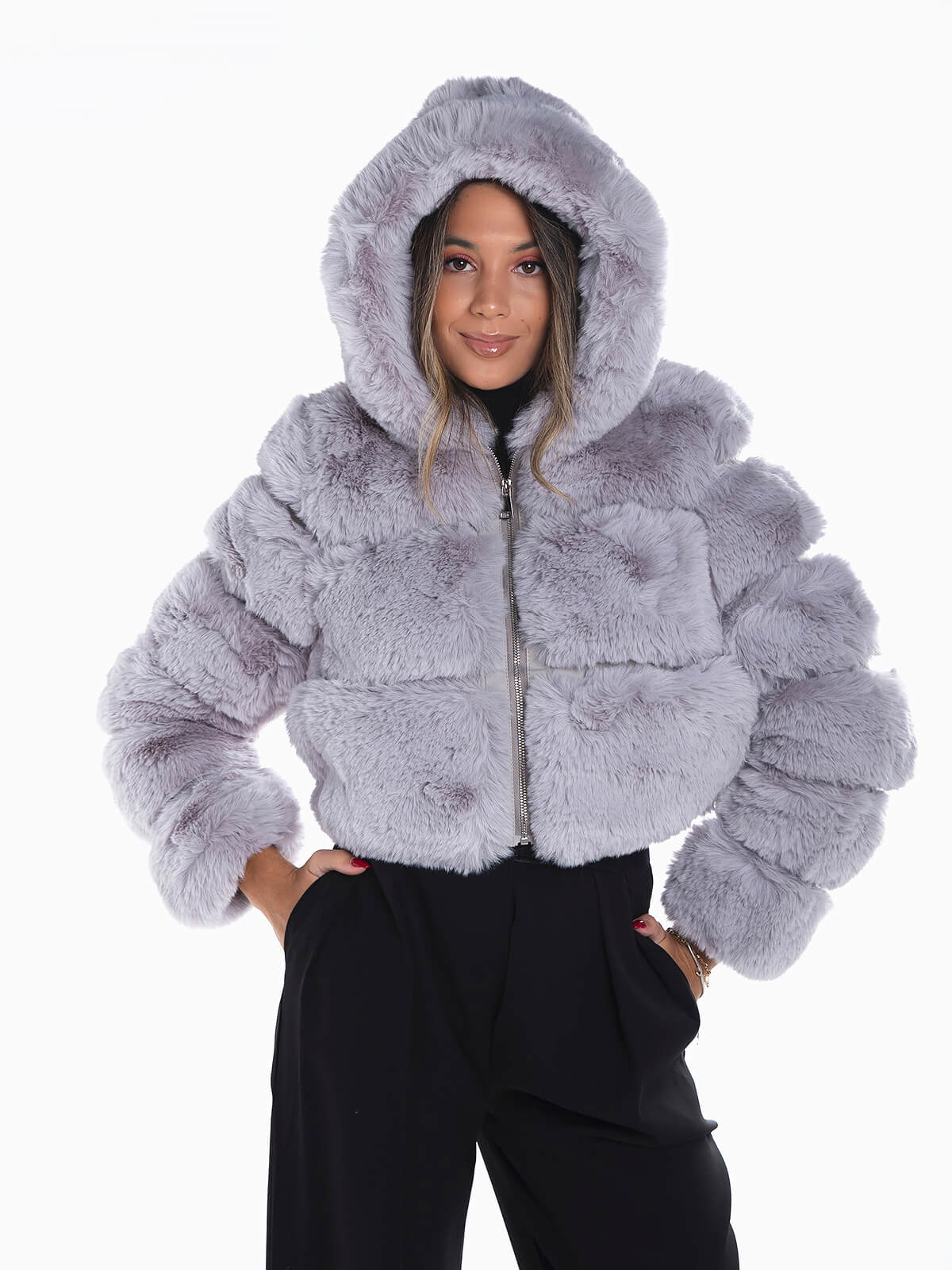 Casaco em pelo sintético com capuz para senhora. Casaco manga comprida com gola redonda. 2 bolsos laterais. Interior com forro aveludado. Aperto de fecho zíper.