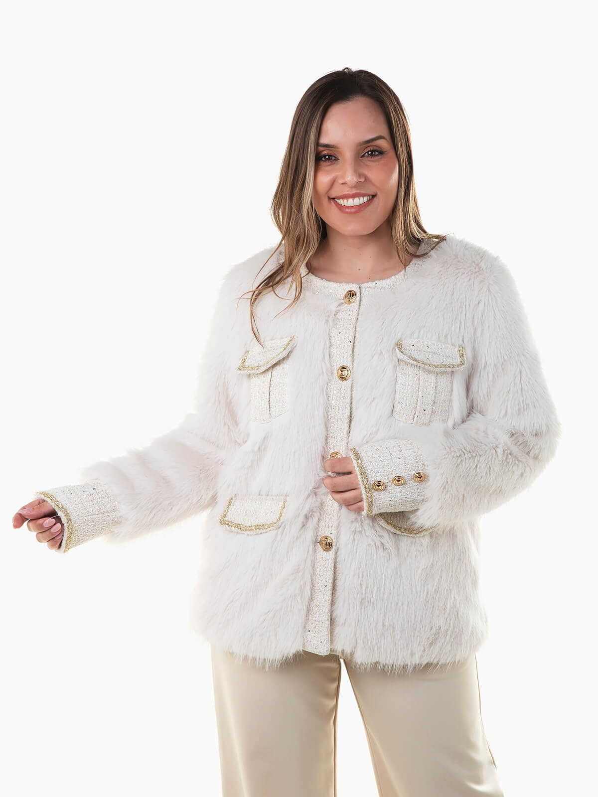 Casaco de pelo combinado com tweed e fios luréx brilhantes para maior elegância. Casaco manga comprida com interior forrado e punhos abotoados. Decote redondo. 2 bolsos no peito e palas decorativas. Aperto frontal de botões.