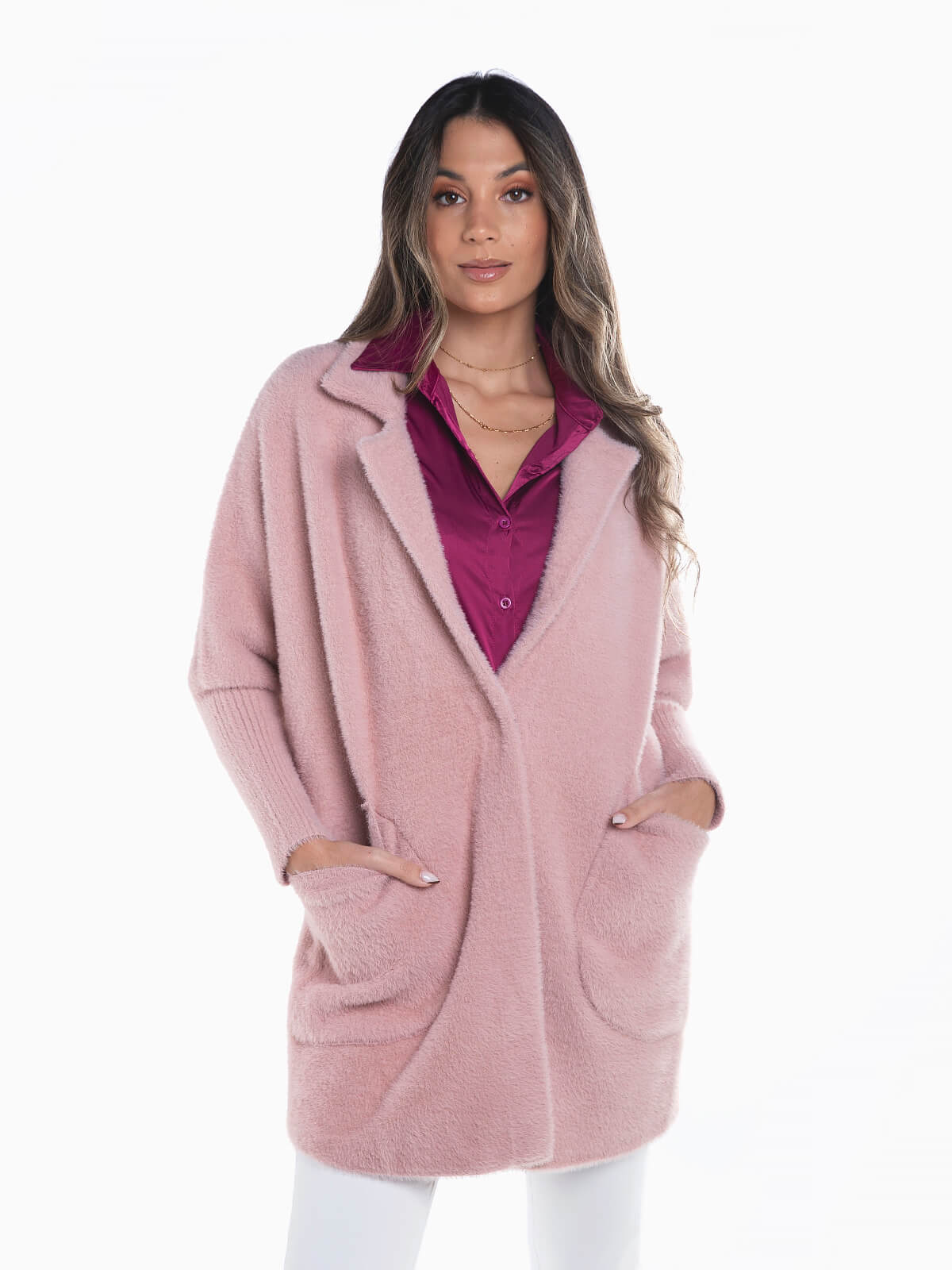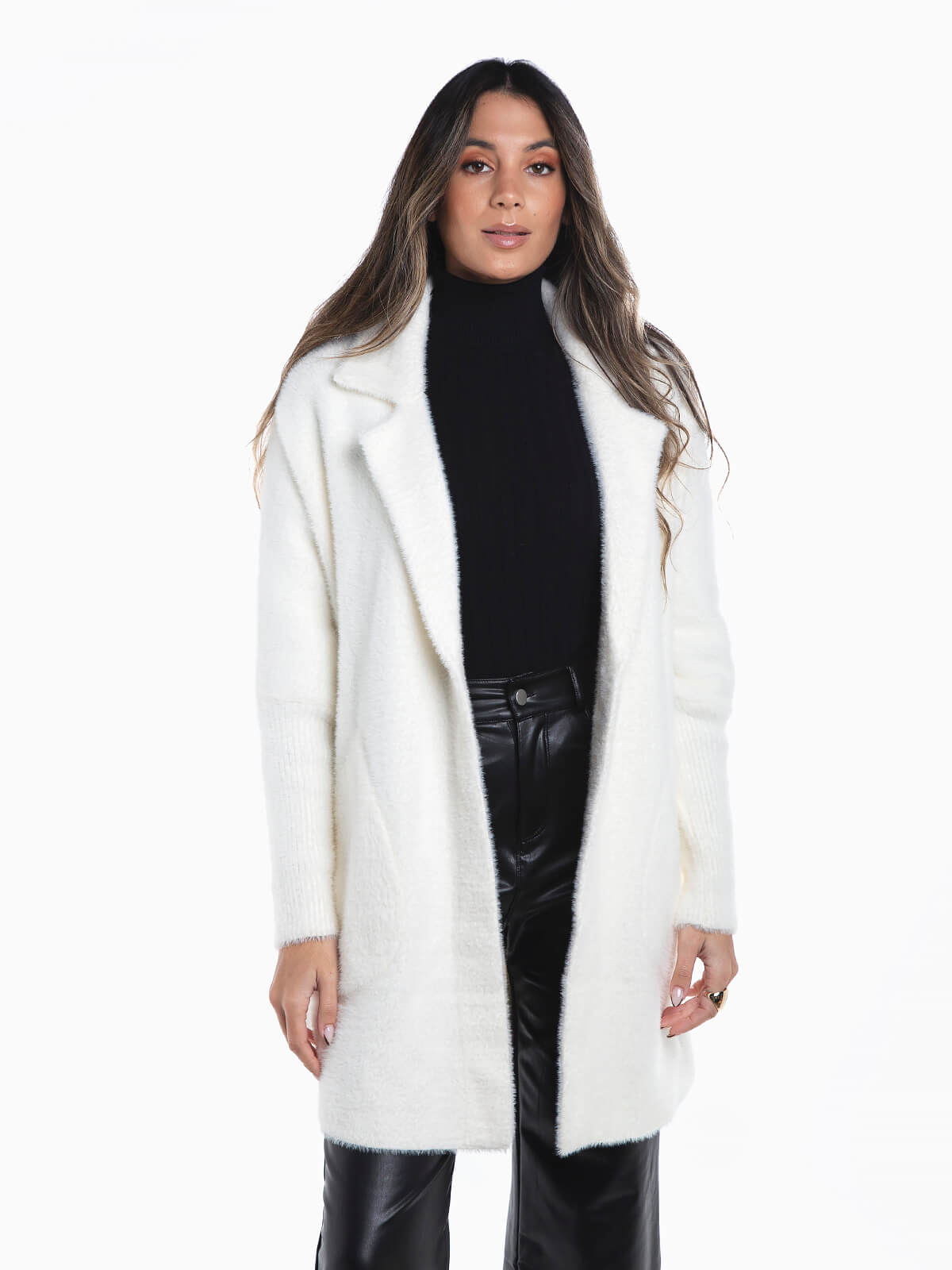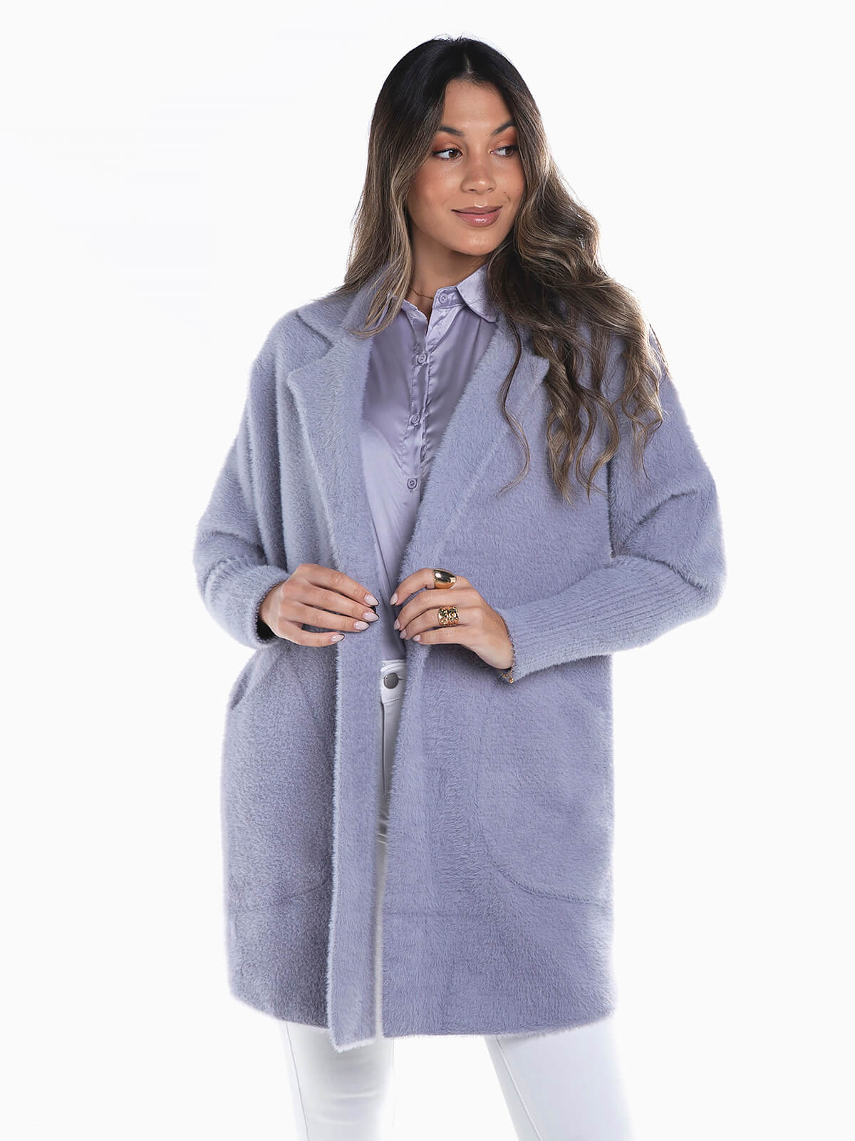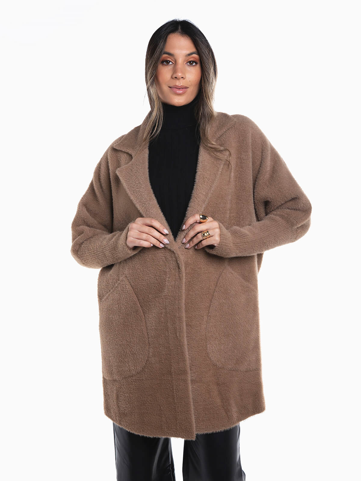 Casaco comprido efeito pelo para senhora. Casaco manga comprida com punho justo canelado. Gola abas e lapelas. 2 bolsos. Aperto botão de pressão.