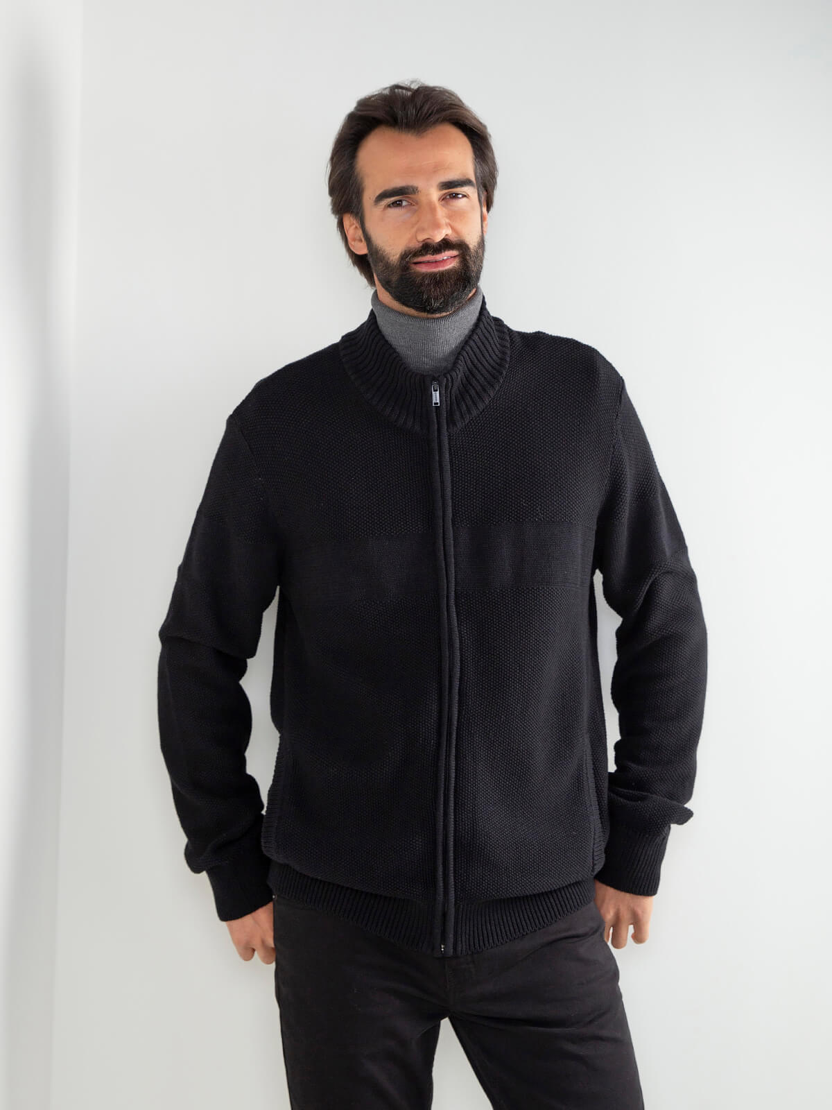 Casaco de malha estruturada em preto, com fecho zíper frontal, gola subida e dois bolsos. Modelo confortável, prático e fácil de combinar no dia a dia.