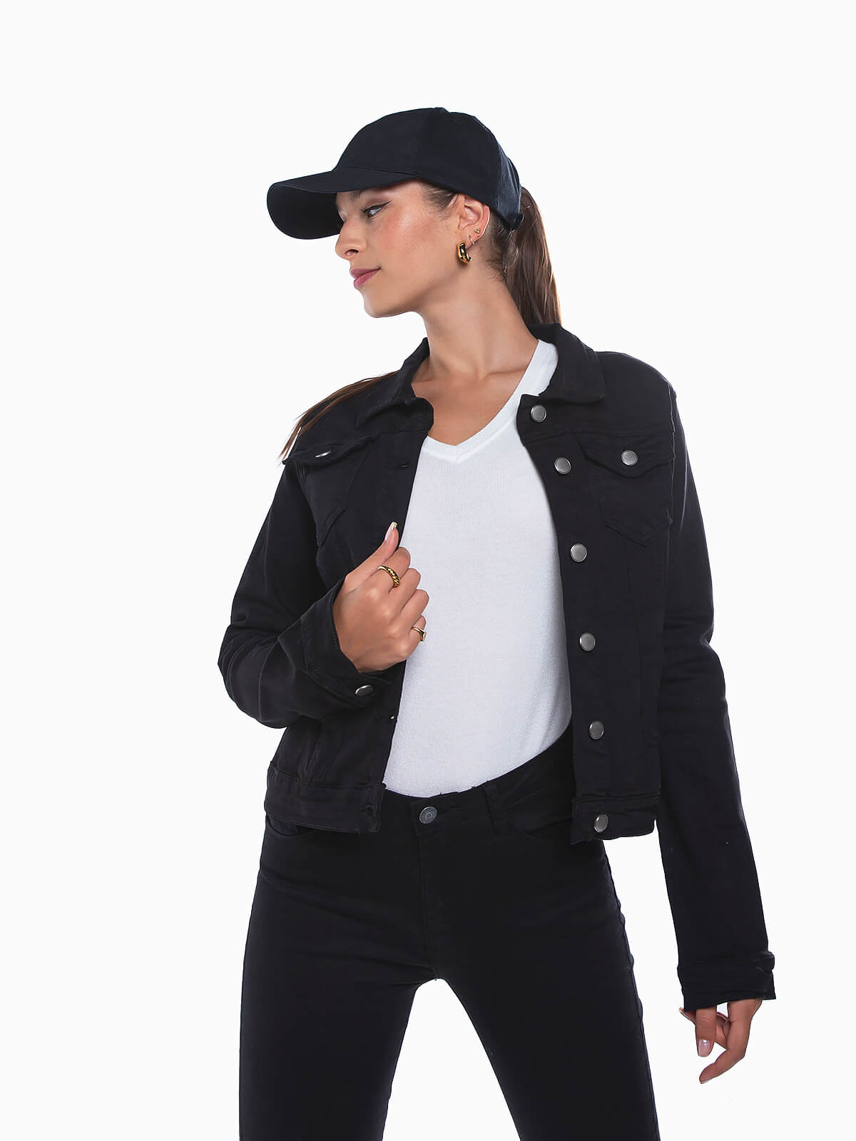 Casaco preto de sarja elástico para senhora. Casaco de manga comprida. Bolsos de aba no peito. Bolsos de lado. Aperto de botões. Punhos abotoados.