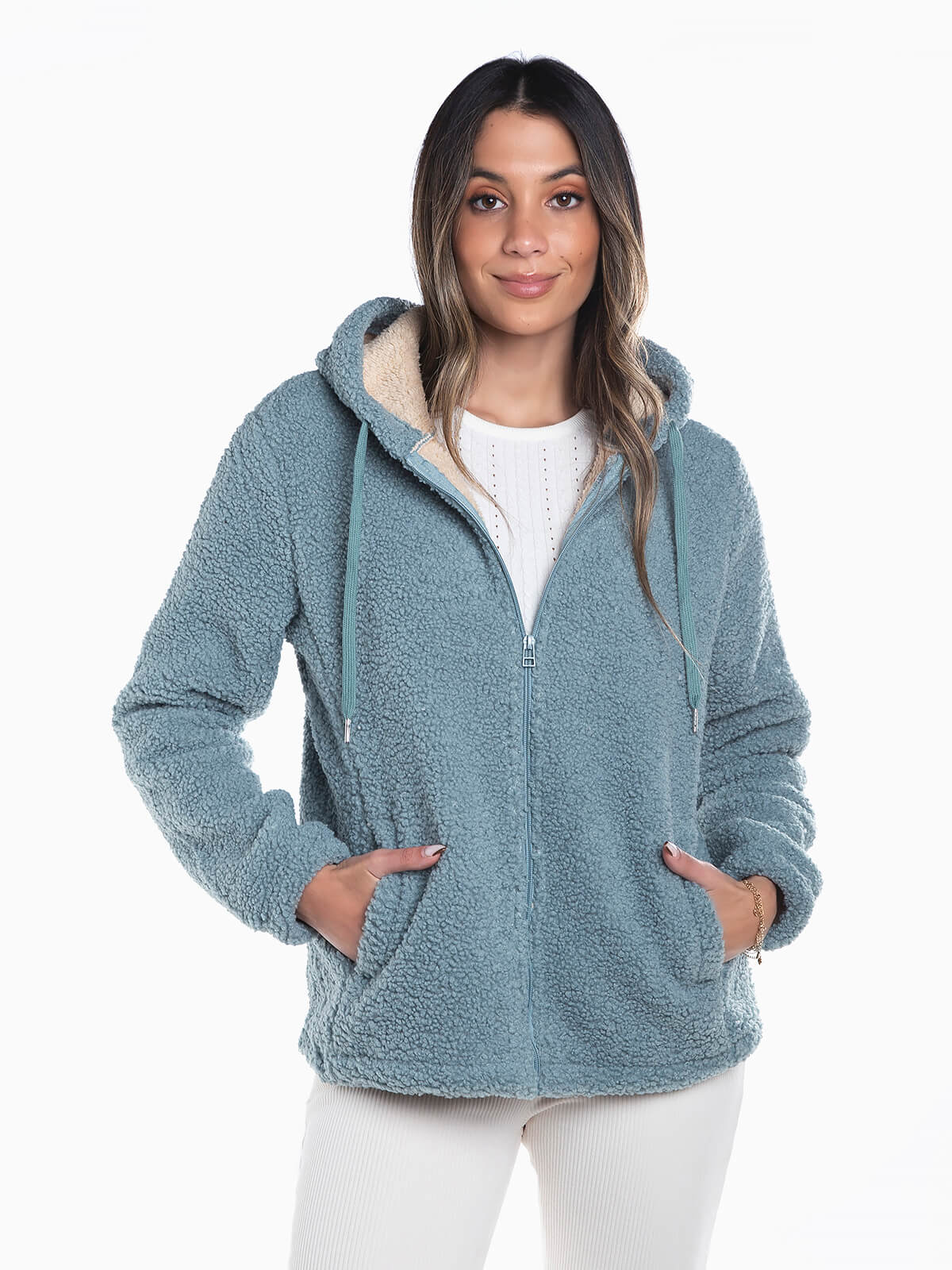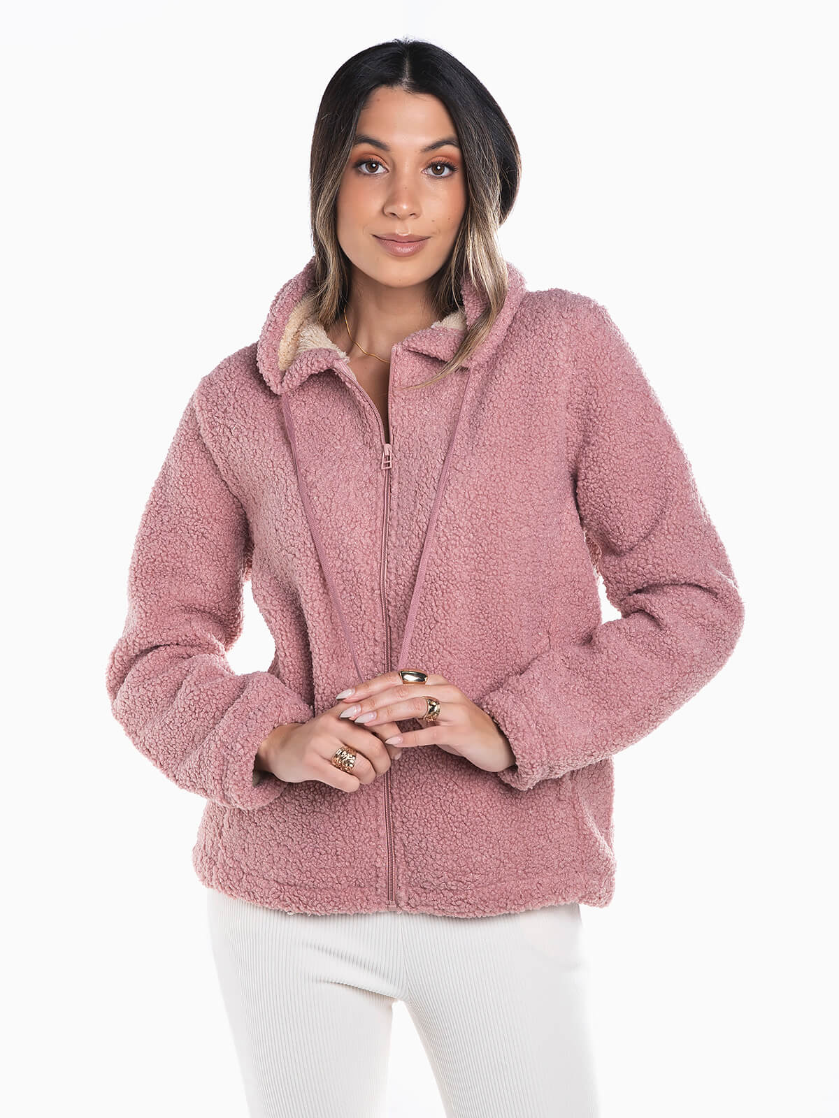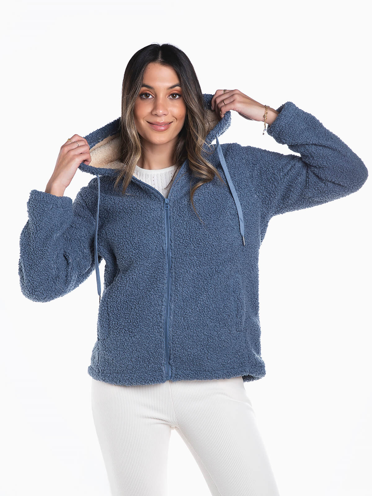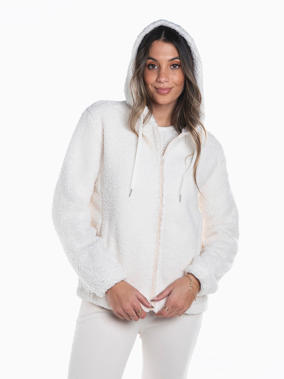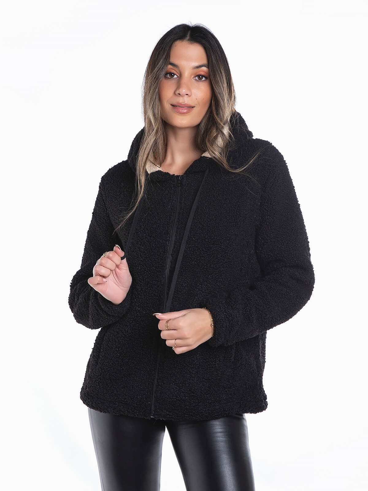 Casaco terrycloth com capuz e cordão para ajustar. Casaco manga comprida com interior polar. 2 bolsos. Aperto fecho zíper.