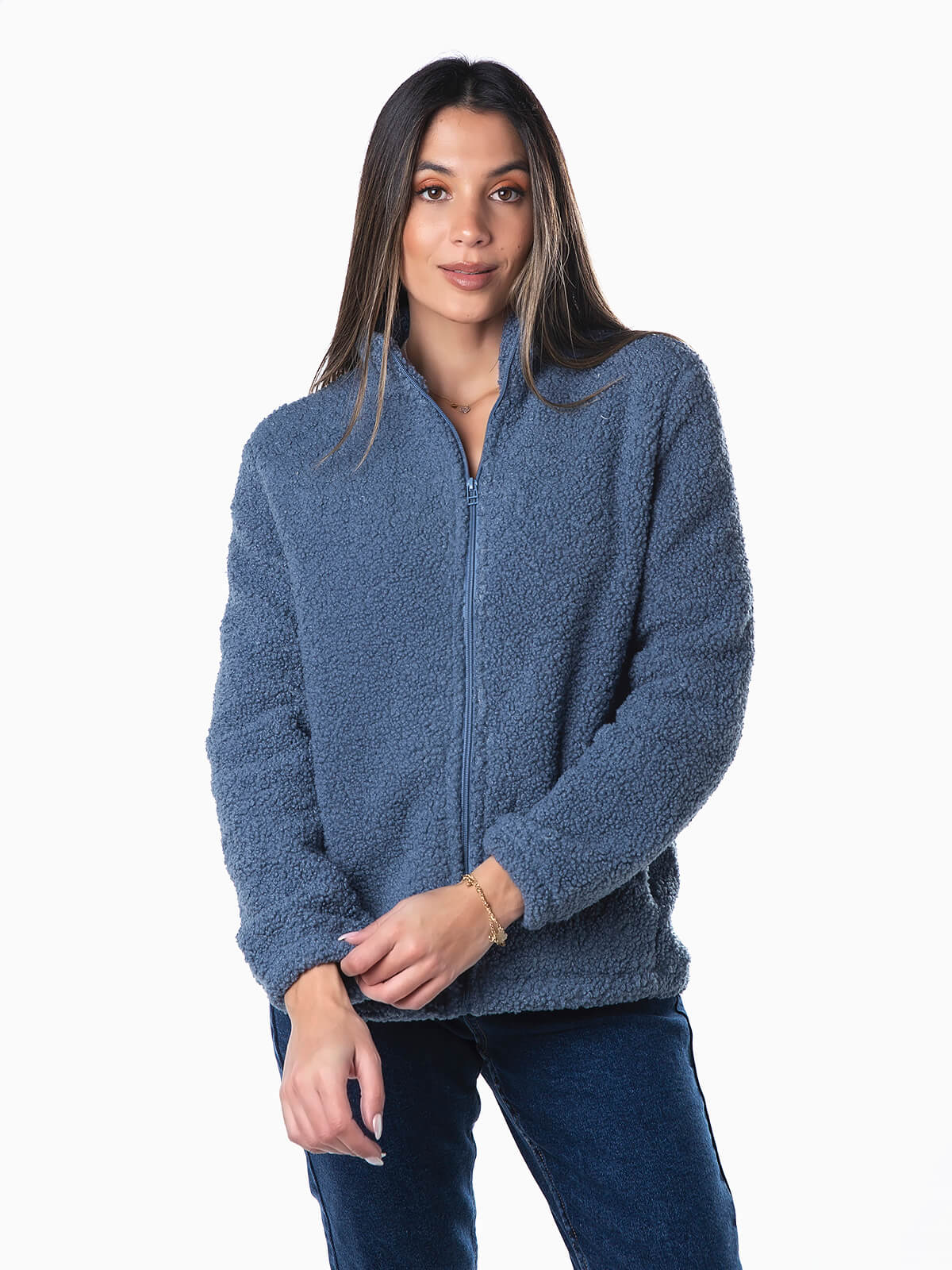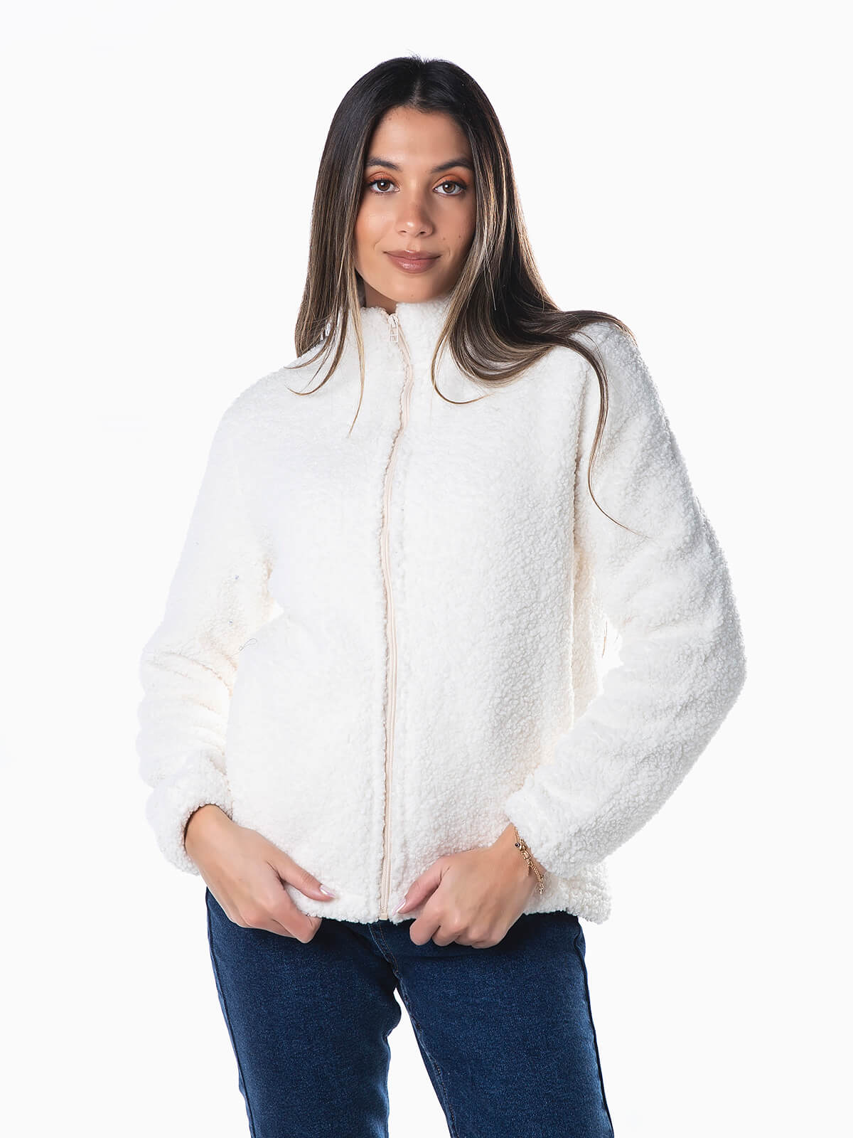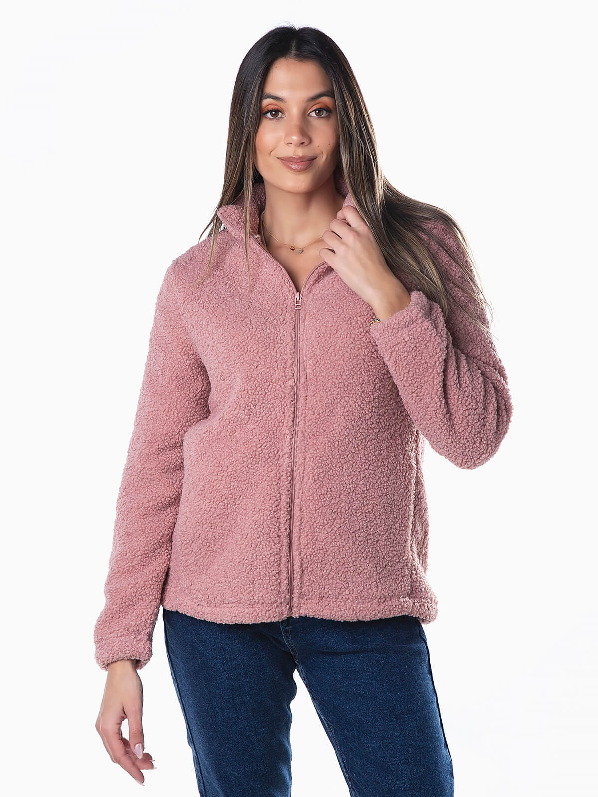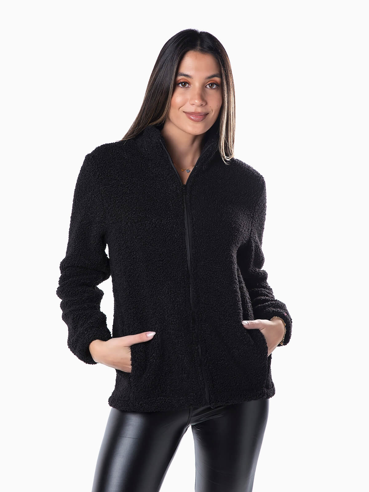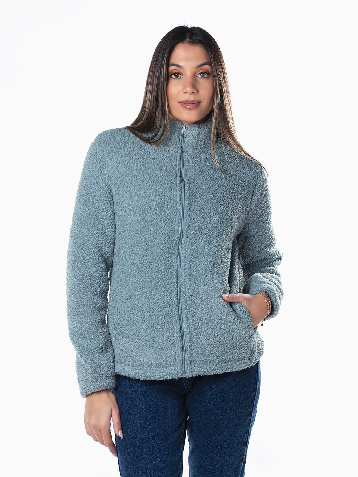 Casaco efeito pelo terrycloth com gola subida para senhora. Casaco manga comprida com interior polar. 2 bolsos. Aperto fecho zíper.