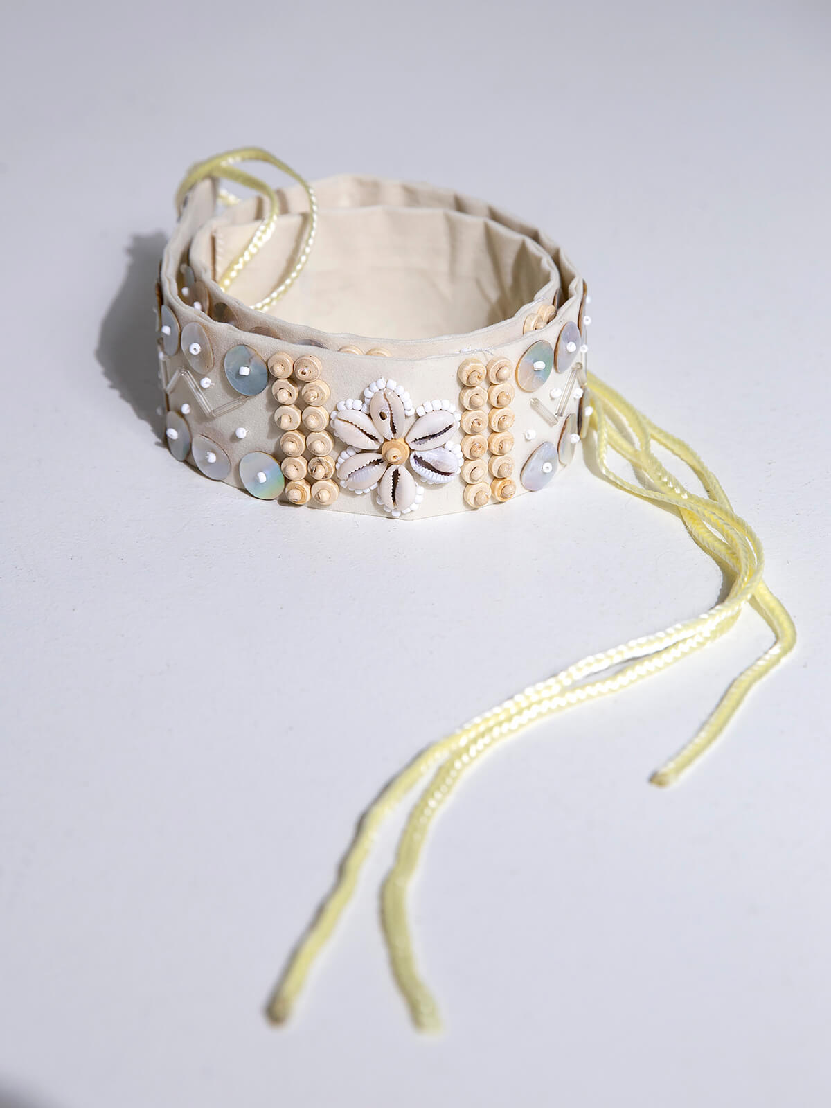 Cinto bege com missangas e conchas aplicadas. Cinto larga em tecido ligeiramente aveludado.