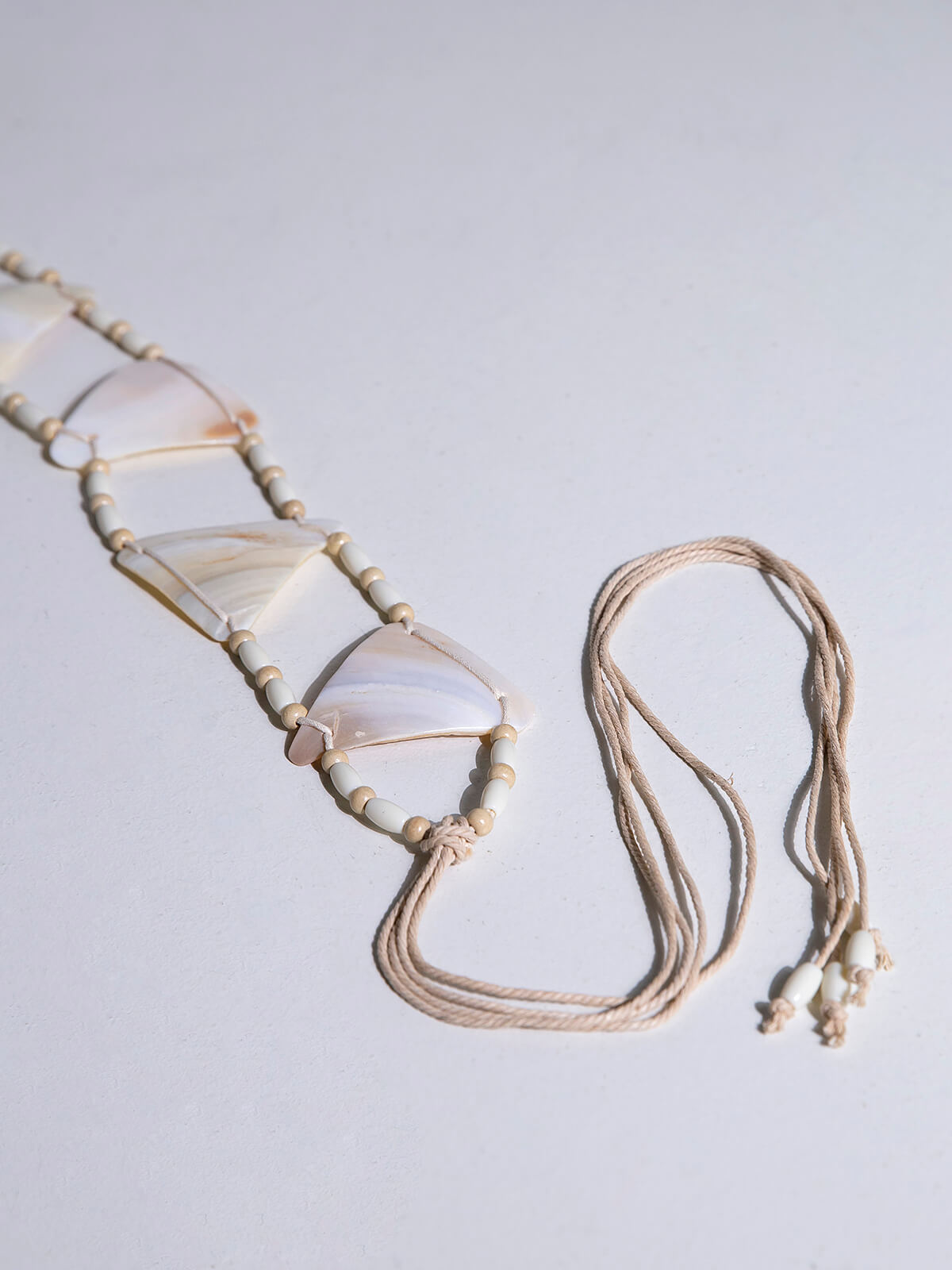 Cinto bege de juta com conchas e missangas de madeira.