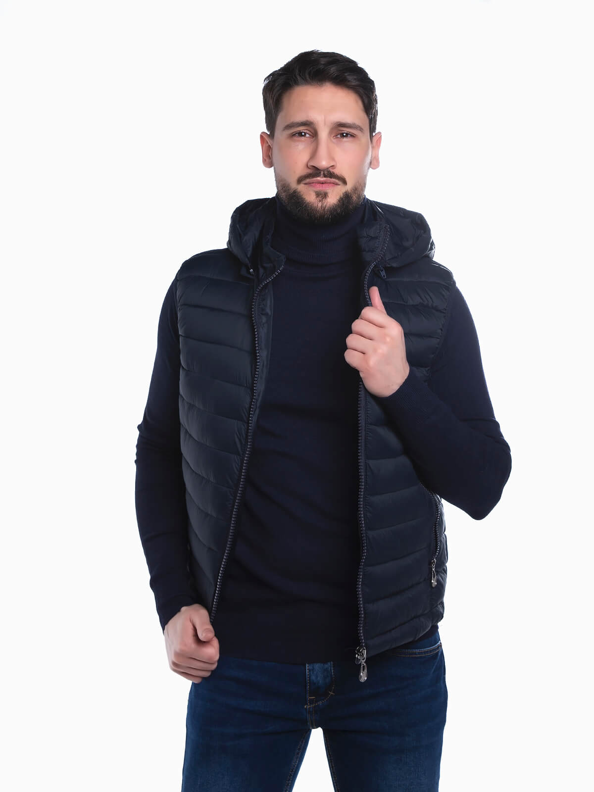 Colete acolchoado azul marinho com capuz removível para homem. Colete impermeável com gola subida. Bolso interior e dois bolsos à frente. Aperto de fecho zíper.