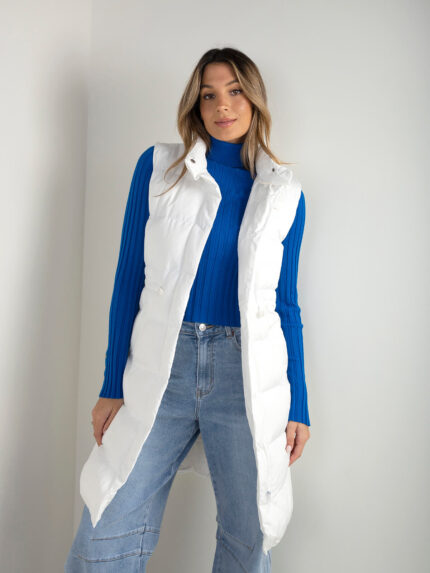 Colete acolchoado azul marinho com gola subida, fecho em zíper e 2 bolsos laterais. Inclui bolso interior prático. Leve, confortável e perfeito para completar looks casuais nos dias mais frios.