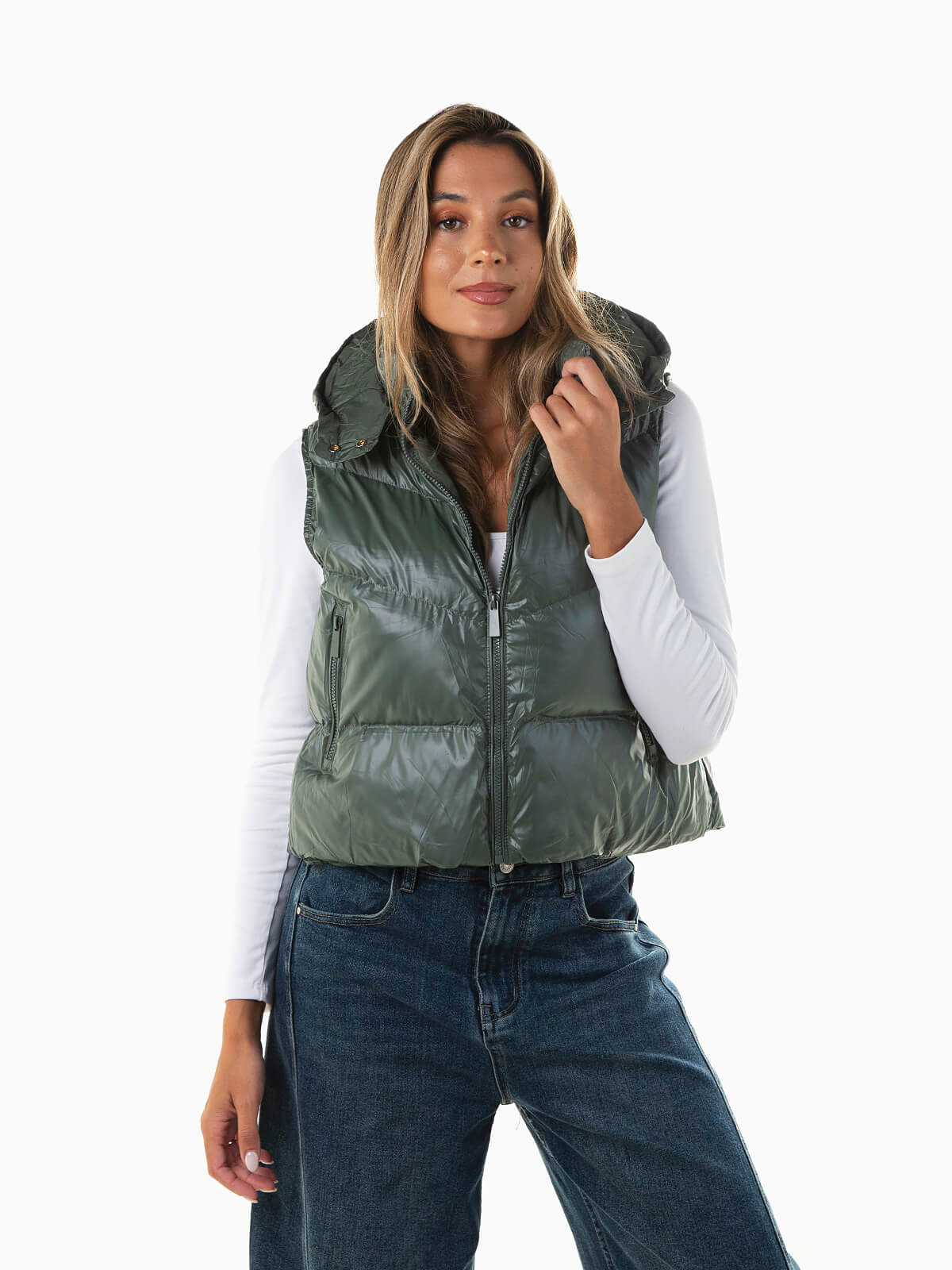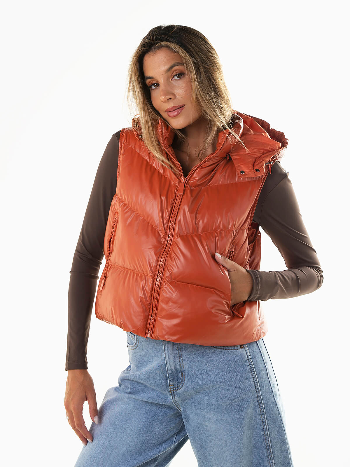 Colete acolchoado brilhante com gola subida e capuz removível ajustável com elástico. Modelo prático e confortável que oferece resistência a chuva ligeira, com dois bolsos frontais e fecho de zíper. Ideal para sobrepor a camisolas ou malhas finas, criando um look casual e descontraído em dias de meia-estação.