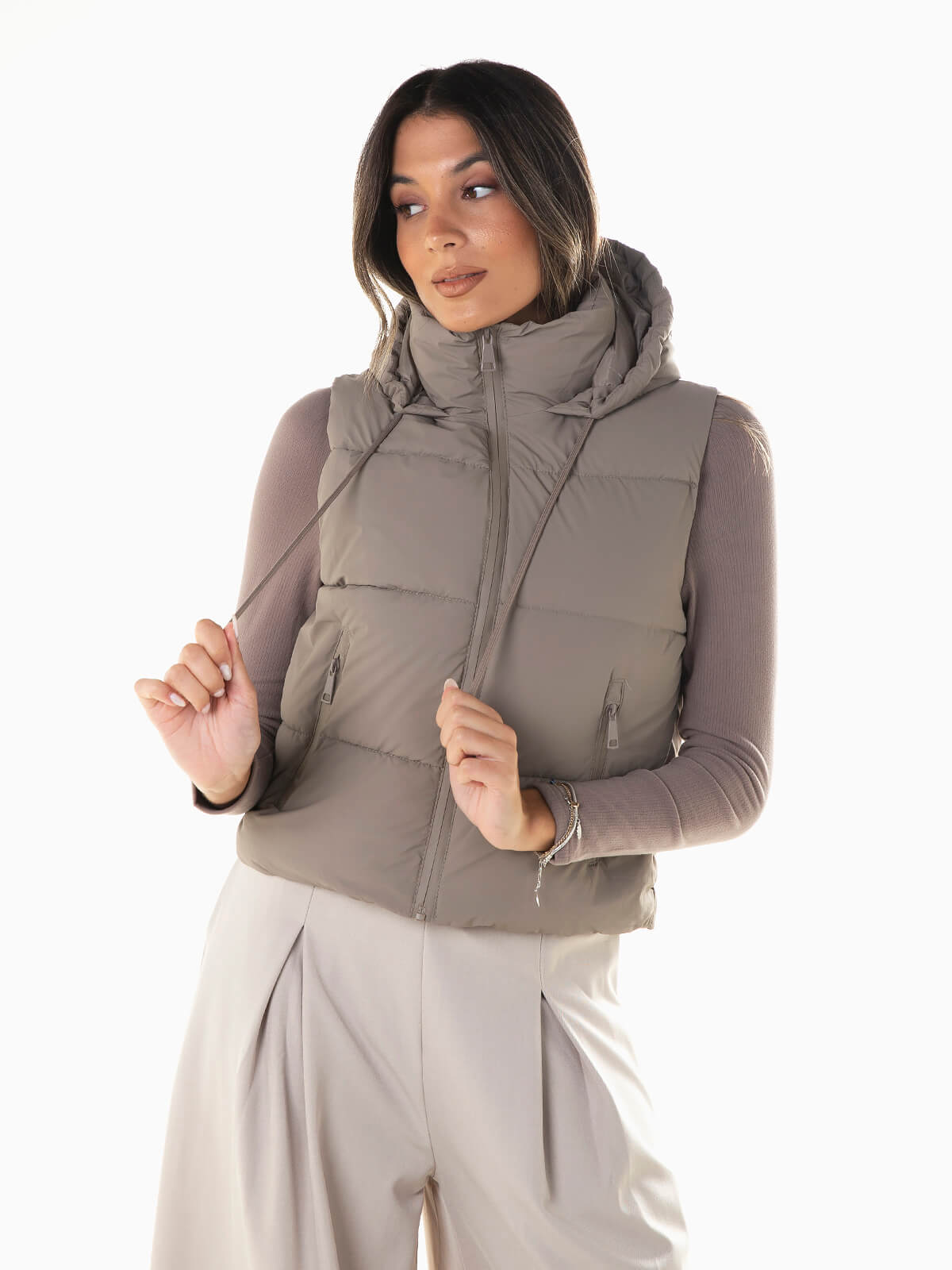 Colete acolchoado com capuz e cordão para ajustar. Colete de gola alta com interior forrado. 2 bolsos. Aperto fecho zíper.