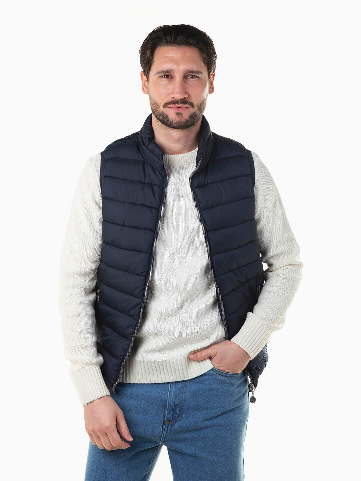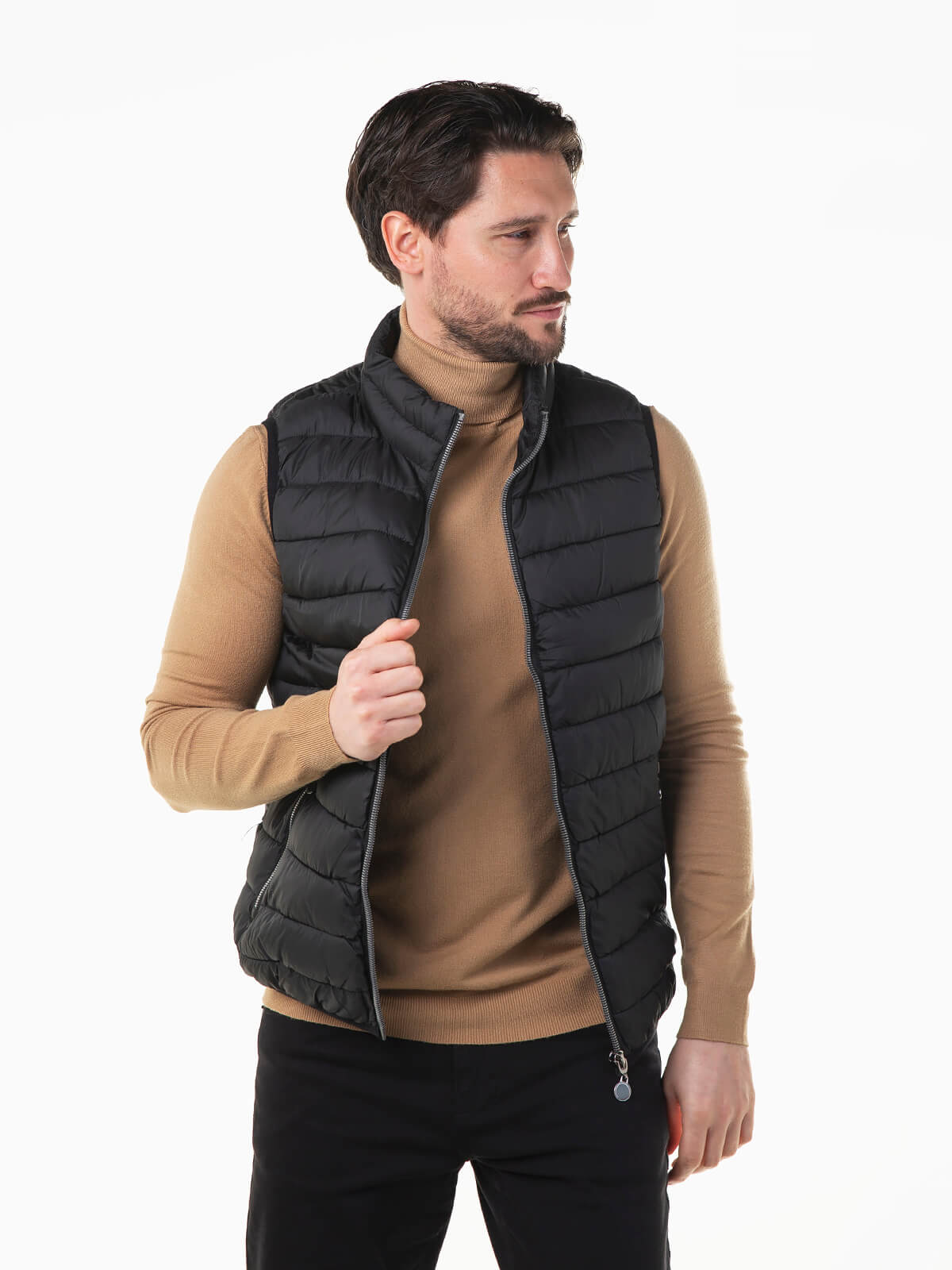 Colete acolchoado leve com gola alta para homem. Colete com proteção para chuva ligeira e bolso interior. 2 bolsos laterais. Aperto frontal de fecho zíper.
