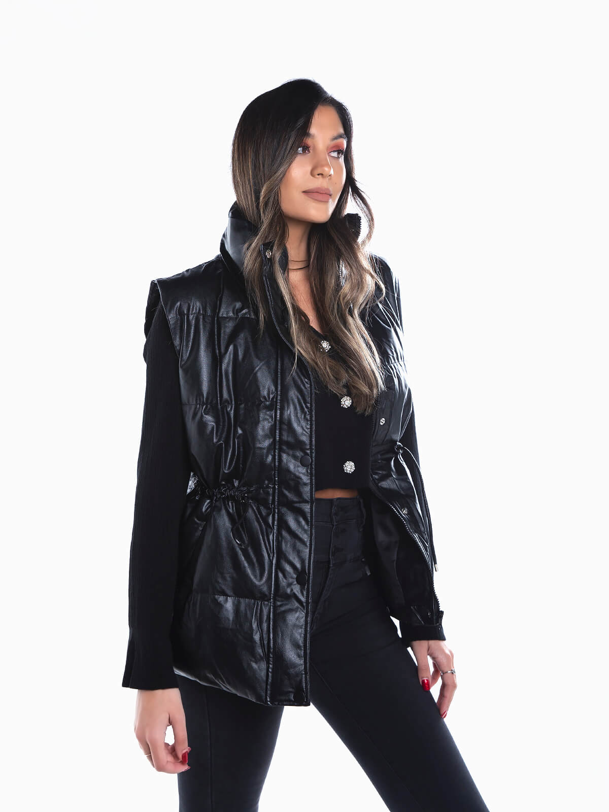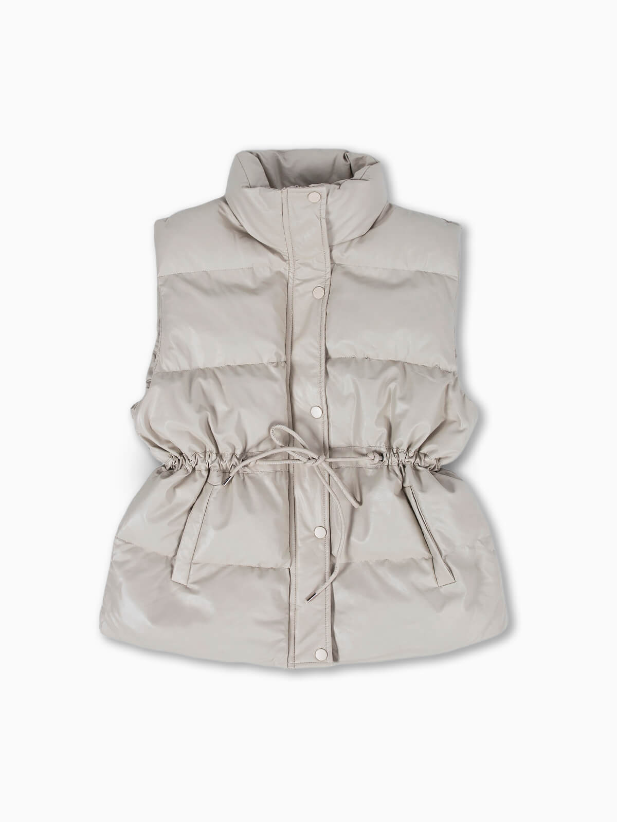 Colete acolchoado com efeito pele para senhora. Colete com gola alta e cordão na cintura para ajustar. 2 bolsos. Aperto frontal de fecho éclair e botões de pressão.