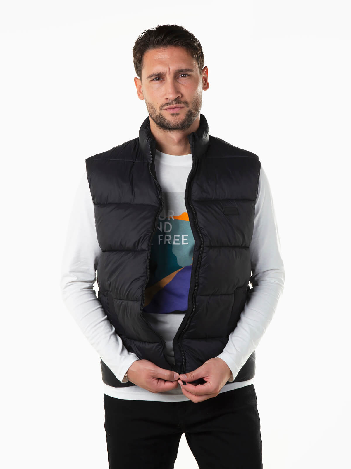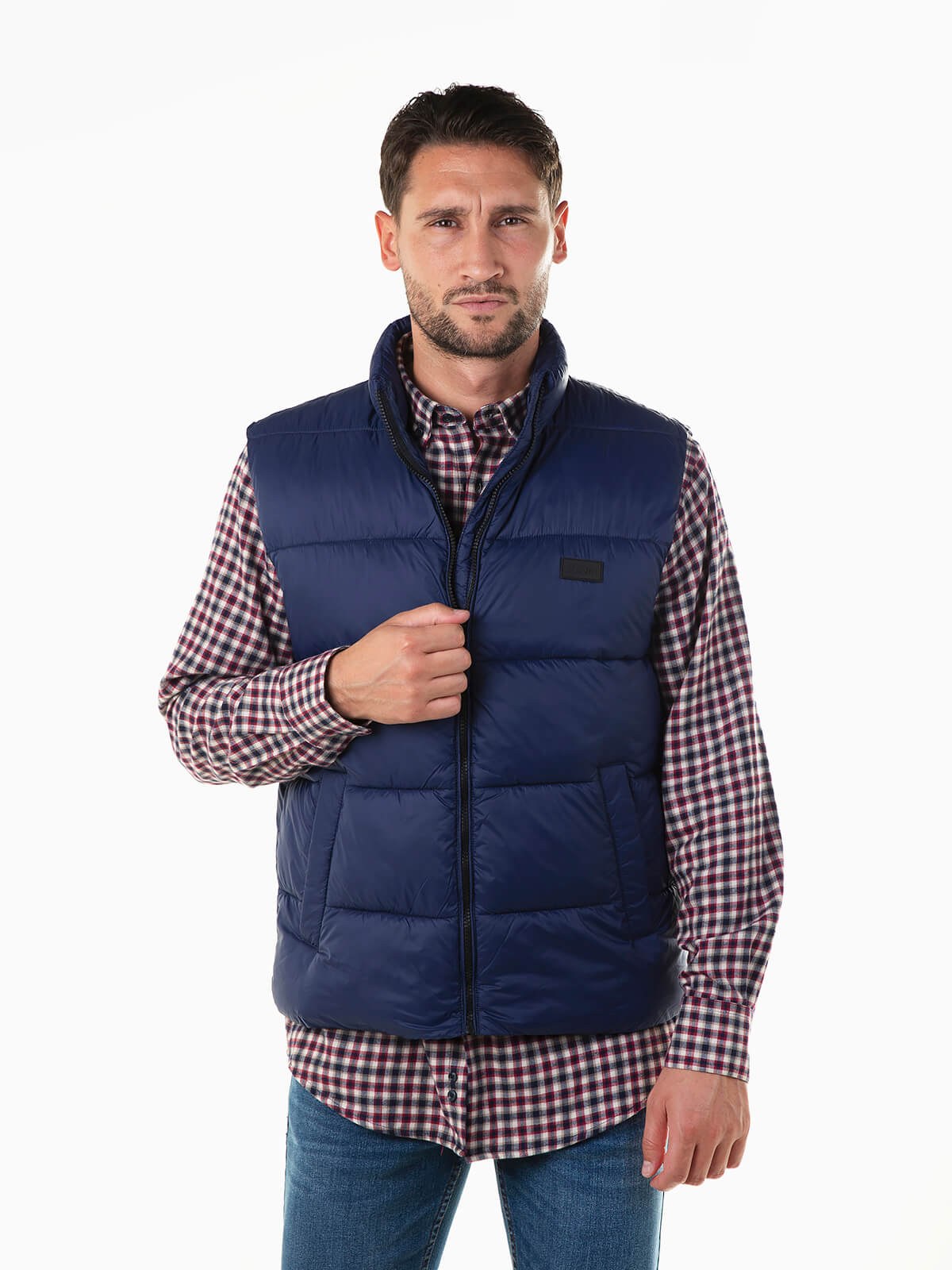 Colete acolchoado leve com gola alta para homem. Colete com proteção para chuva ligeira e 2 bolsos. Símbolo no peito. Aperto fecho zíper.
