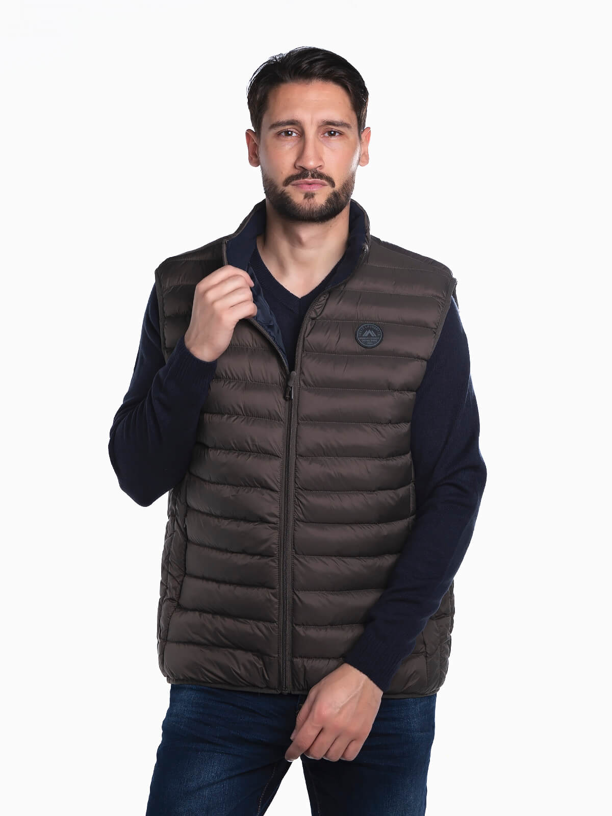 Colete acolchoado com gola subida cardada para homem. Colete leve impermeável com símbolo aplicado. Bolso interior 2 dois laterais.
