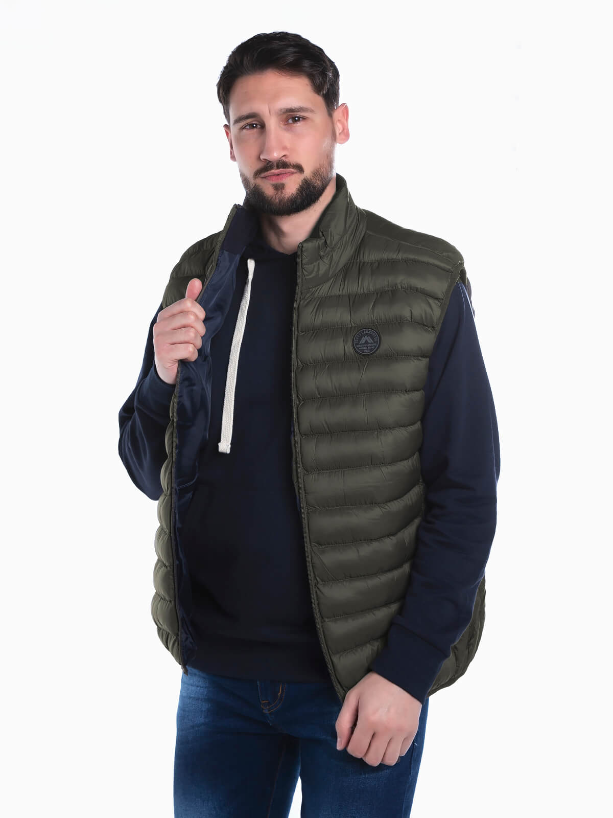 Colete acolchoado impermeável para homem. Colete ultraleve com gola subida e símbolo aplicado. Dois bolsos e um interior. Aperto de fecho zíper.