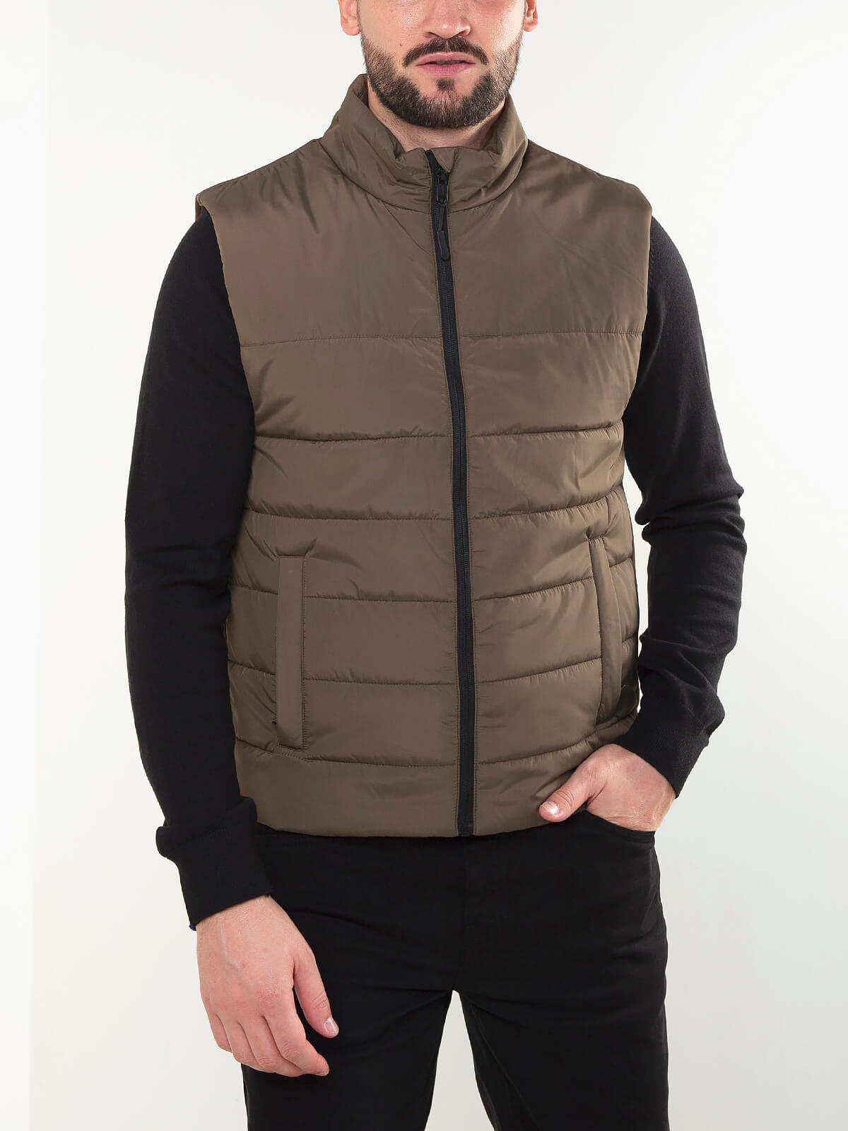 Colete acolchoado em tecido leve, com fecho zíper e 2 bolsos laterais. Modelo confortável, prático e com proteção para chuva ligeira.