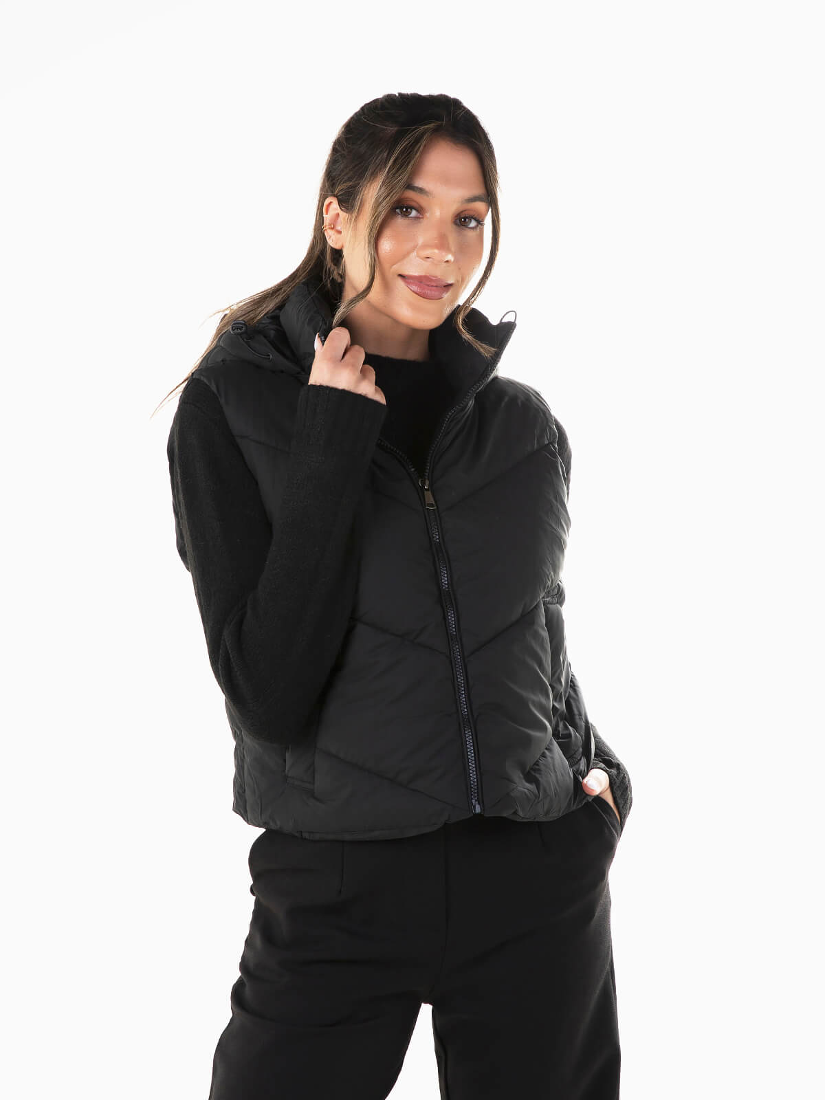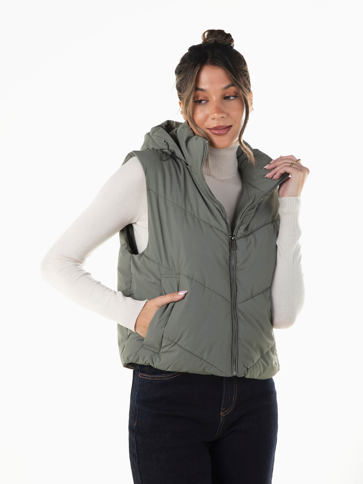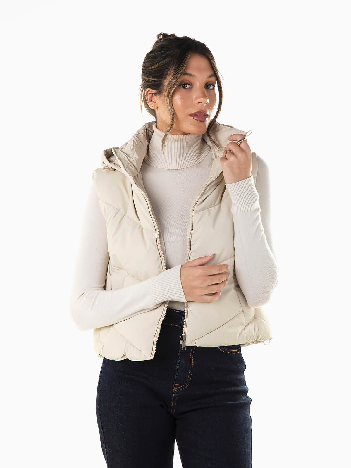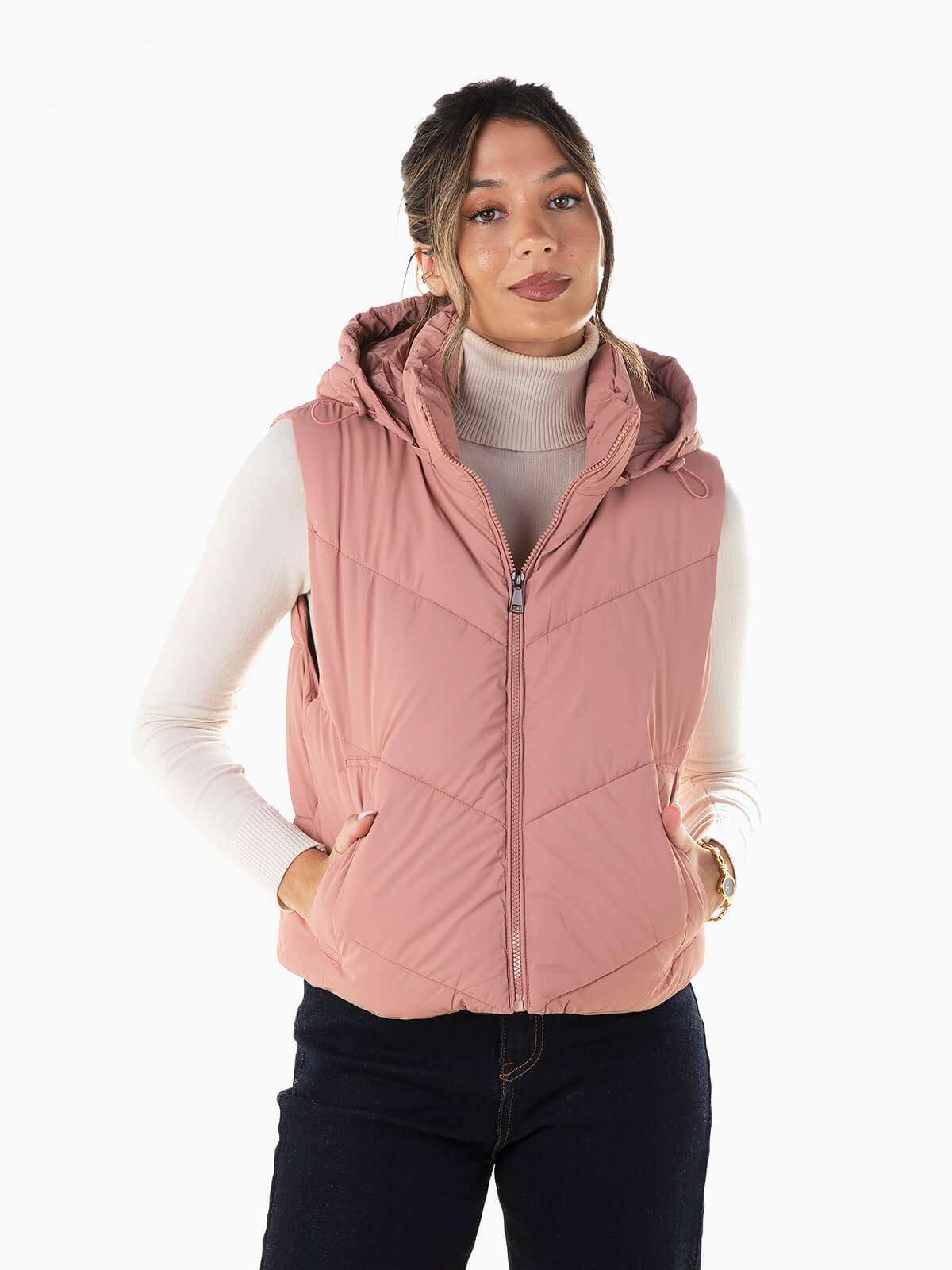 Colete acolchoado impermeável com capuz ajustável e removível para senhora. Colete manga cava com gola alta e 2 bolsos. Aperto de fecho zíper.