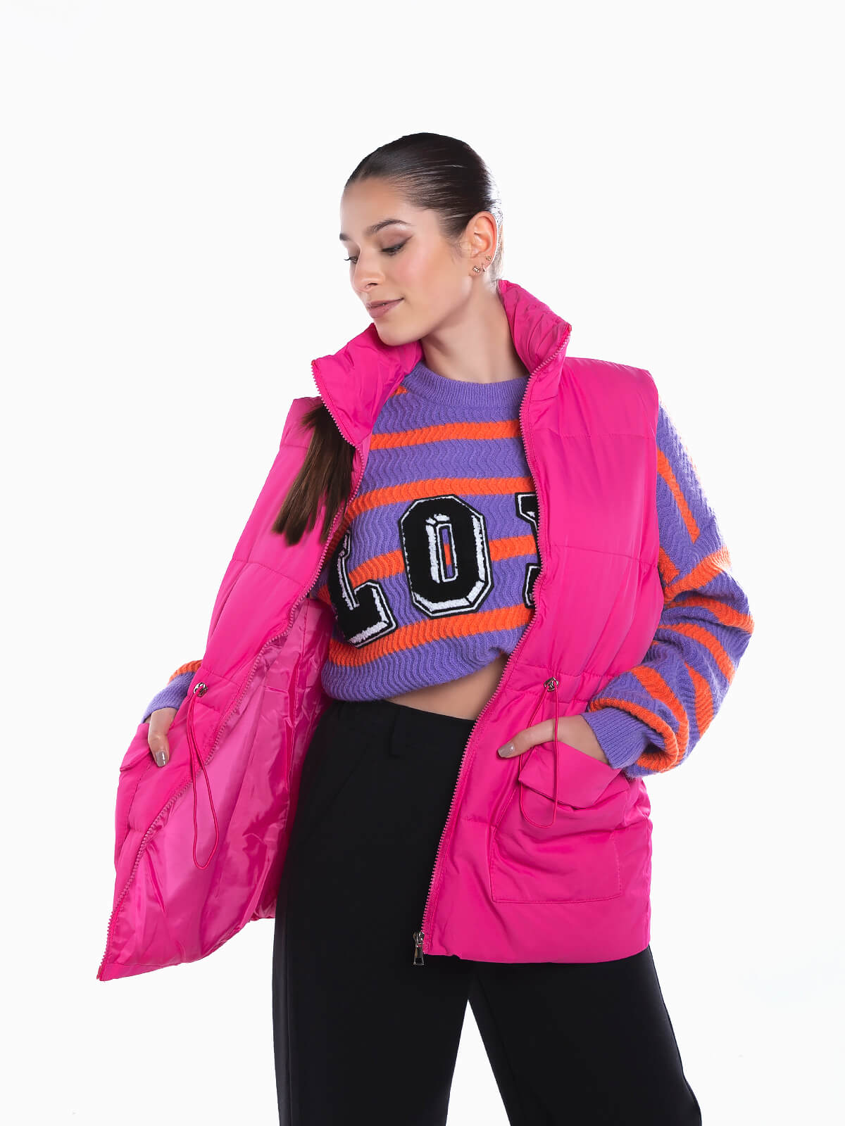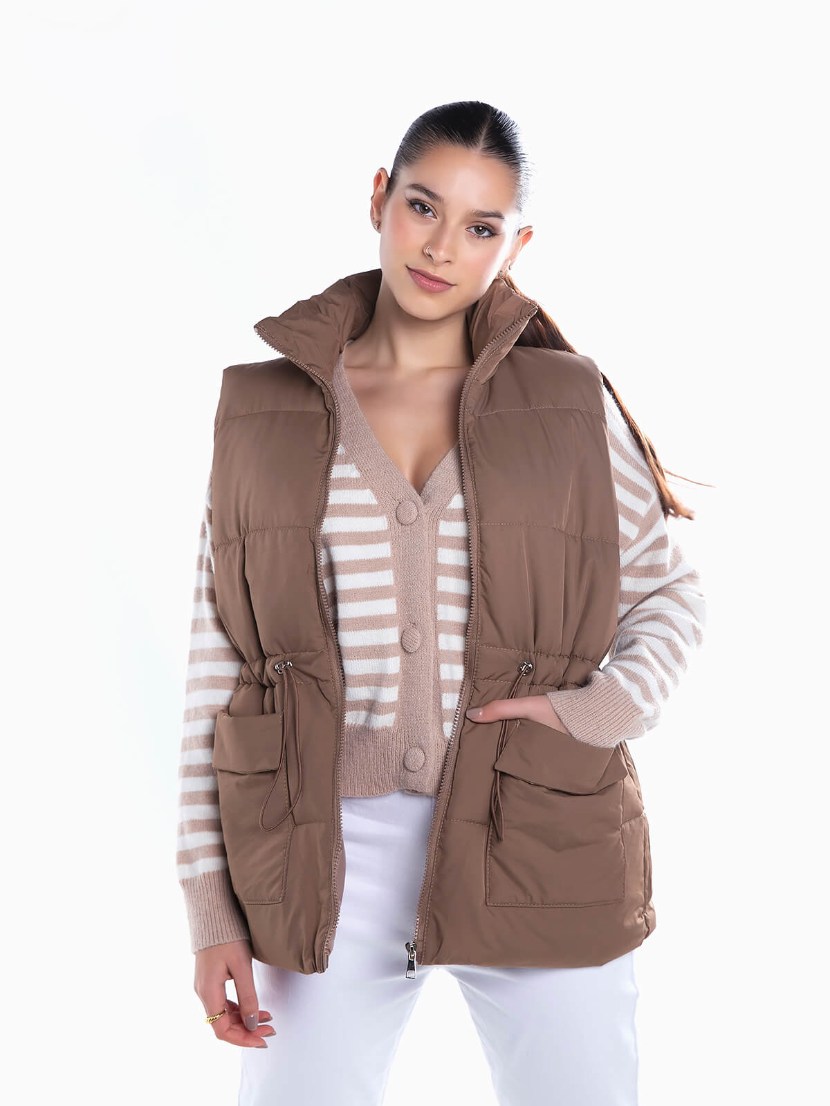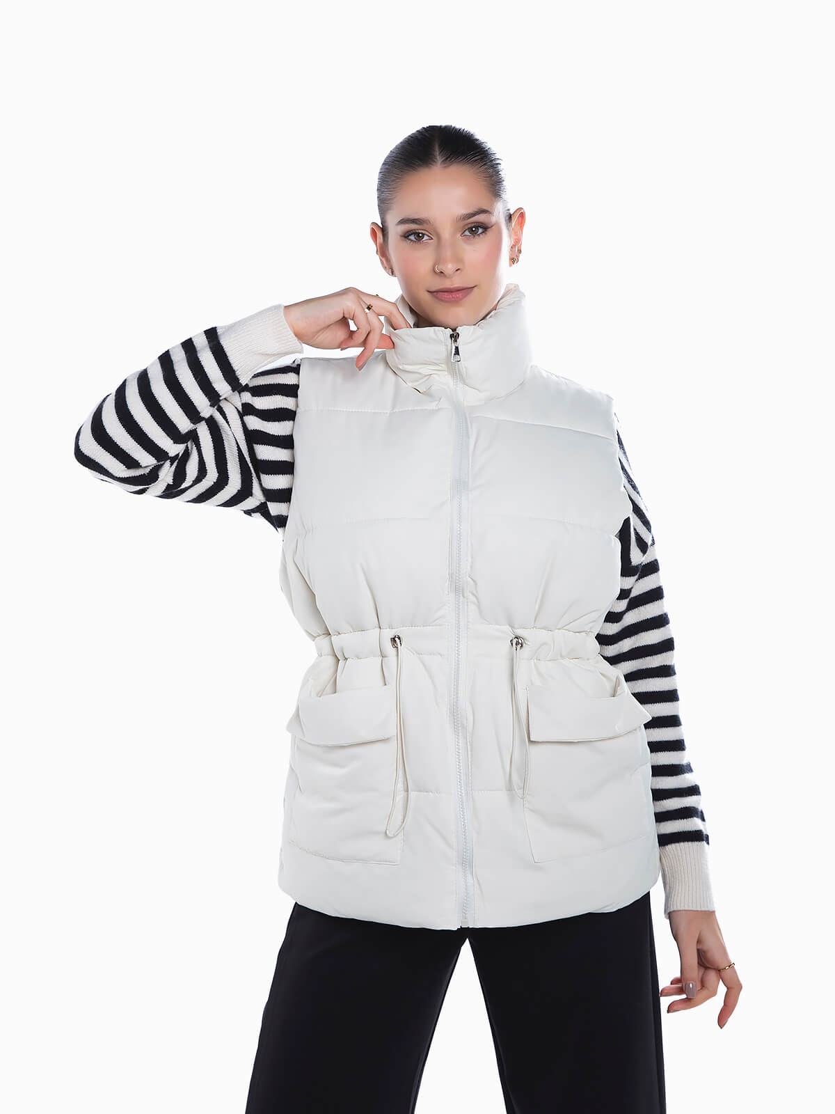 Colete acolchoado impermeável com gola alta para senhora. Colete com cordão elástico na cintura para ajustar. 2 bolsos quadrados à frente.