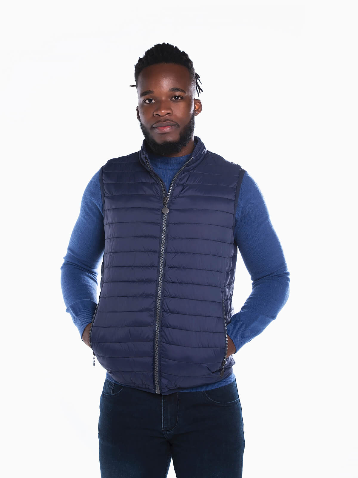 Colete acolchoado leve para homem. Colete impermeável gola alta com dois bolsos. Aperto frontal de fecho zíper.
