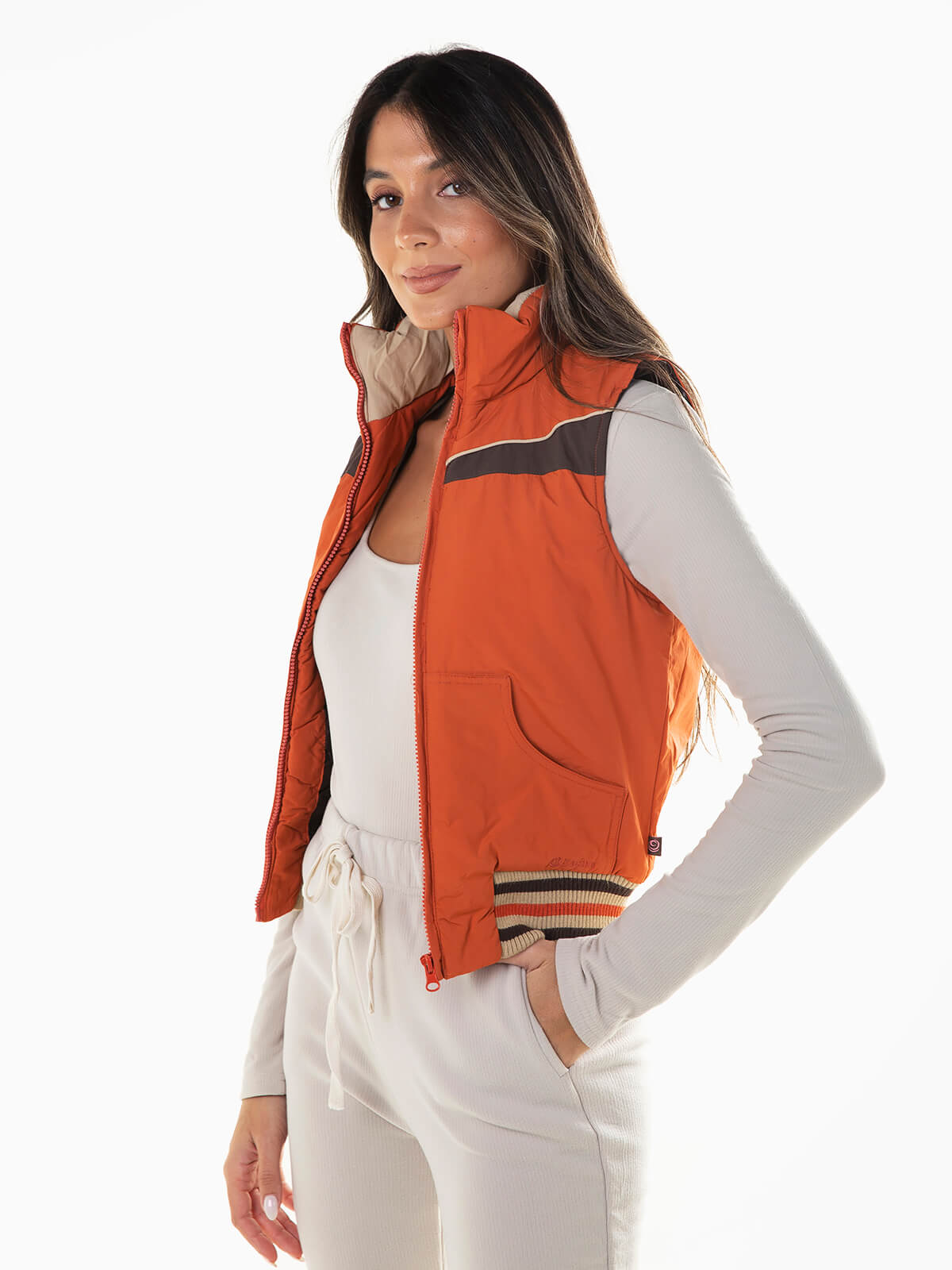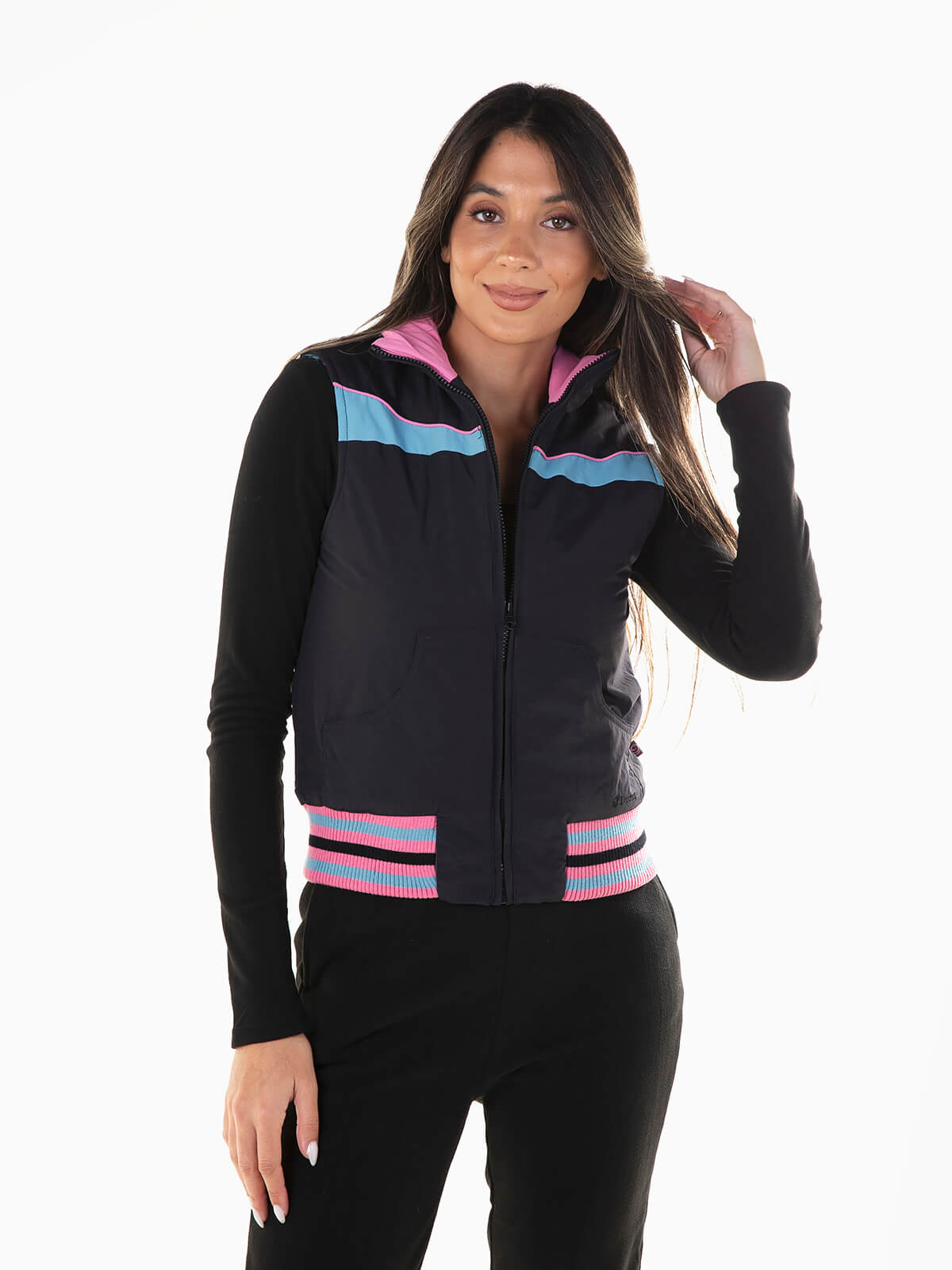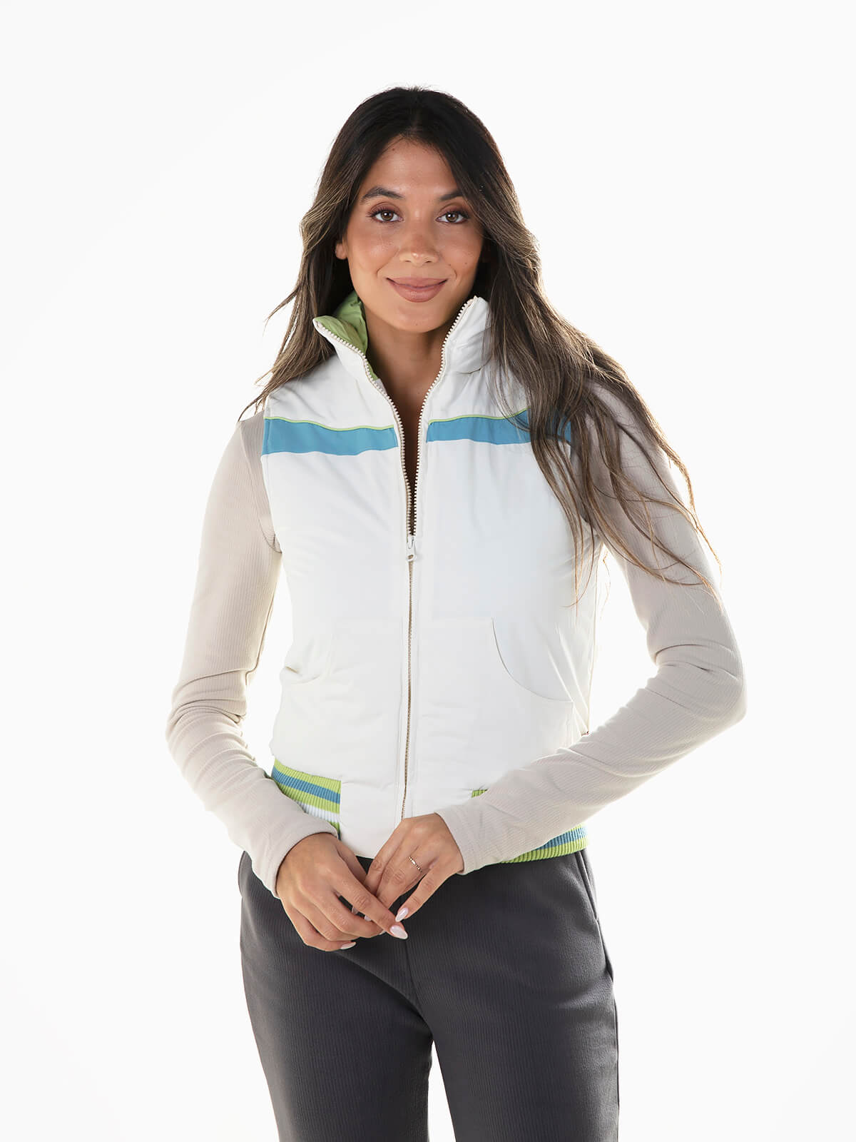 Colete acolchoado leve com gola alta para senhora. Colete com proteção para chuva ligeira e bolso canguru. Color block e base malha canelada elástica. Aperto de fecho zíper.