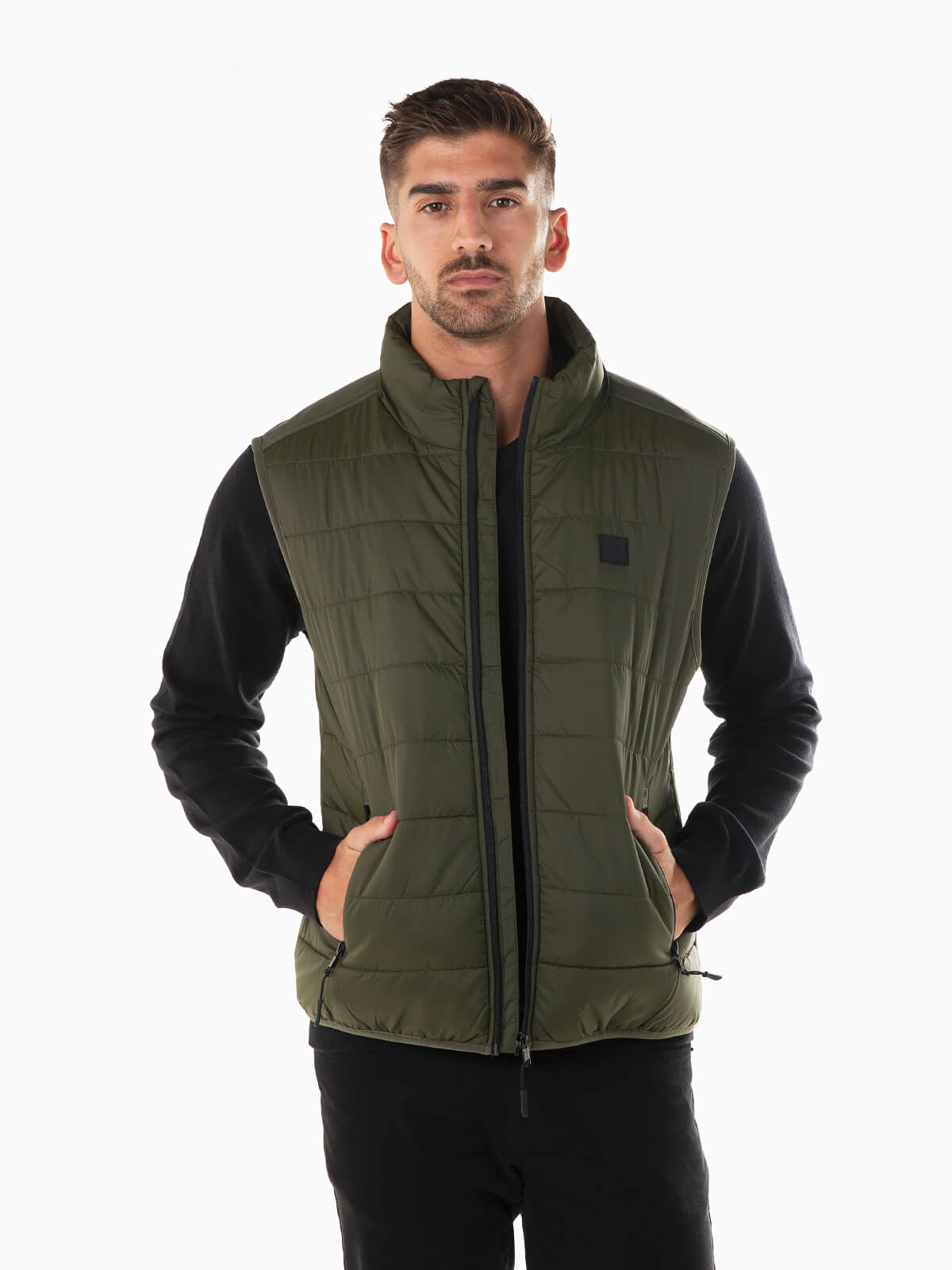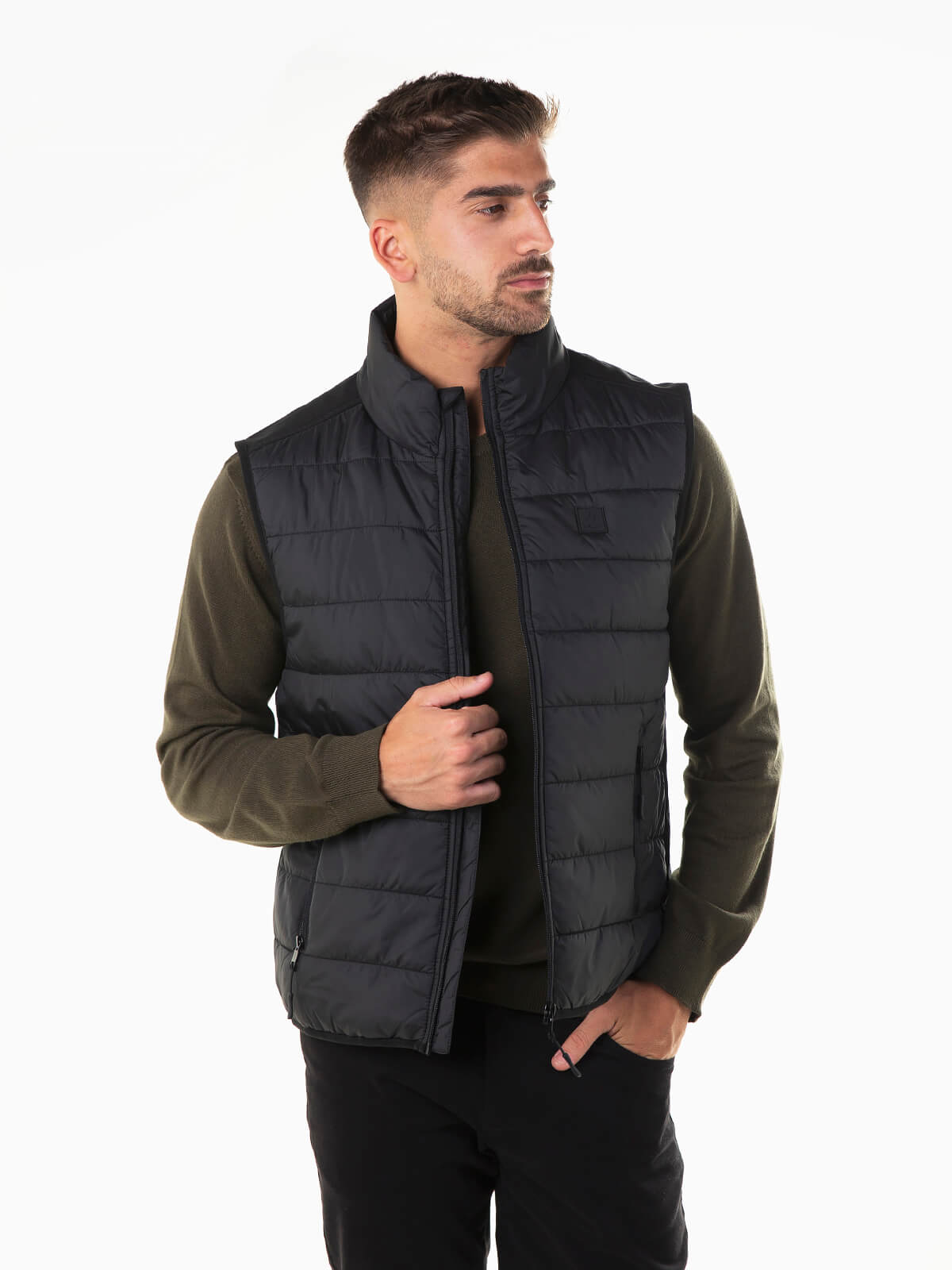 Colete acolchoado leve para homem com gola subida. Colete com interior polar e bolso lateral. 2 bolsos. Aperto frontal de fecho zíper.