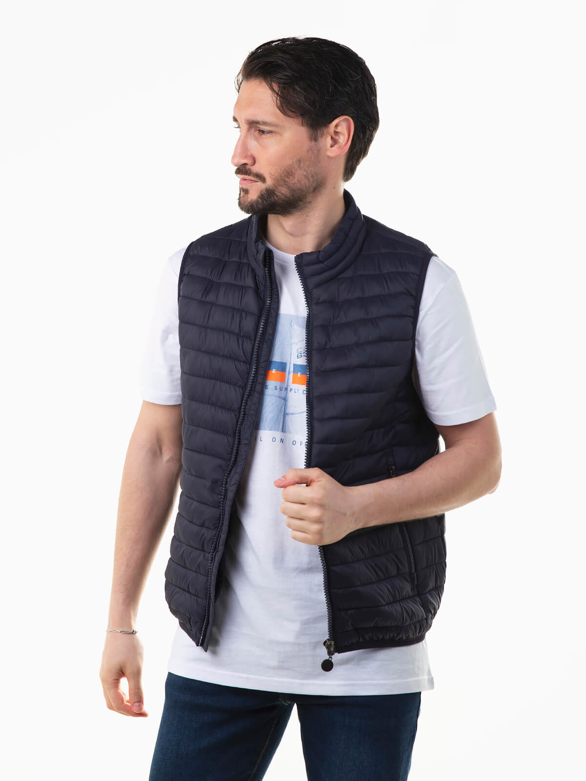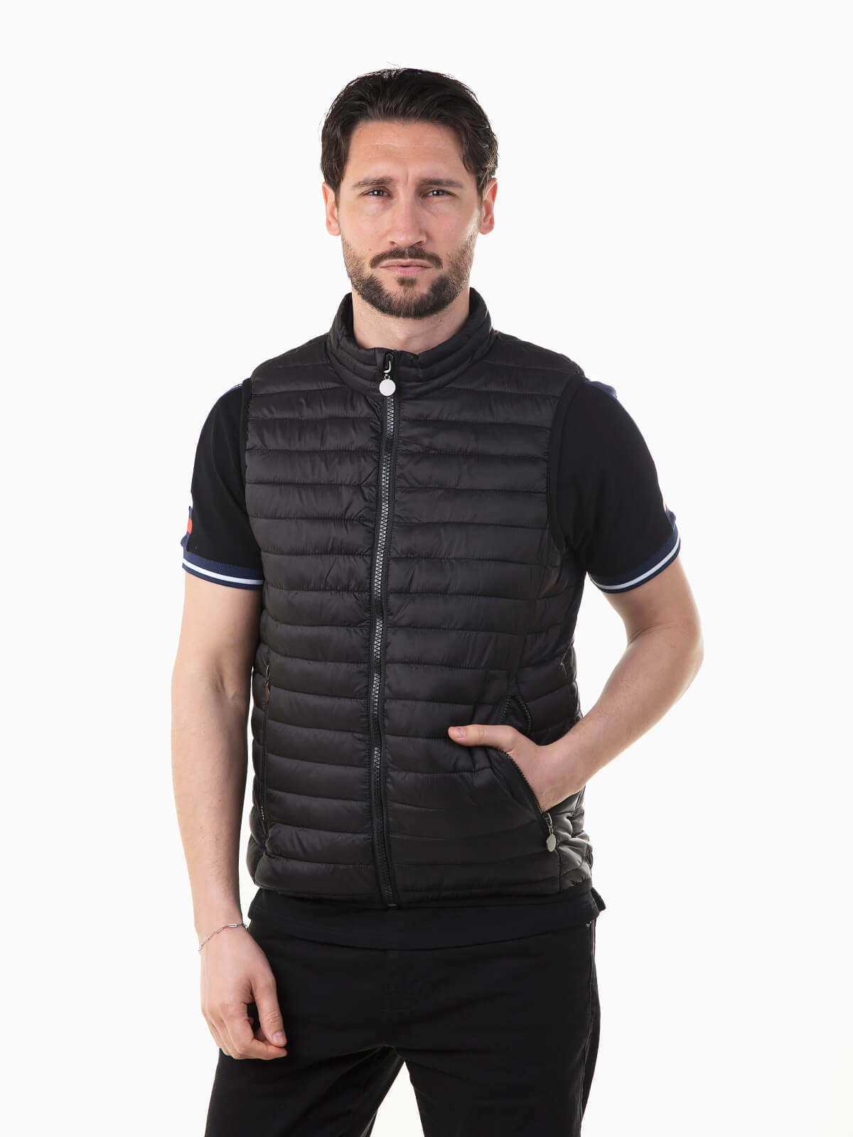 Colete acolchoado leve com proteção para chuva ligeira. Colete para homem com gola subida e 2 bolsos laterais. Aperto de fecho zíper.
