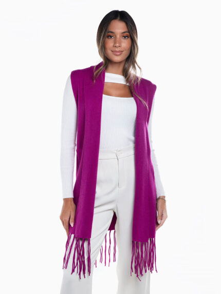 Colete acolchoado preto com efeito pele para senhora. Colete manga cava com cinto no mesmo tecido para ajustar. 2 bolsos. Interior forrado. Gola de abas. Aperto cruzado de botões pressão.