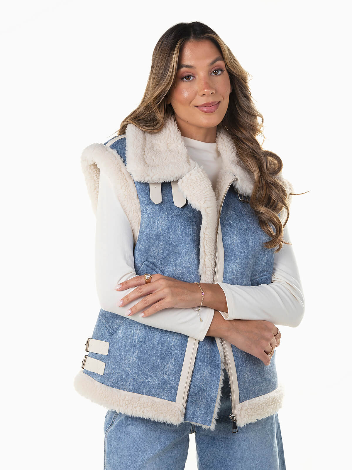 Colete azul efeito camurça com pelo no interior e extremidades. Colete dupla face com fivelas para ajustar e 2 bolsos. Gola alta. Aperto de fecho zíper.