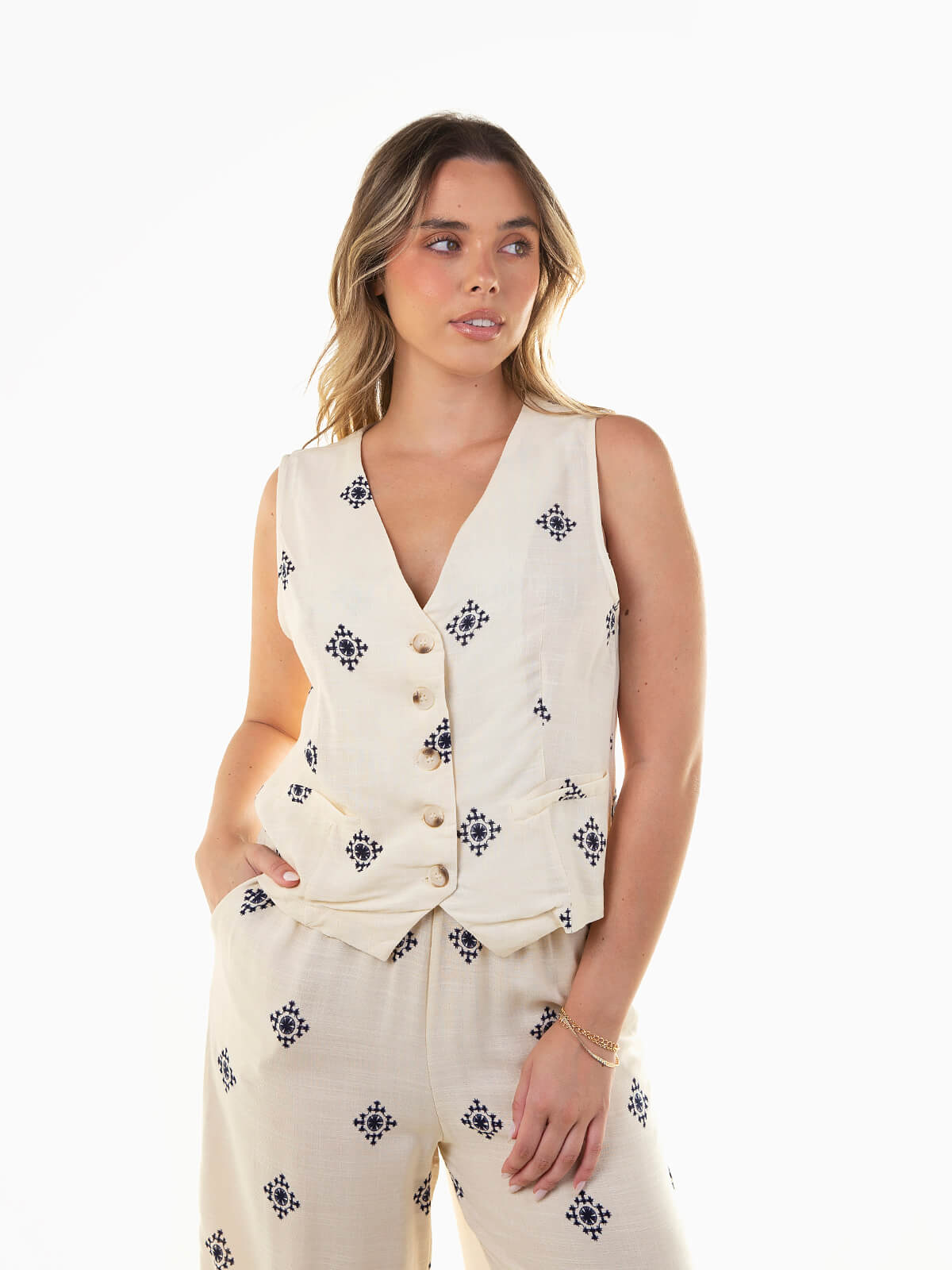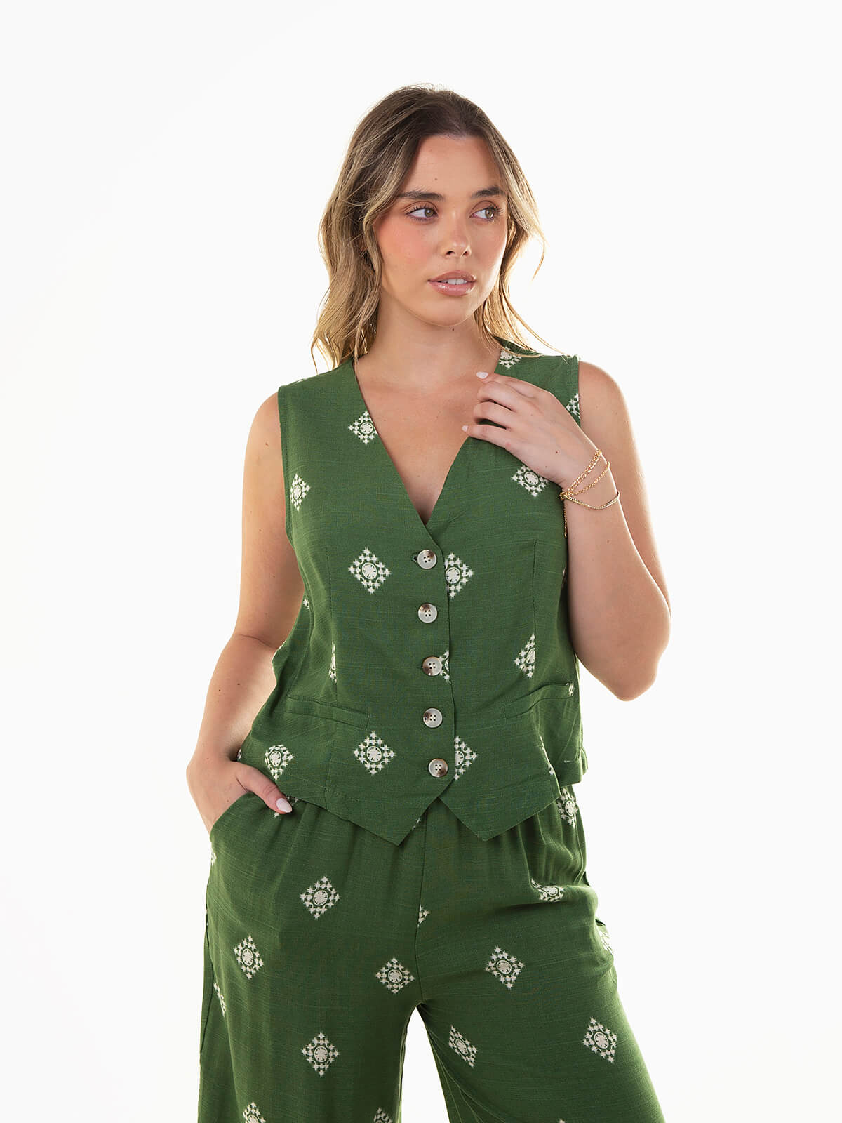 Colete leve com estampado étnico, ideal para combinar com as calças fluídas da mesma coleção. Modelo com decote em V e aperto de botões. Um conjunto prático, moderno e cheio de personalidade para dias descontraídos com estilo.