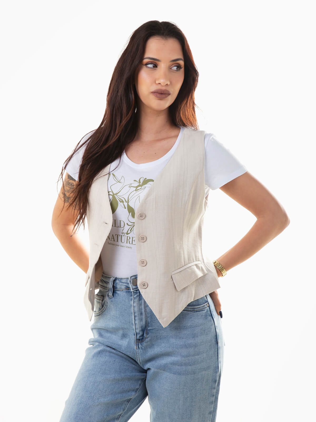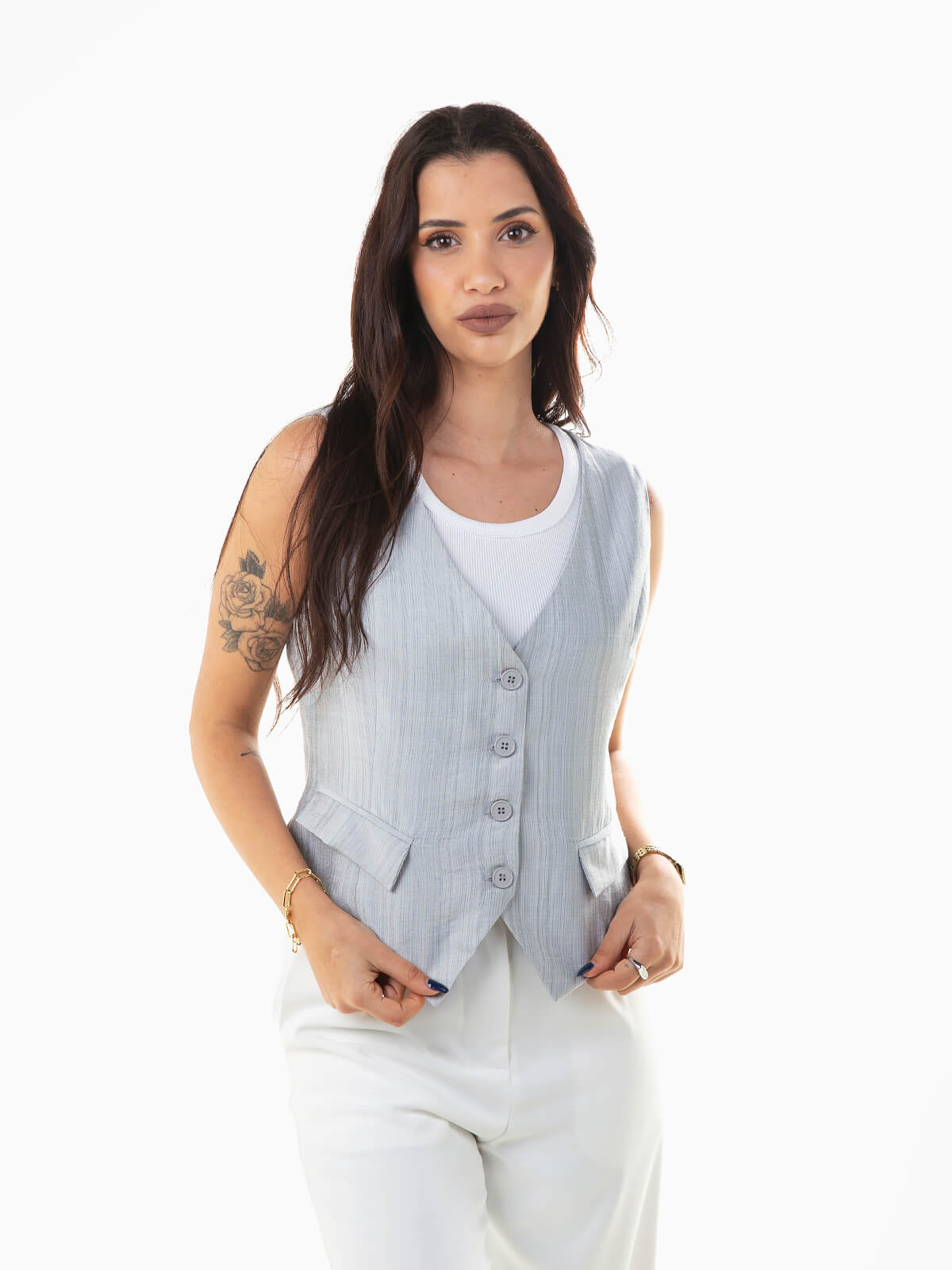 Colete com riscas de giz finas para senhora. Colete alfaiataria com interior forrado e decote em V. Palas decorativas e aperto frontal de botões.