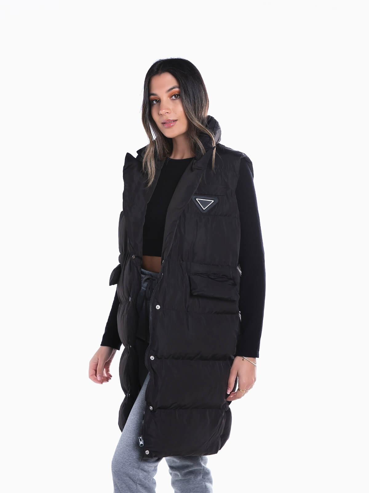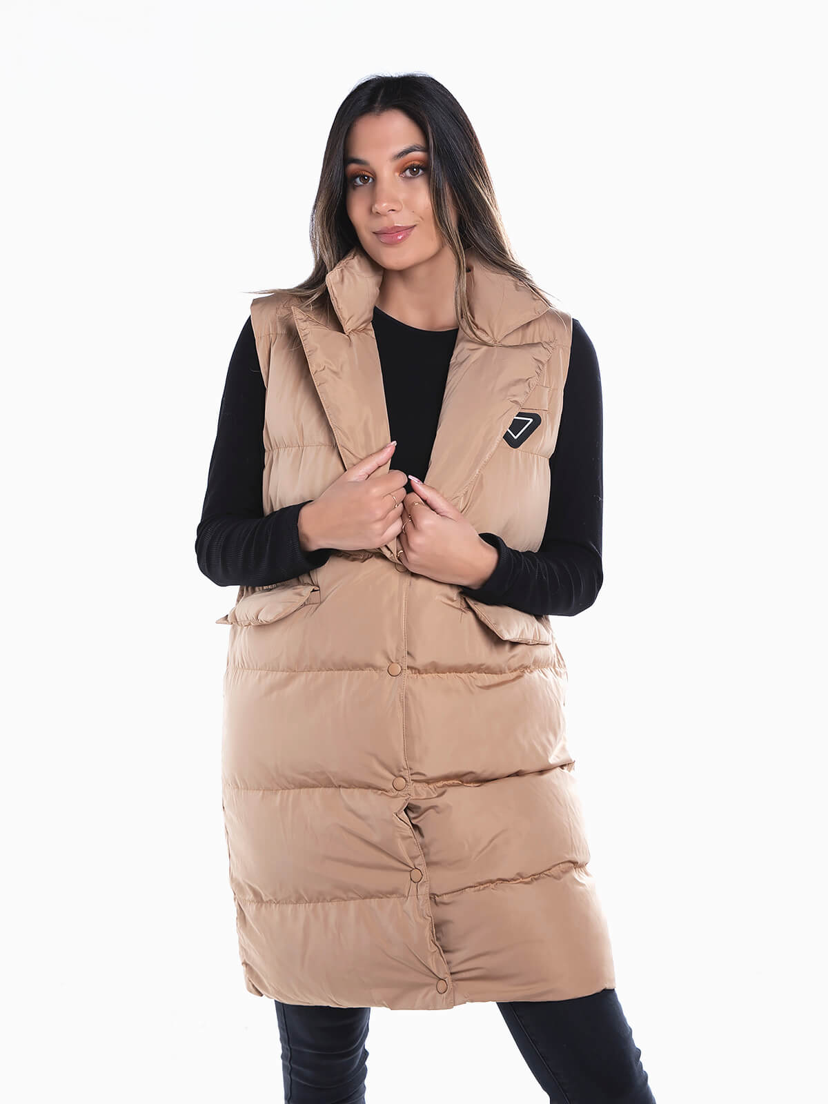 Colete comprido acolchoado para senhora. Colete impermeável com gola subida e lapelas. 2 bolsos. Aperto de fecho zíper e botões de pressão.