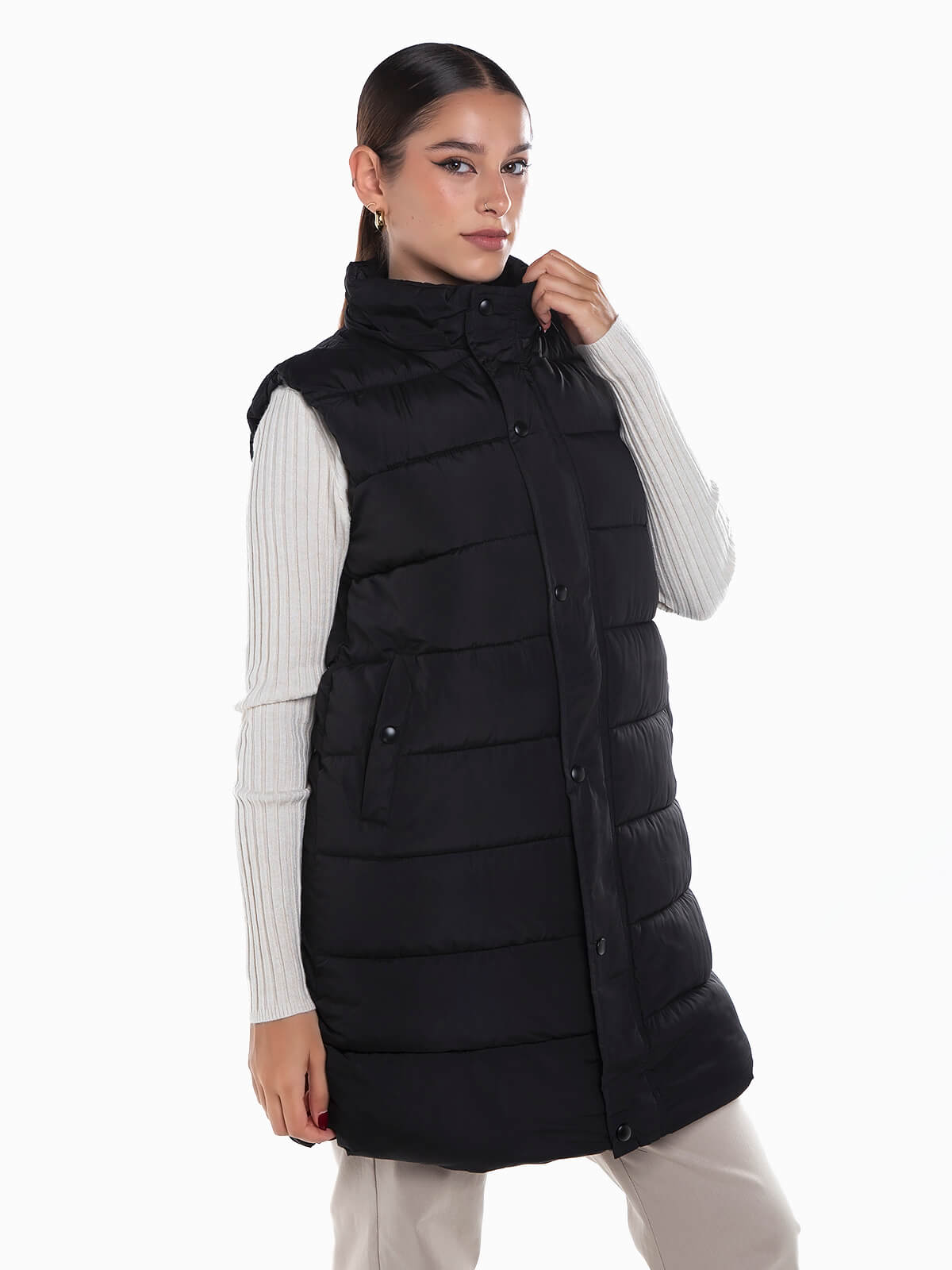 Colete acolchoado impermeável com capuz removível. Colete comprido para senhora com 2 bolsos. Gola subida. Aperto de fecho éclair e botões de pressão.