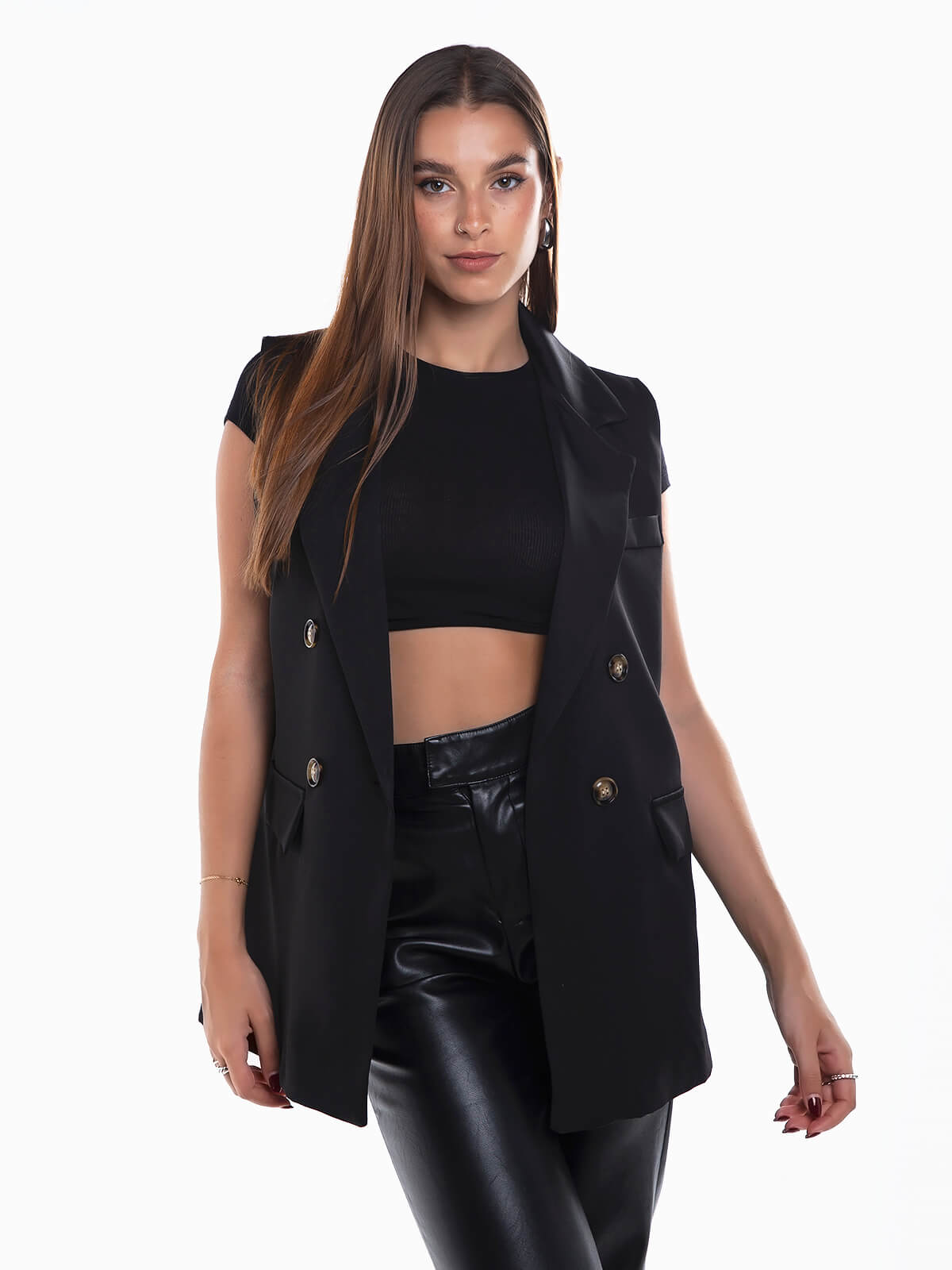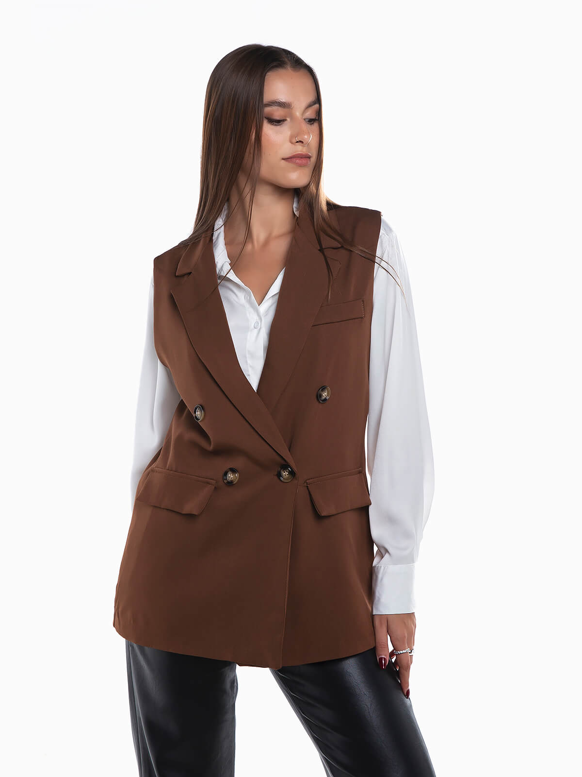 Colete comprido com aperto cruzado de botões. Colete smoking com gola abas e lapelas. Manga cava. Palas decorativas. Interior forrado.