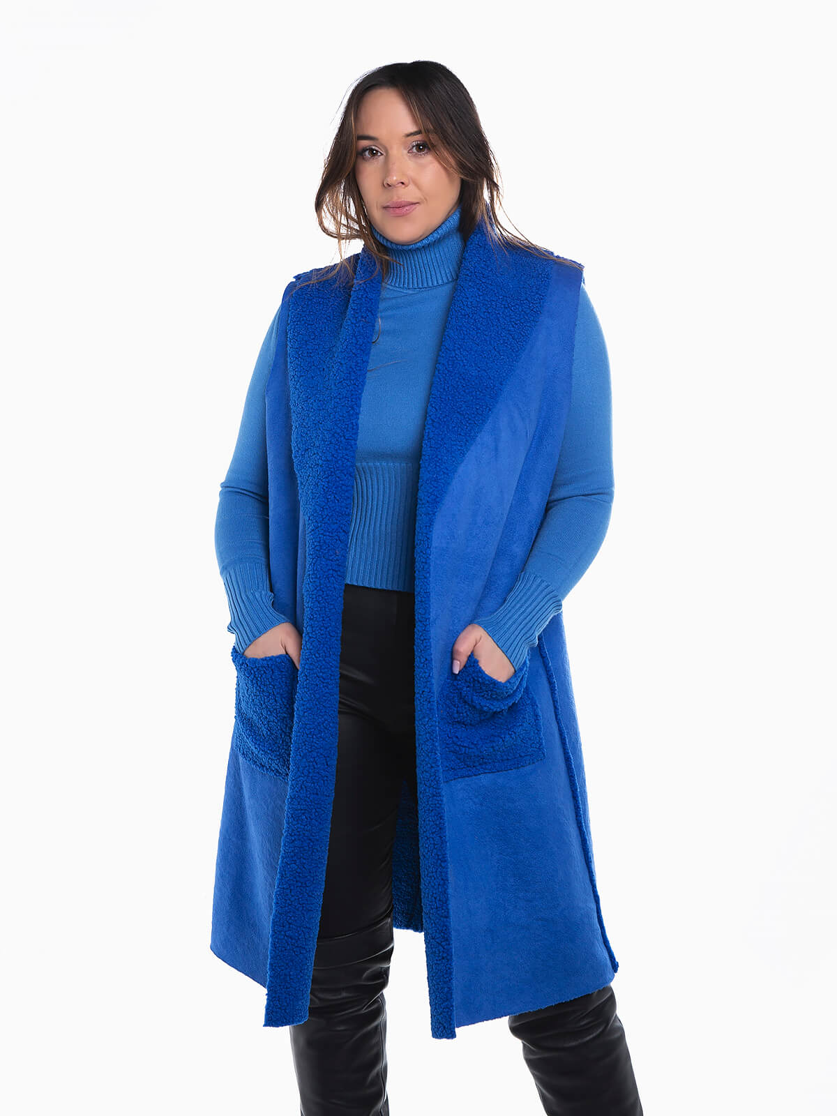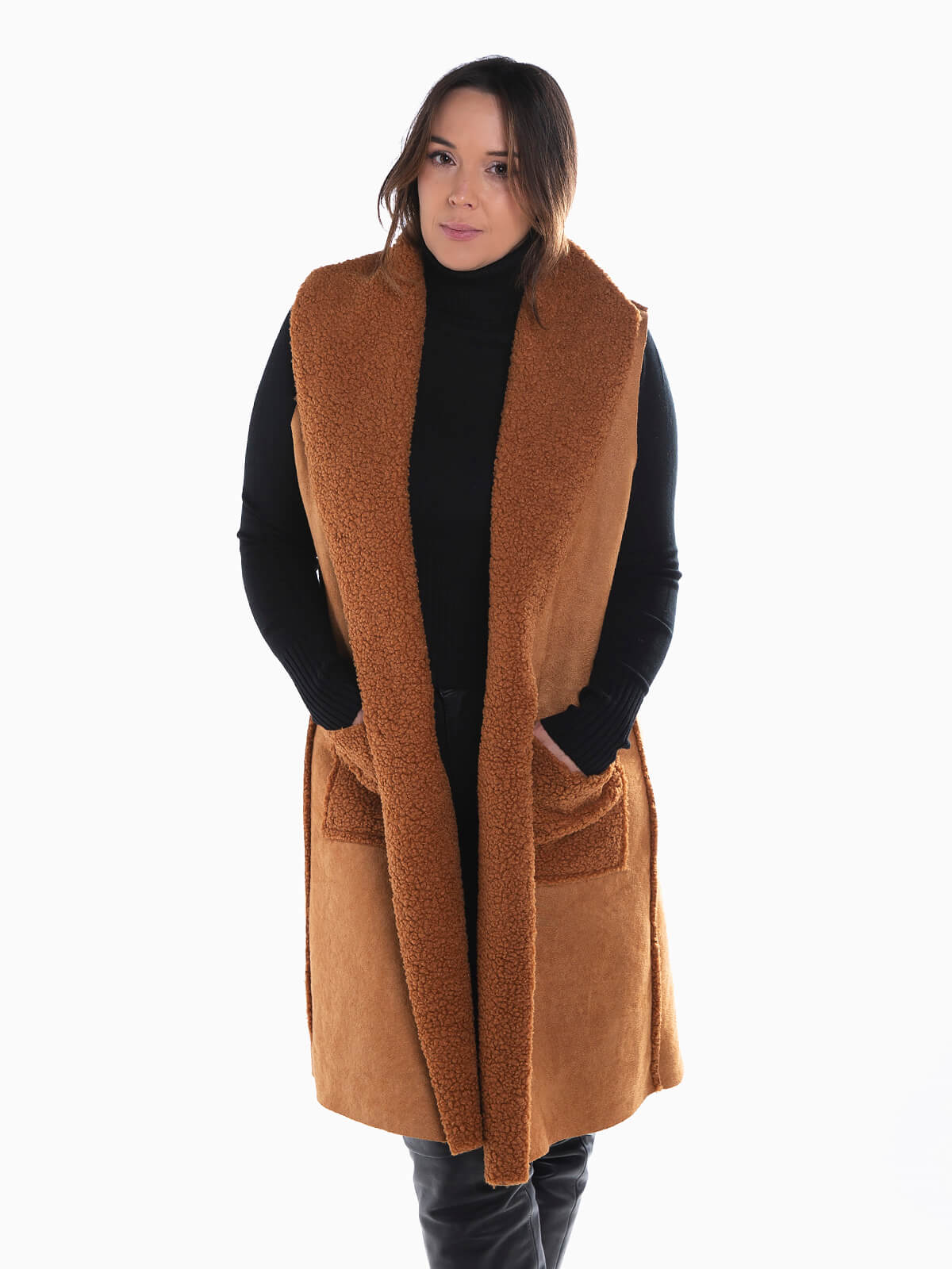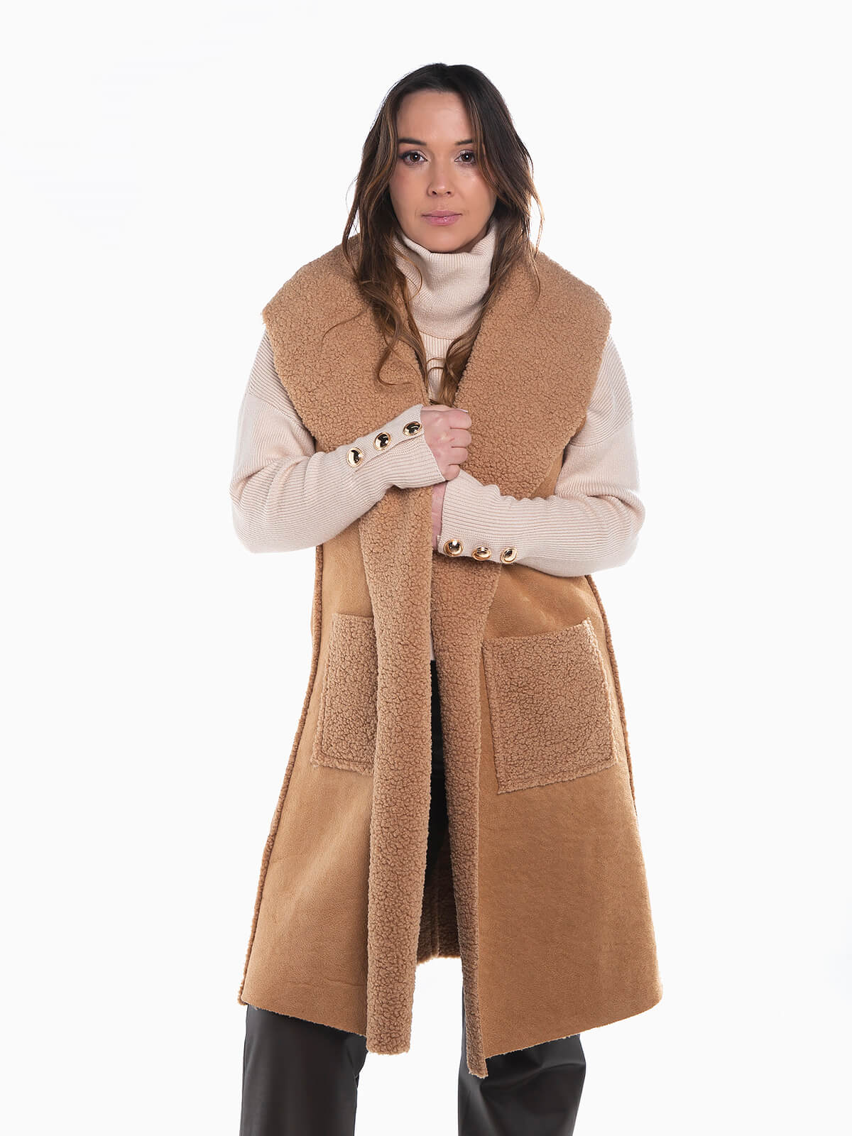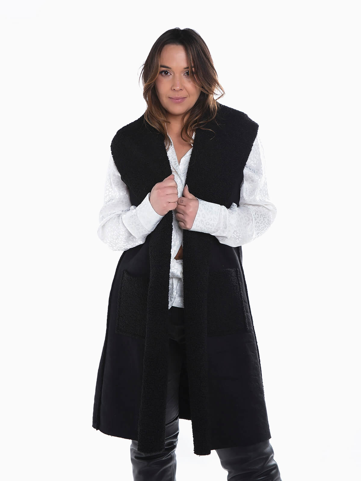 Colete comprido em camurça combinado em tecido de pelo encaracolado no interior e bolsos. Colete aberto com dois bolsos quadrados à frente. Gola de abas.