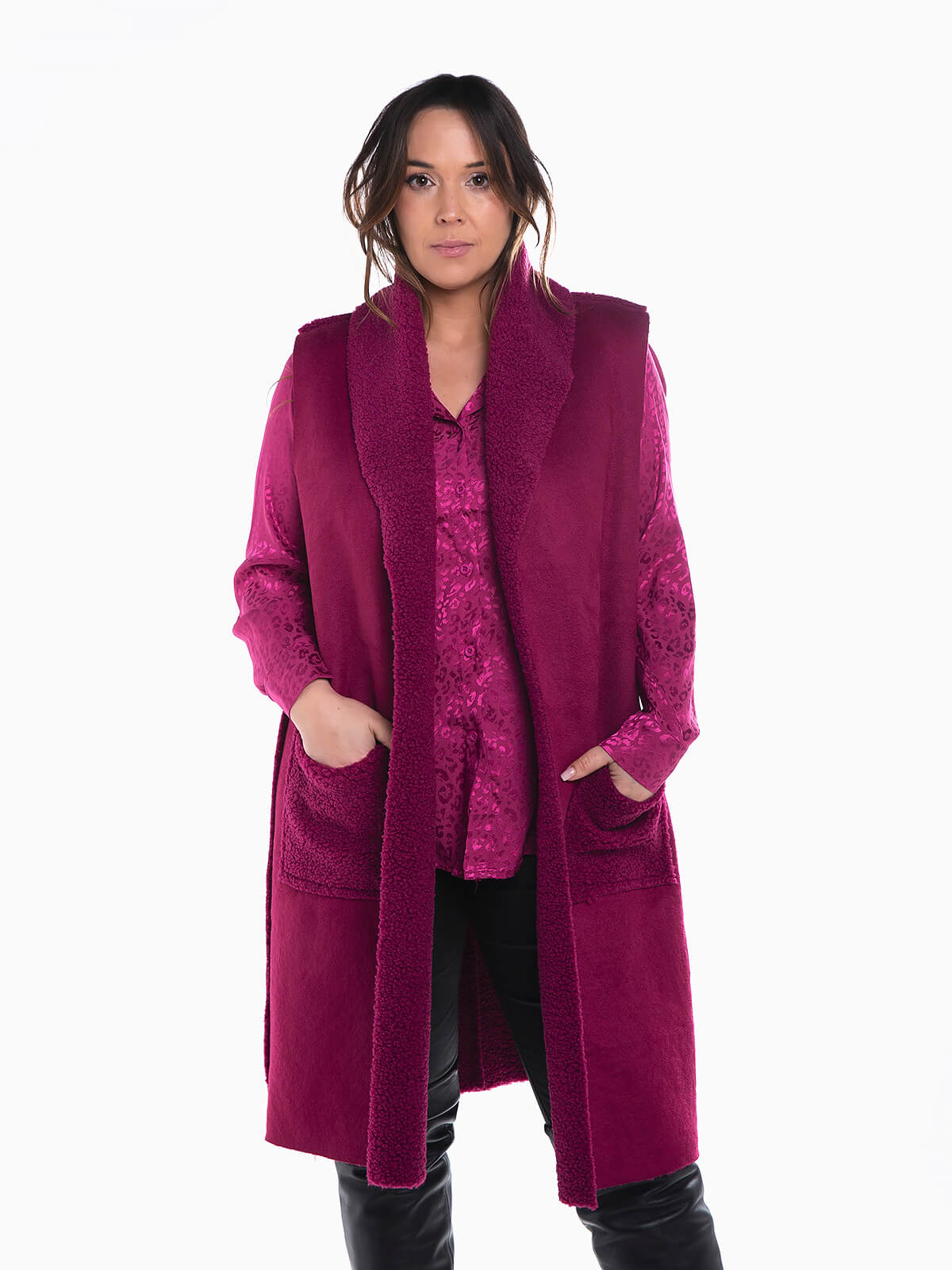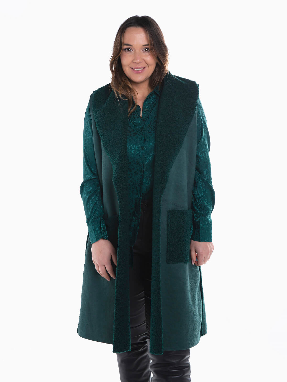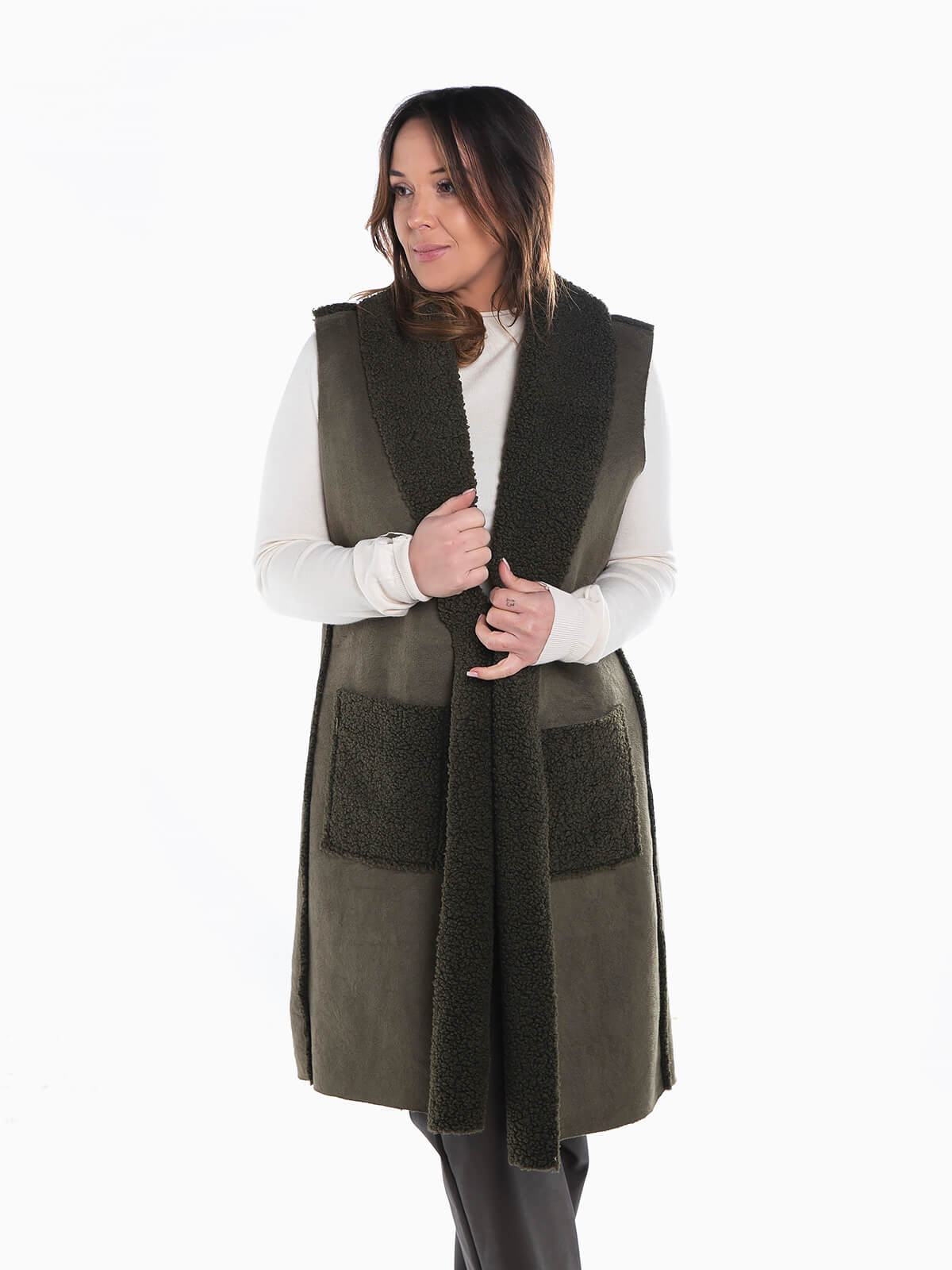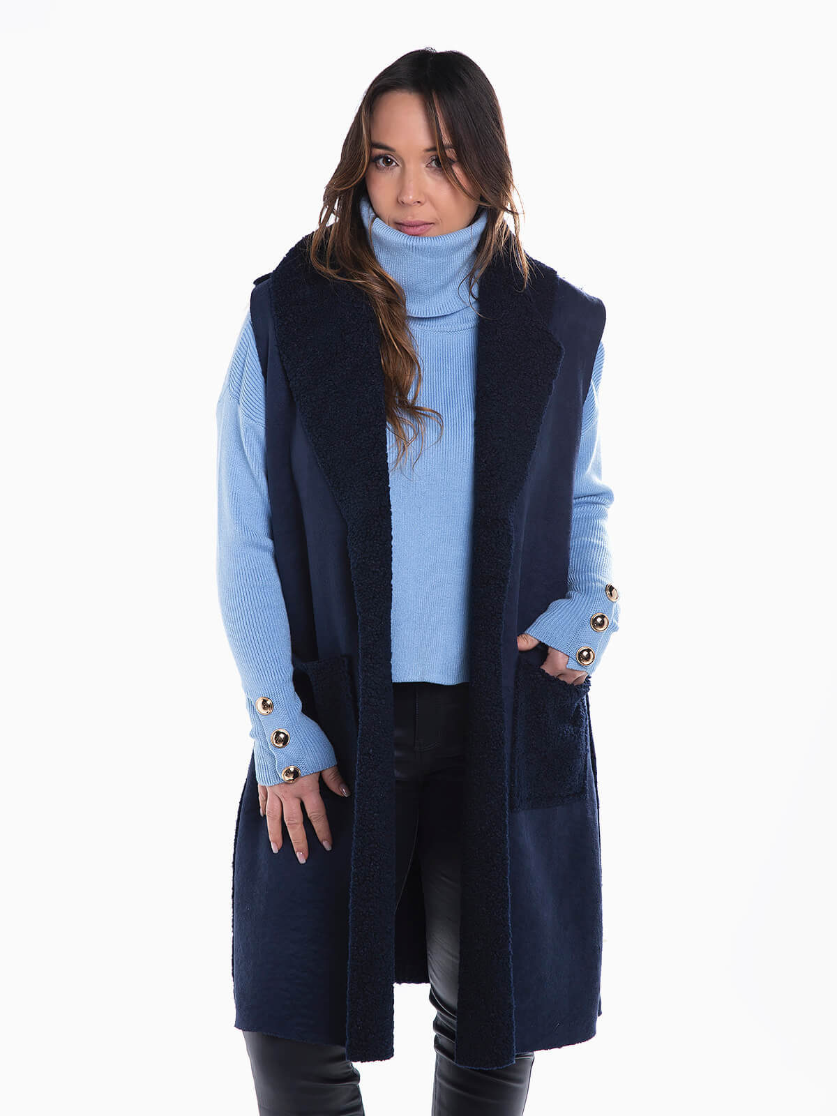 Colete comprido em camurça combinado em tecido de pelo encaracolado no interior e bolsos. Colete aberto com dois bolsos quadrados à frente. Gola de abas.