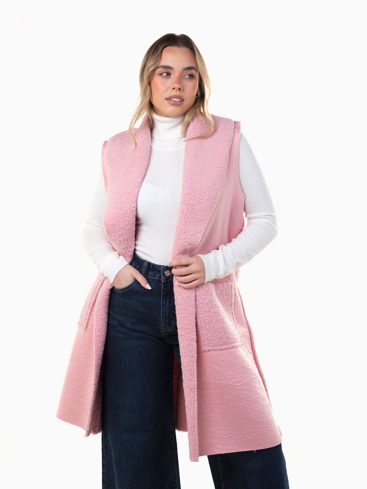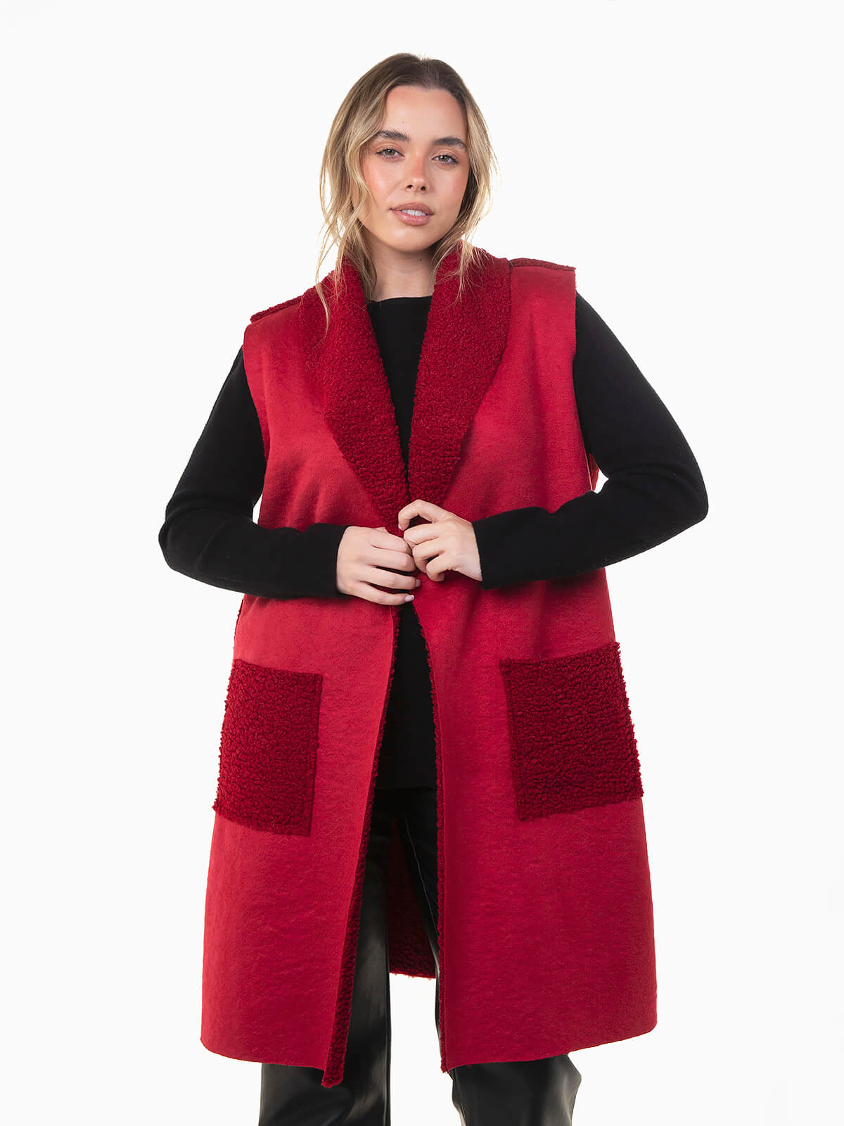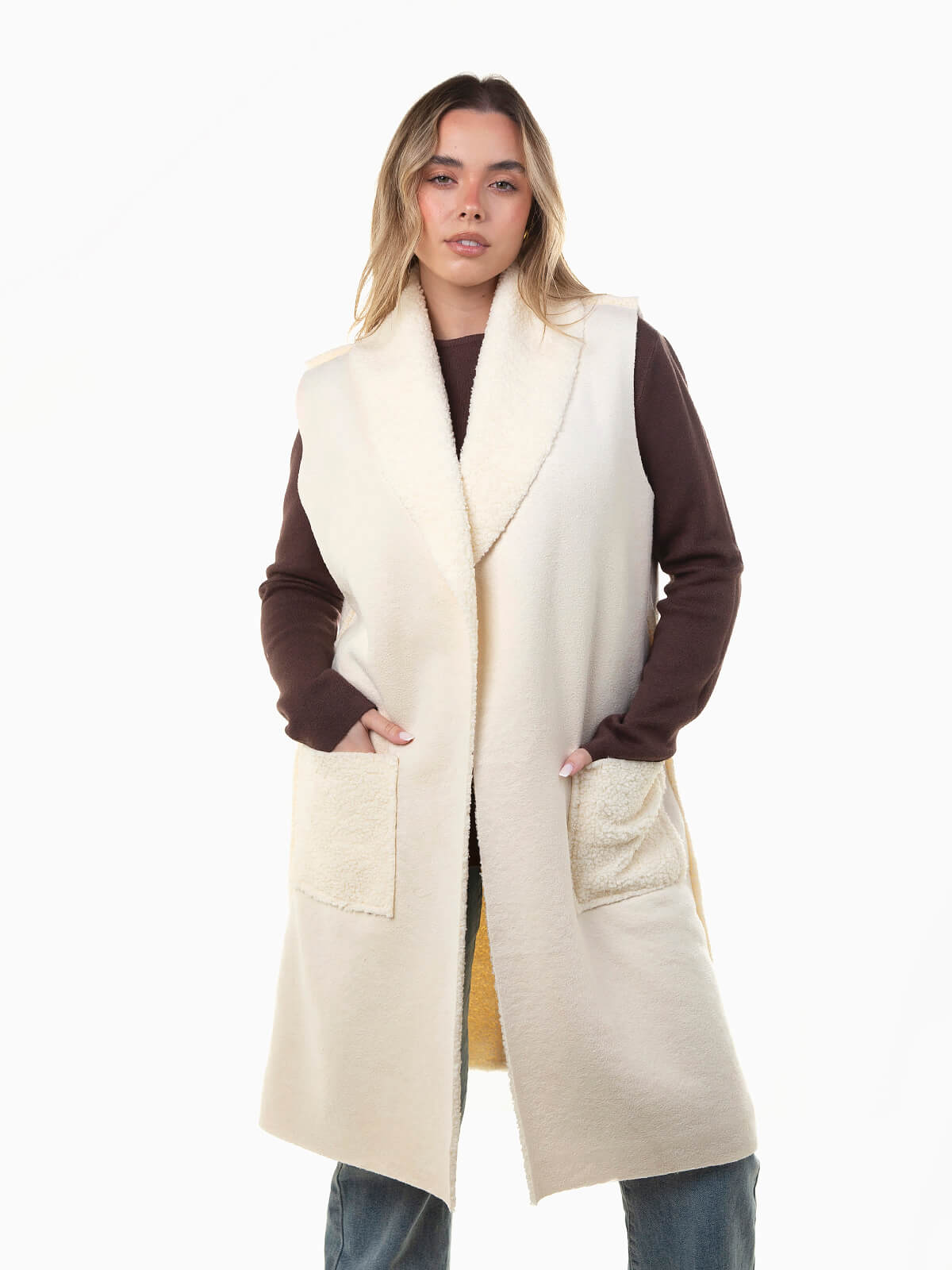 Colete comprido em camurça com interior em tecido de pelo encaracolado, que combina conforto e estilo. Modelo aberto, com gola de abas e dois bolsos quadrados à frente.