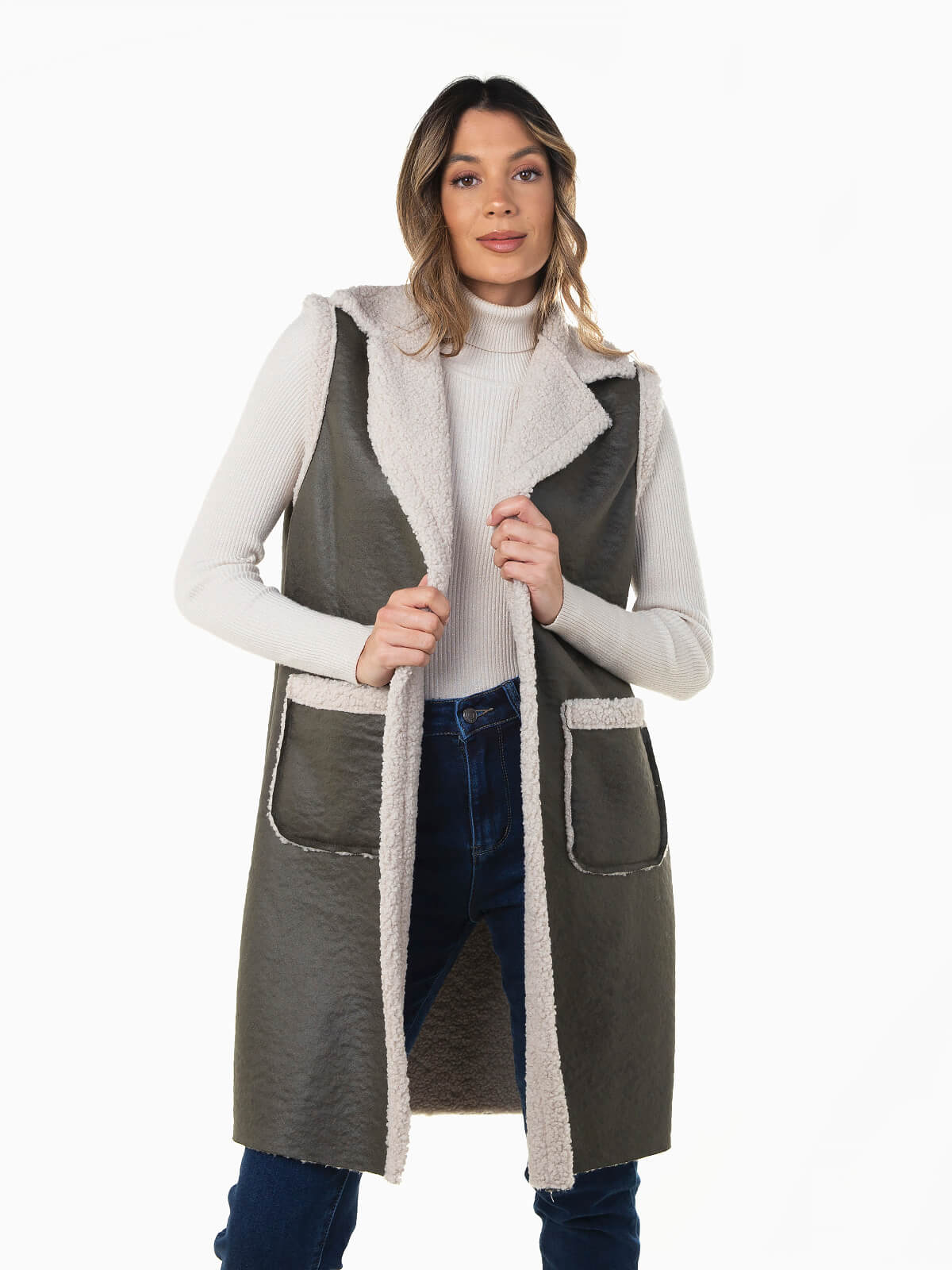 Colete comprido com gola de abas e interior em pelo encaracolado. Design aberto com 2 bolsos, confortável e perfeito para elevar looks de inverno.